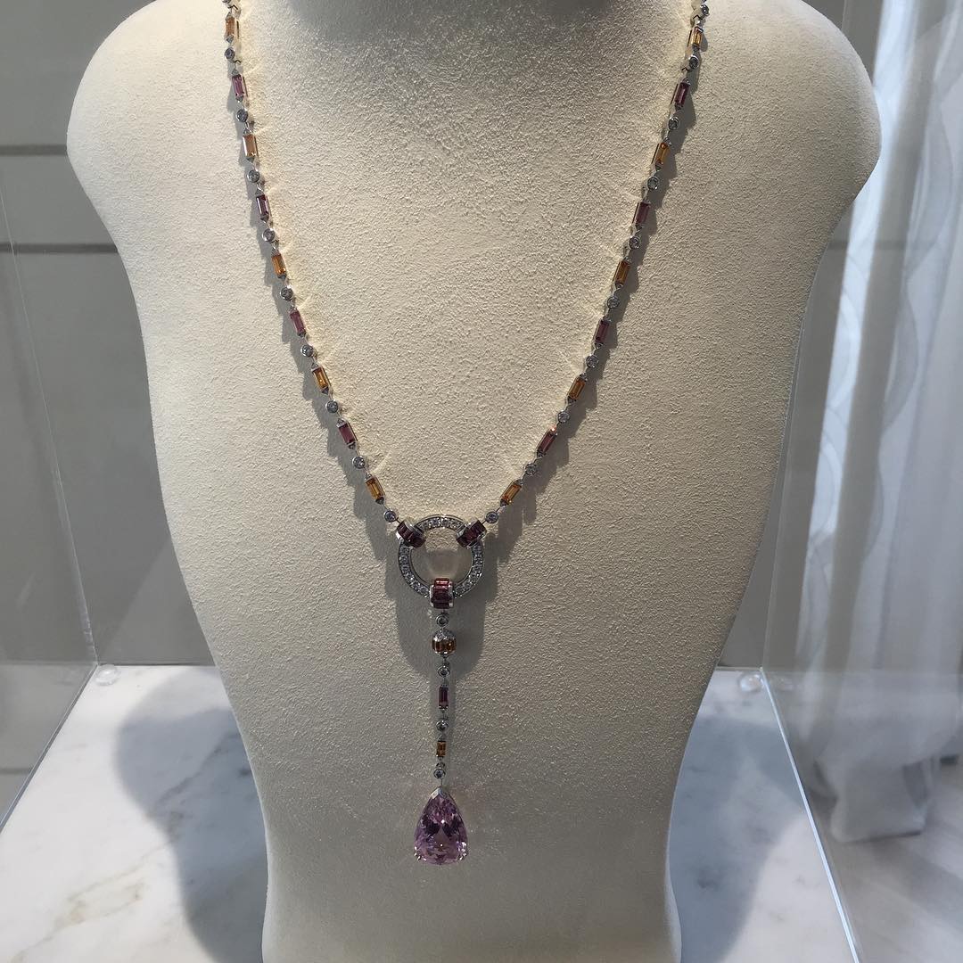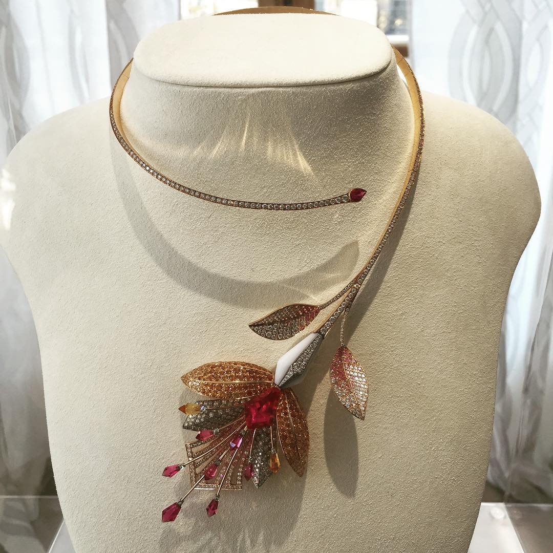 La richesse du collier Fleur de Lotus réside dans le talent du chercheur de pierres qui s’est procuré une tourmaline, des rubellites et grenats spessartites dont le dégradé de couleur imite à la perfection les pétales de lotus.