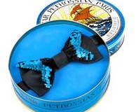Le premier modèle, appelé le Beluga, du nom de l’esturgeon offrant les précieuses perles de caviar, est un nœud à nouer traditionnel qui arbore un embout asymétrique en forme de queue de Beluga. Il est décliné dans deux satins de soie marine et noir, deux jacquards de soie à motifs pois caviar marine ou noir sur fond argenté et en deux versions bi-matières qui allient les deux armures.