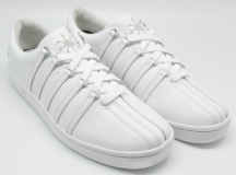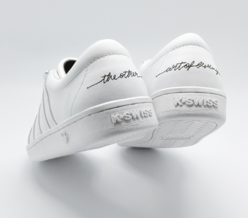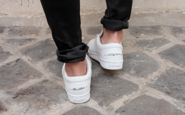 Pour parfaire cette collaboration, Sophie a choisi le modèle emblématique de K-Swiss, « The Classic », tout en cuir blanc.