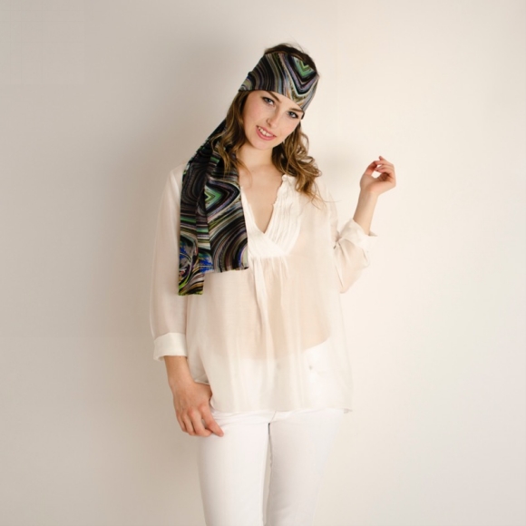 CHIC&ZEN, une longue étole, frangée offrant de multiples possibilités de drapés ou de nouages. Nouer dans les cheveux, cette étole aux fleurs de Bach anti-stress sera votre accessoire bien-être.