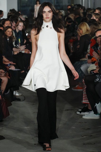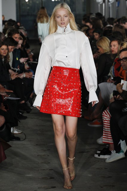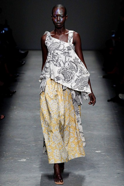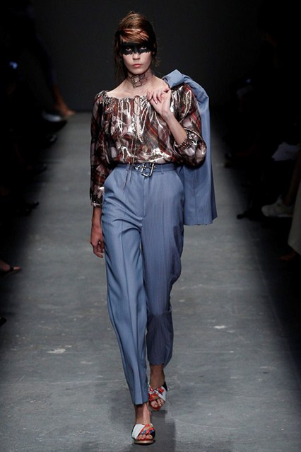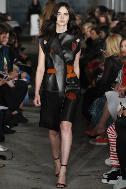 La serrure comme point d’entrée dans une collection. Plutôt logique: ainsi les jupes, haut de manches, ou vestes étaient perforés pour le défilé de Thomas Tait. Un mélange entre le look « Courrèges » et les ondes 60/70’s : du vinyle et des pièces tailorings. L’art tribal, le design industriel étaient également les thèmes fondateurs du designer pour élaborer sa collection. Travail sur les matières par des jeux de découpes et de brillance. Alors , à la hauteur du prix LVMH ?