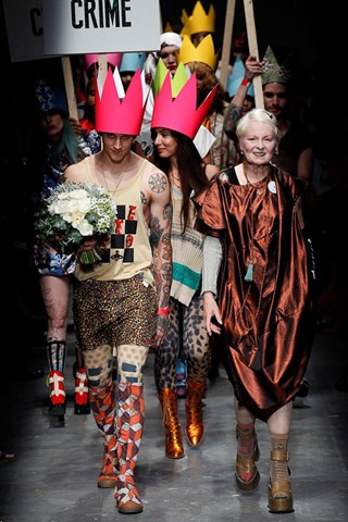 Toujours aussi punk dans l’âme, et on ne voudrait pas qu’il en soit autrement. Vivienne Westwood profite de son défilé red Label, pour envahir la semaine de la mode d’un flot de manifestants et de revendications. Couronne en papier colorée pour dire non à l’austérité et appeler à une révolution dans la politique environnementale. En ce qui concerne les pièces de cette gamme : toujours animés par une théâtralité (mais moins que pour la ligne principale de la créatrice) . Imprimés floraux, épaules dénudées, jupes et pantalon 3/4. Une collection assez conventionnelle pour cette femme hors-normes. Une désobéissance mesurée!
