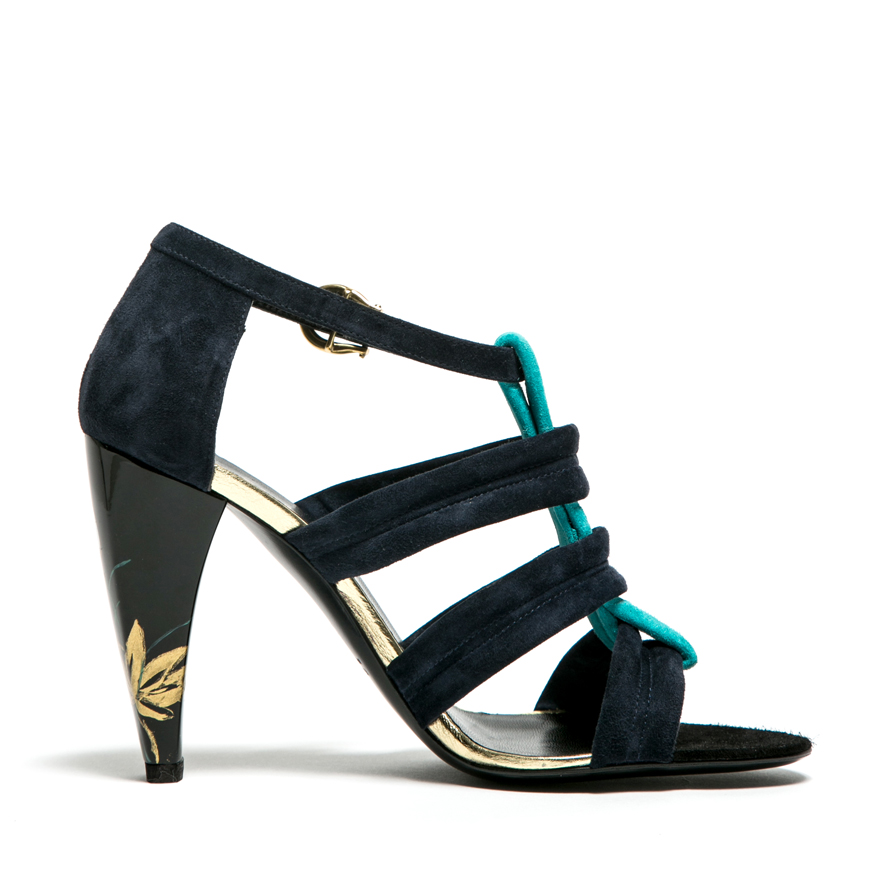 Michel Vivien nous invite au voyage avec ses sandales aux teintes de lagunes. Le soyeux du velour, les fleurs lascives et laquées,