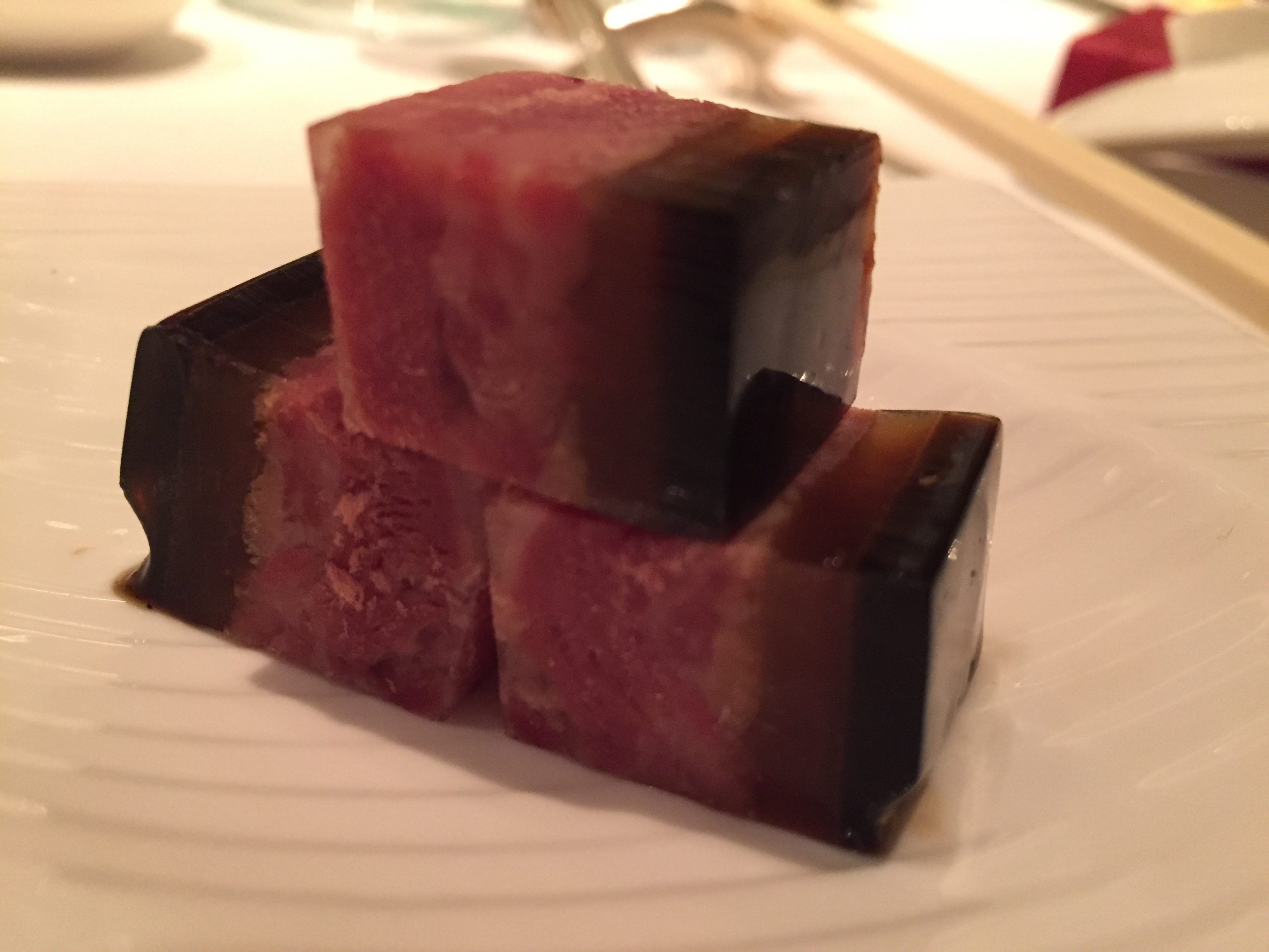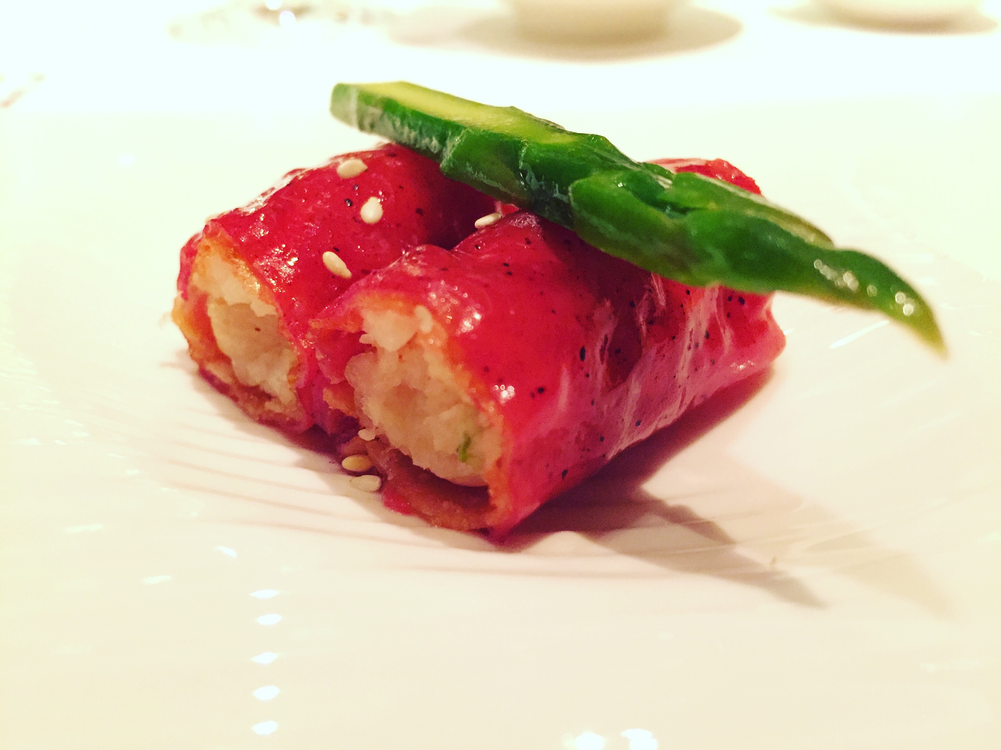 Crêpes de riz rouge aux crevettes, rouleau de mangue et de radis fermenté, pied de porc en gelée et vinaigre noir