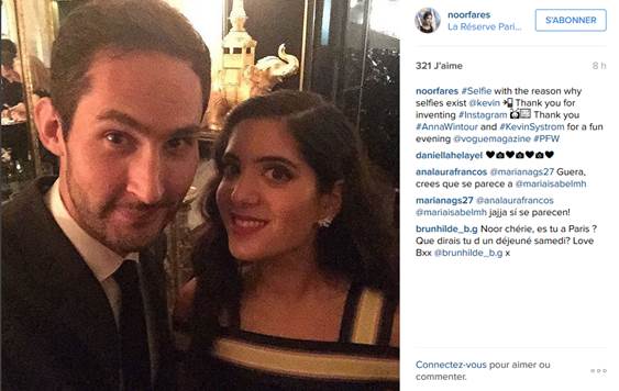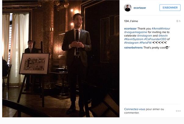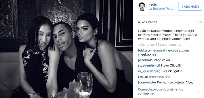 Pour célébrer les liens qui unissent Instagram et le monde de la mode, Anna Wintour a organisé un dîner pendant la fashion week parisienne réunissant de nombreux designers parisiens, Kevin Systrom (co-fondateur d’Instagram) et Eva Chen (Directrice Monde de la Mode chez Instagram).