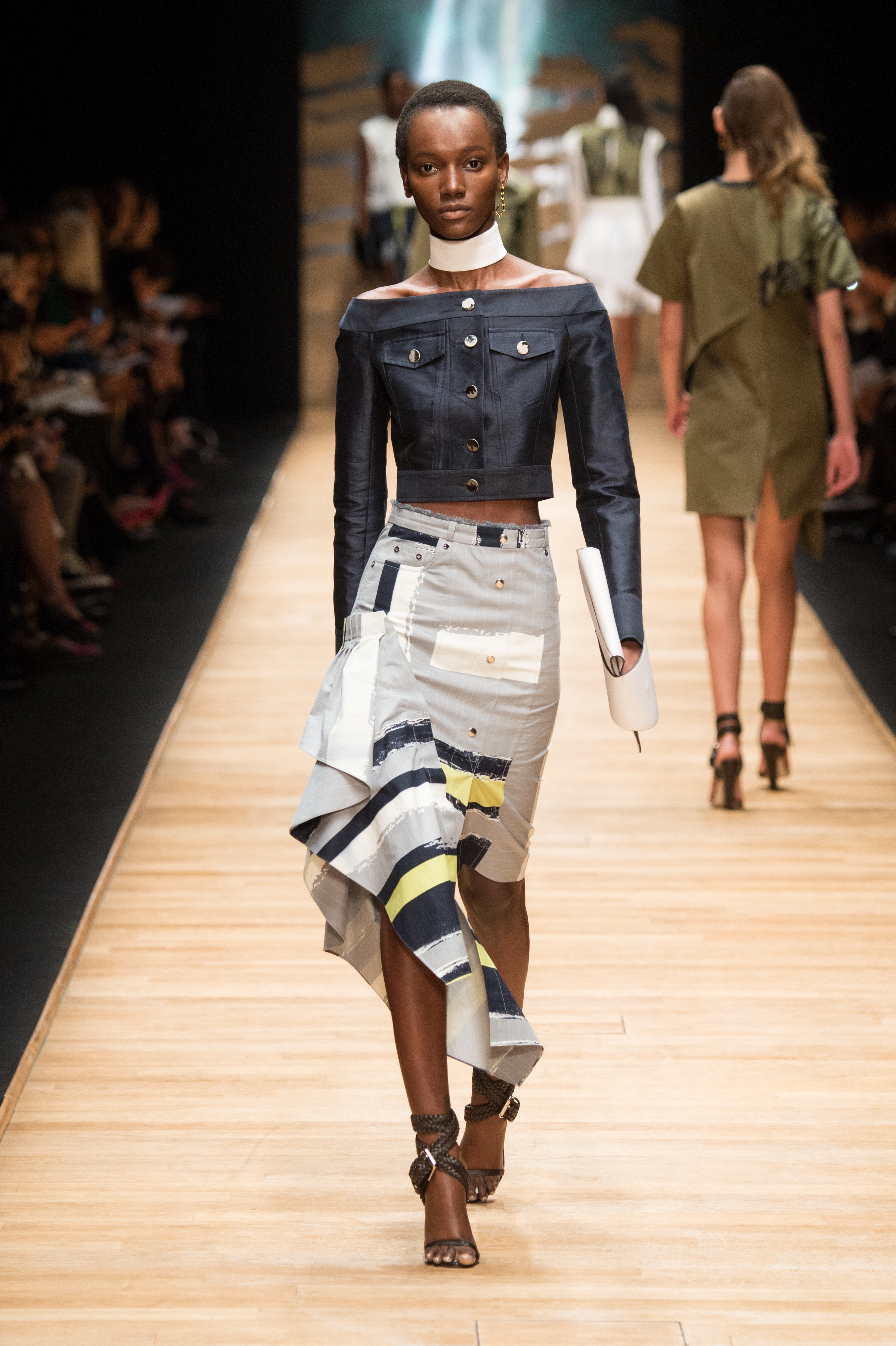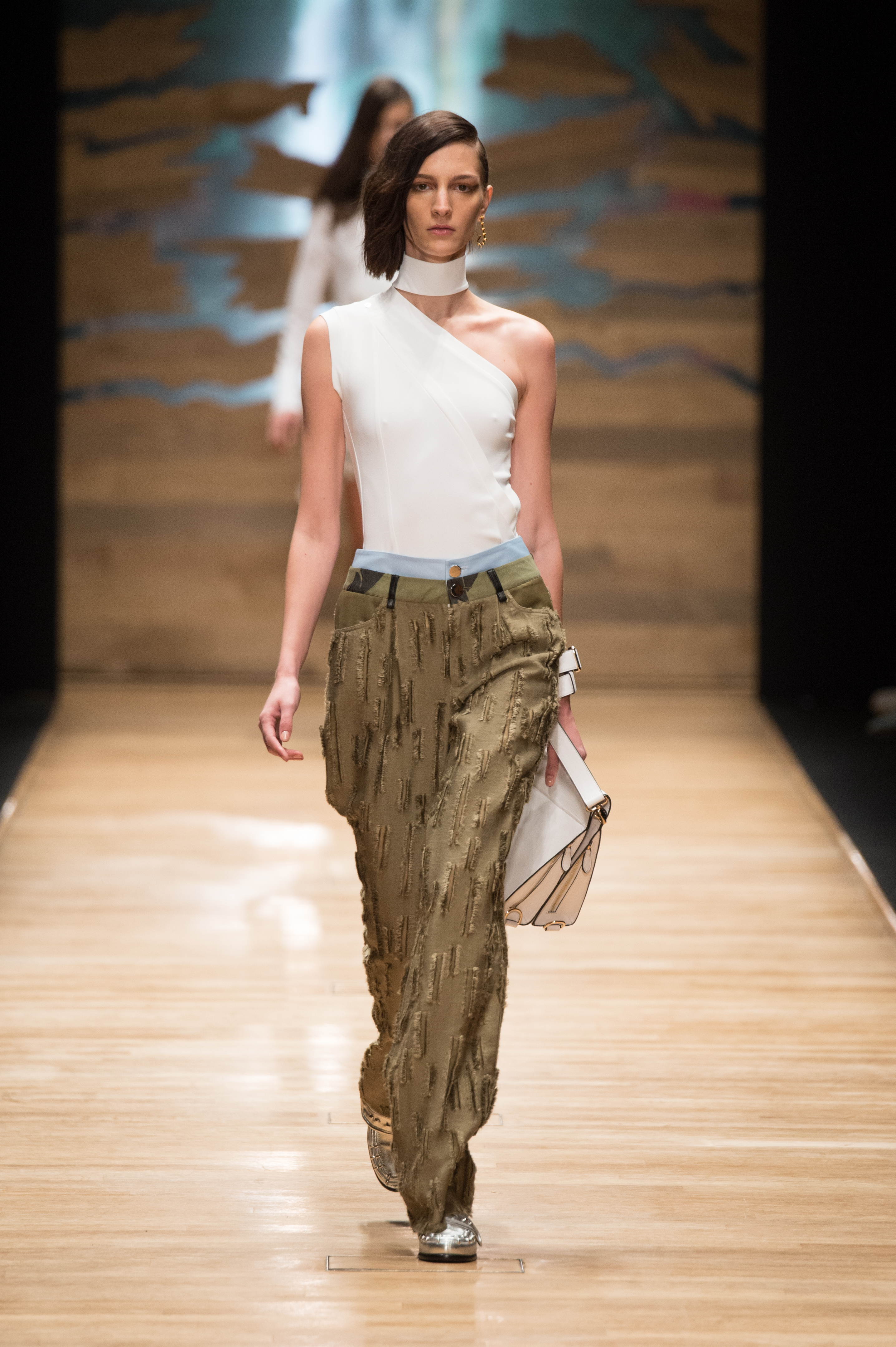 Cette pensée découle également sur les accessoires – un sac qui s’enroule autour du poignet, une boucle d’oreille unique réalisée par Moutton Collet et des chaussures plates — : eux aussi accompagnent un quotidien actif mais raffiné, où chaque pièce s’ajuste à toute heure de la journée.