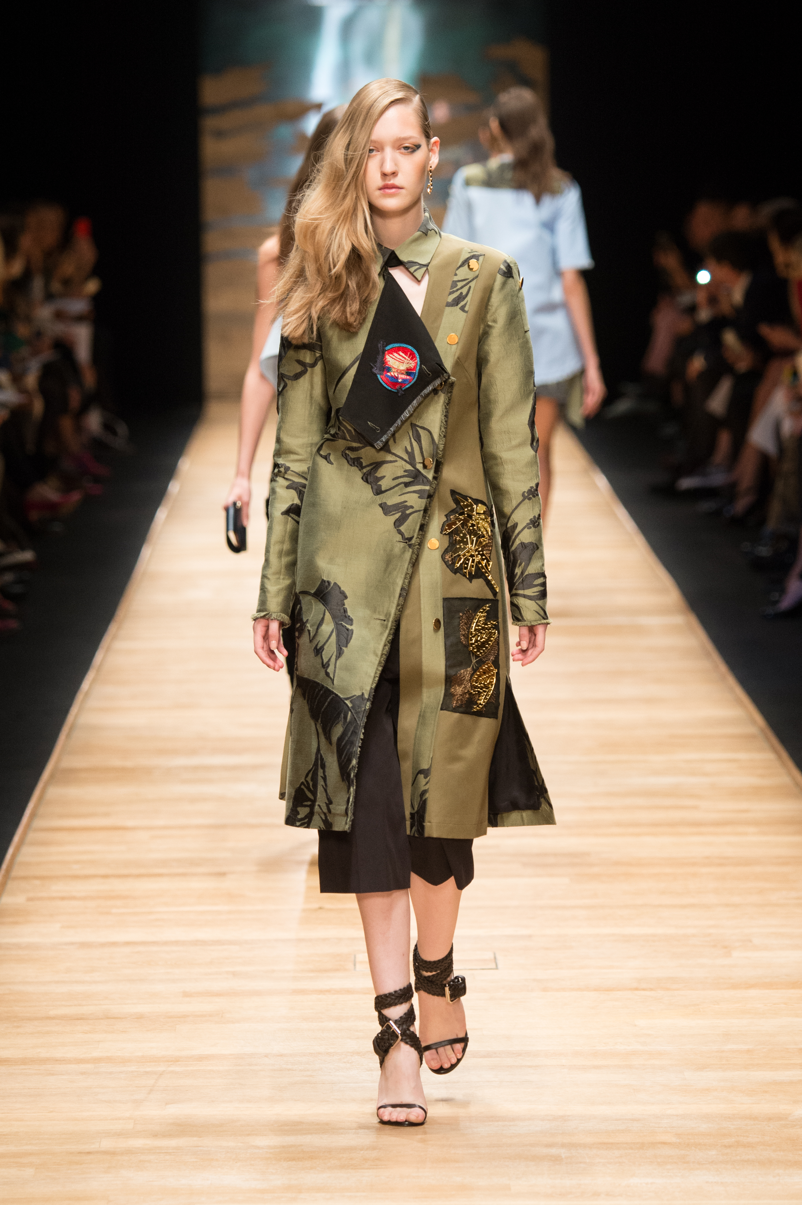 La collection juxtapose clins d’œil à l’époque Beach Boys – broderies et appliqués de palmiers ou de couchers de soleil — et une rigueur quasi-militaire inspirée du début des années 2000. Des classiques de la maison – redingotes, vestes ‘biker’, robes droites — sont déconstruits, éclatés et repensés.