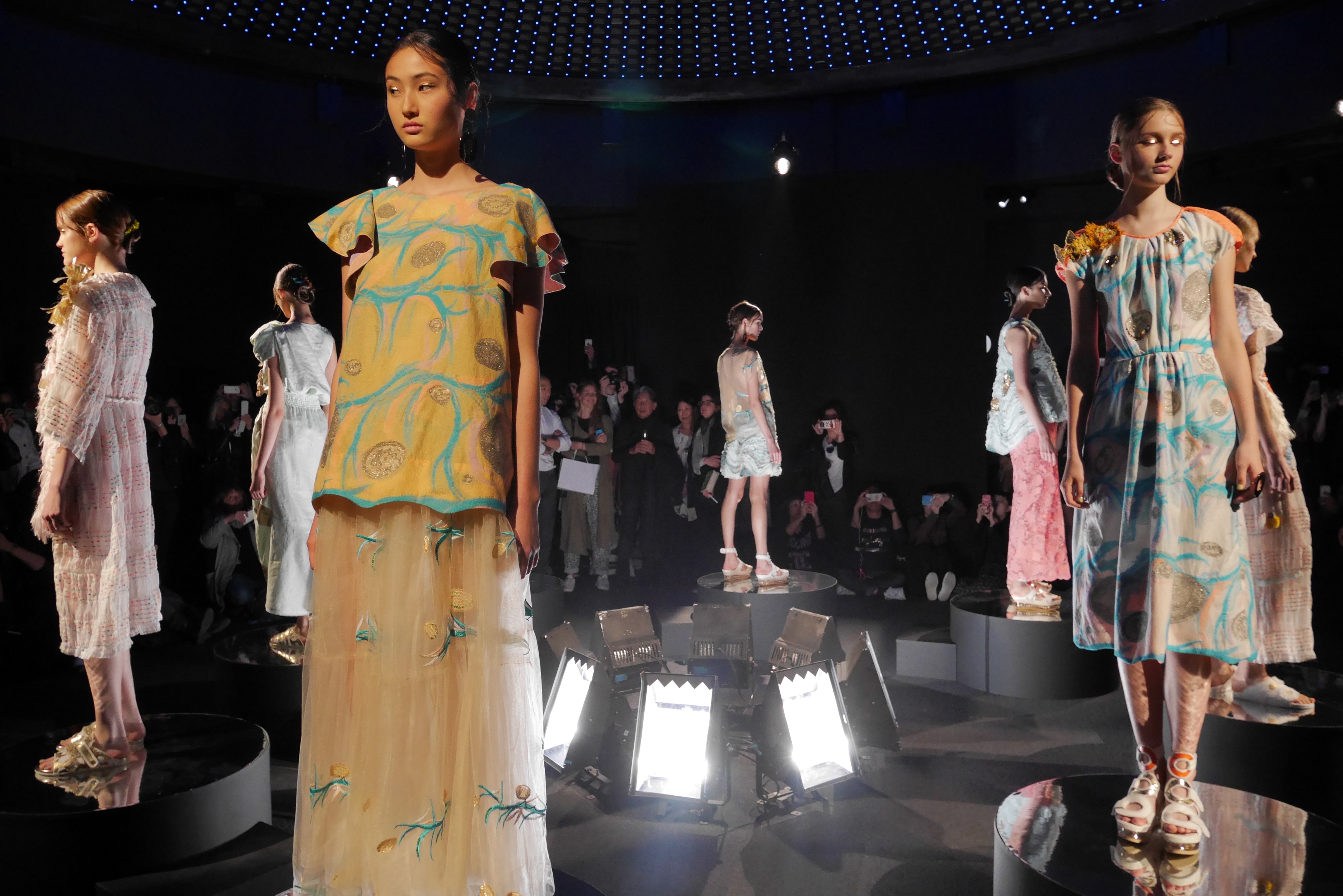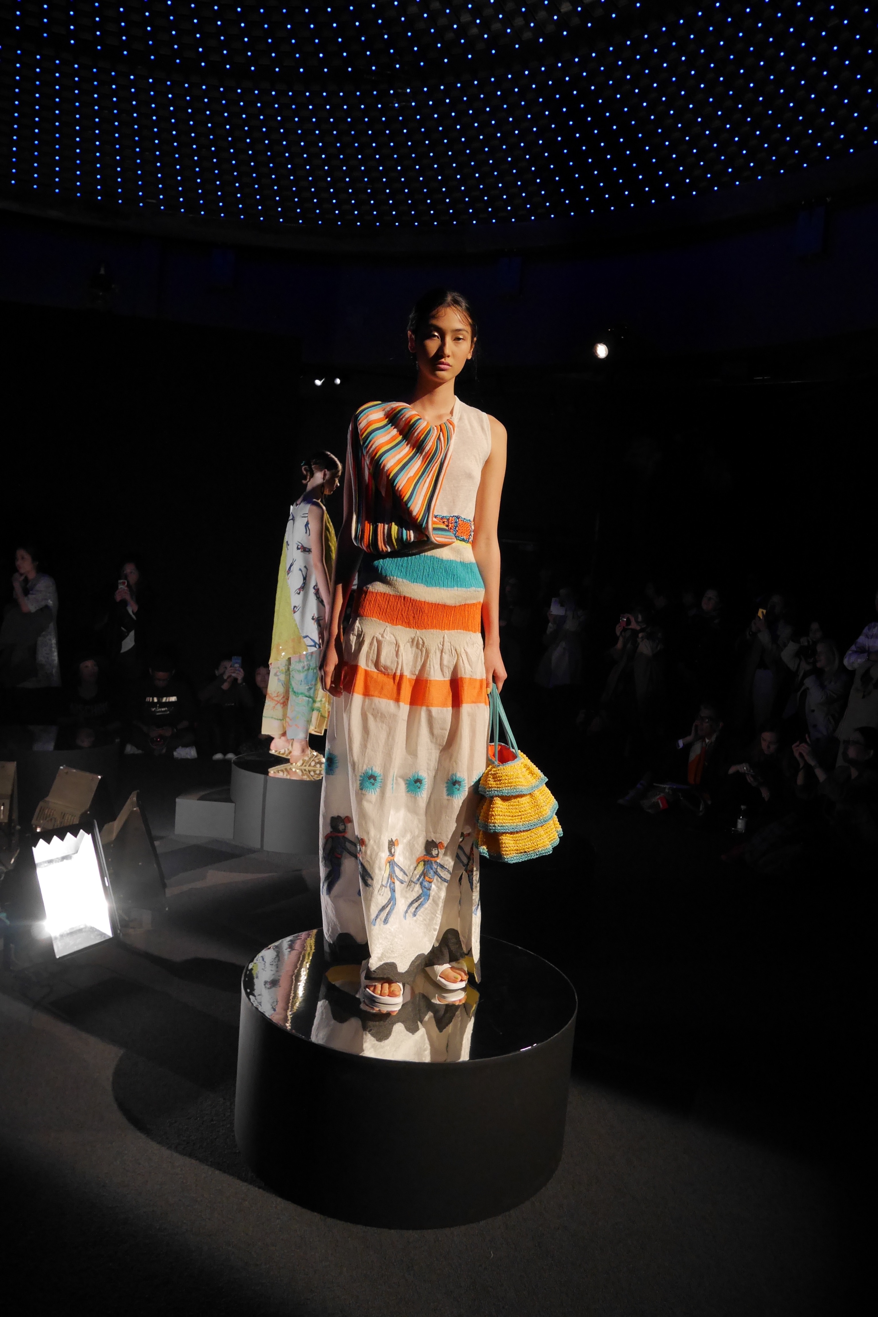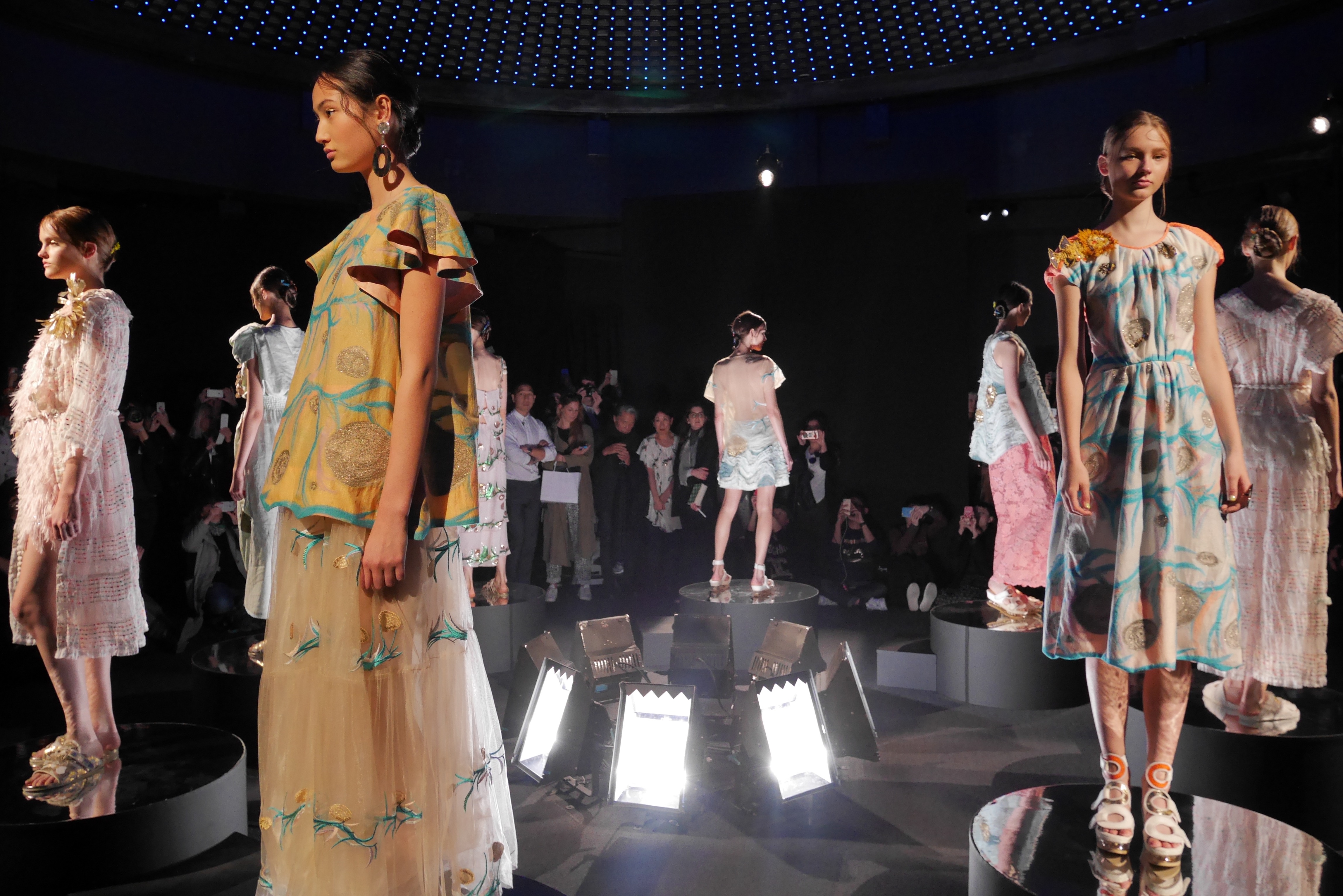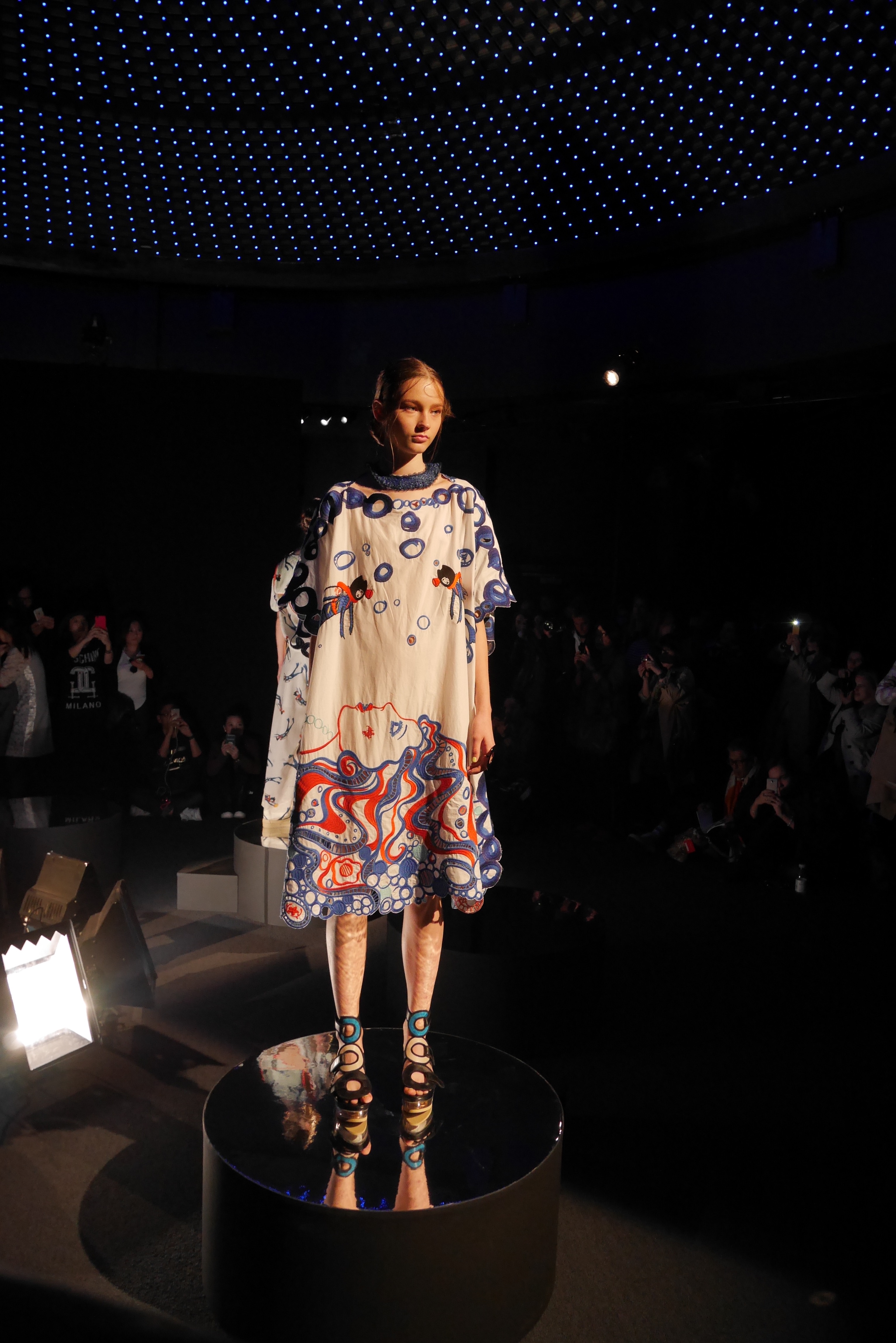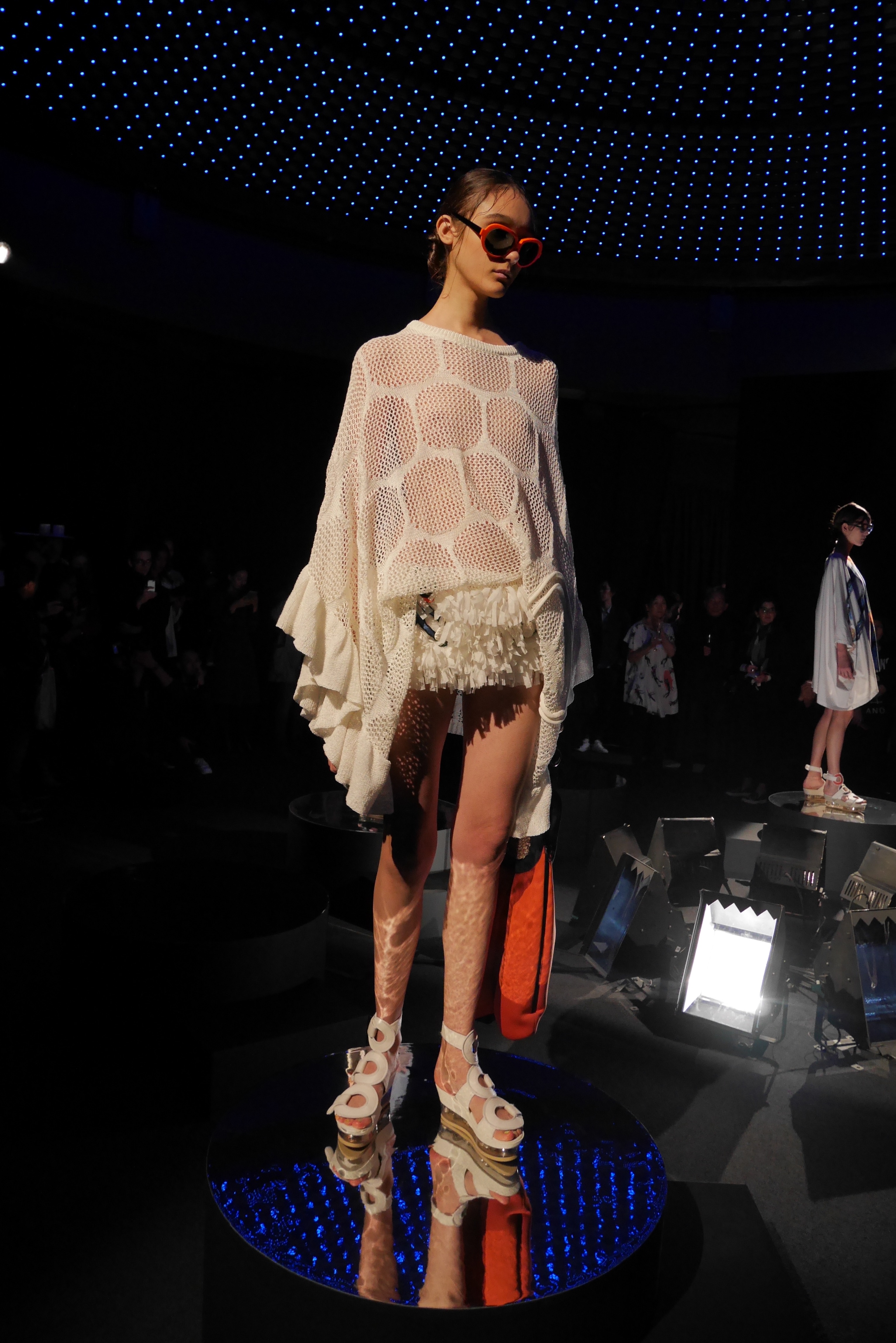 Des bulles deviennent une broderie anglaise qui égaye les bordures de robes élégantes, tandis que des frises géométriques d’algues dansent à chaque pas, comme touchées par la caresse du courant. En hommage à l’inspiration des flots, les accessoires portent en eux l’esprit joyeux et toujours juvénile de Tsumori Chisato.