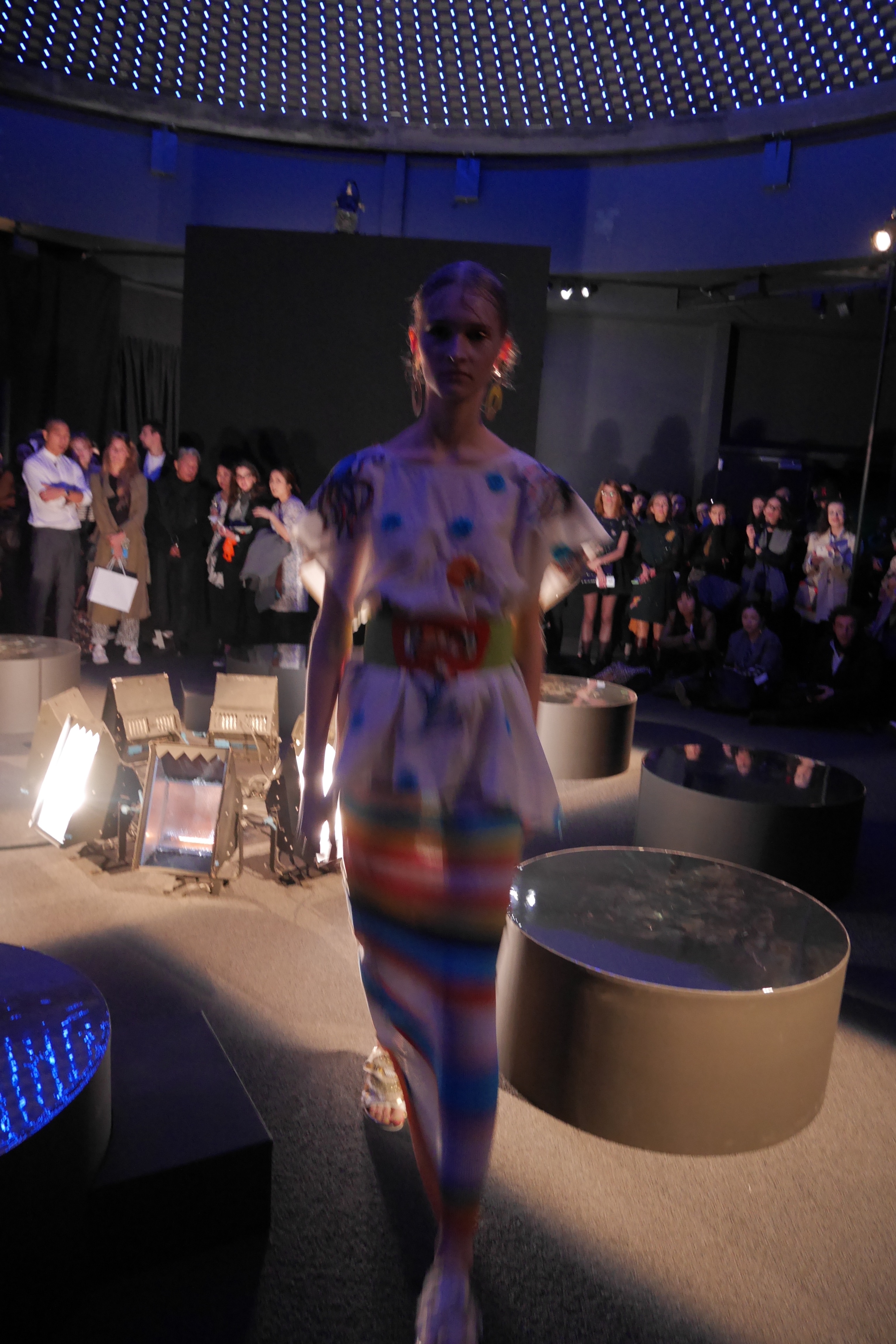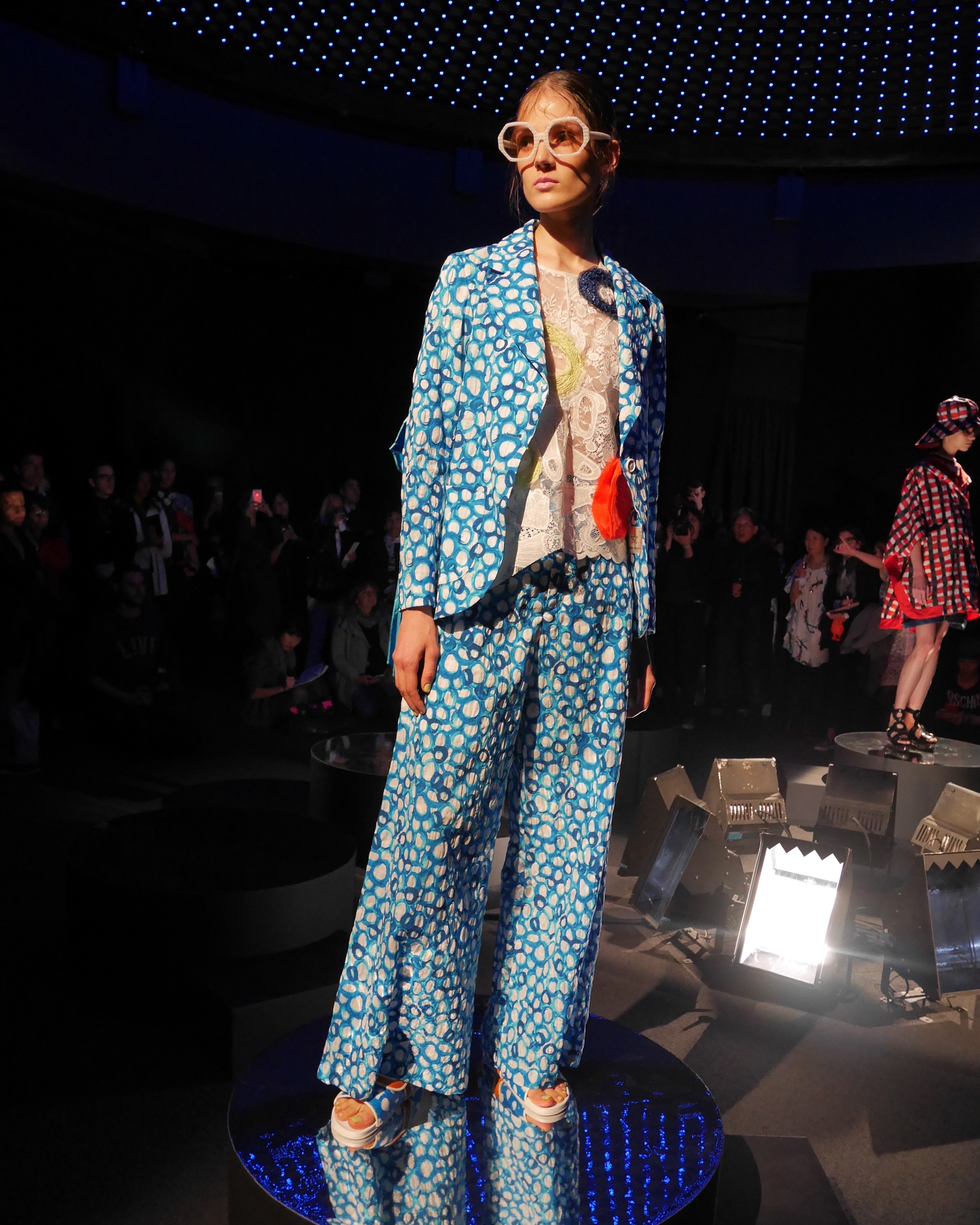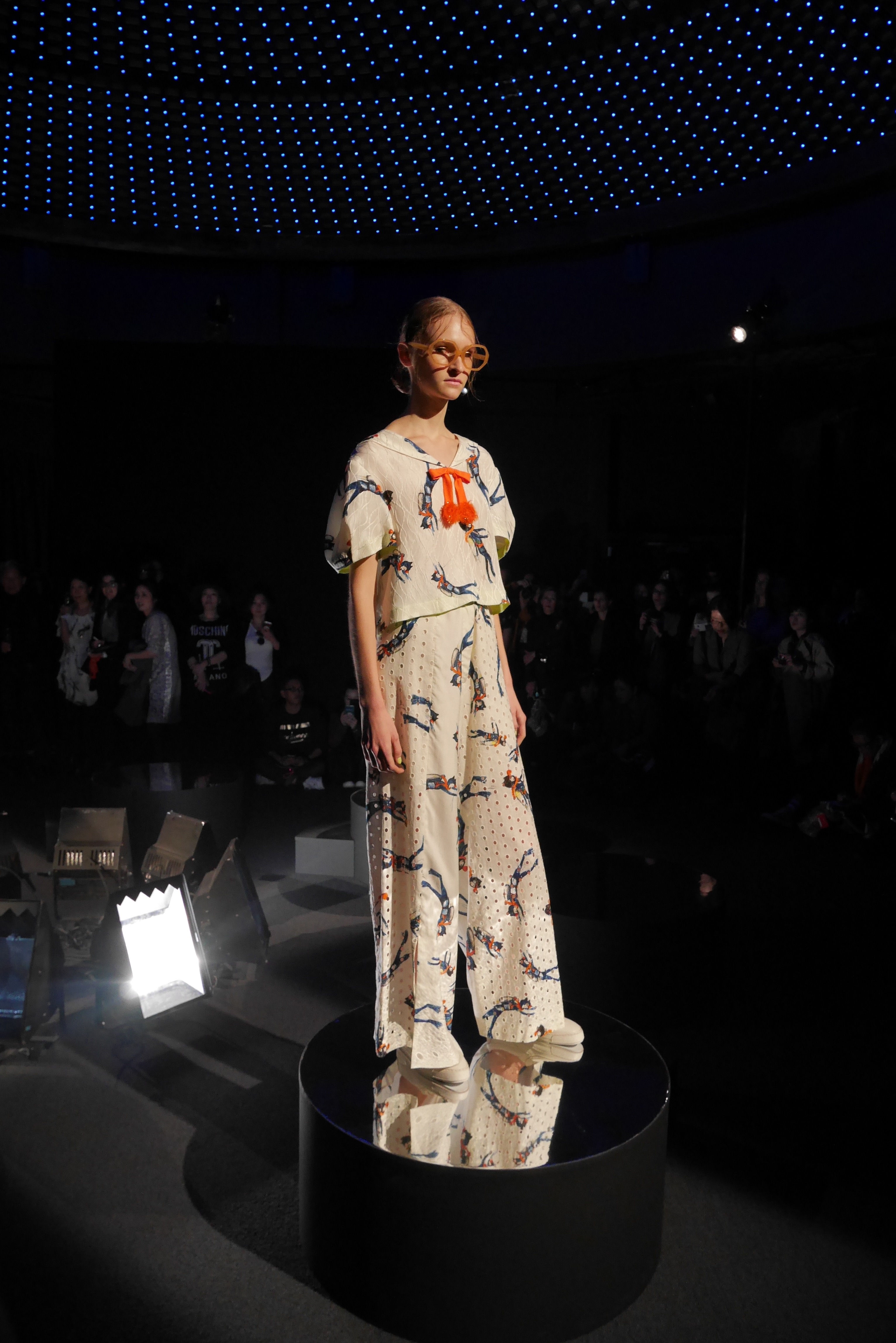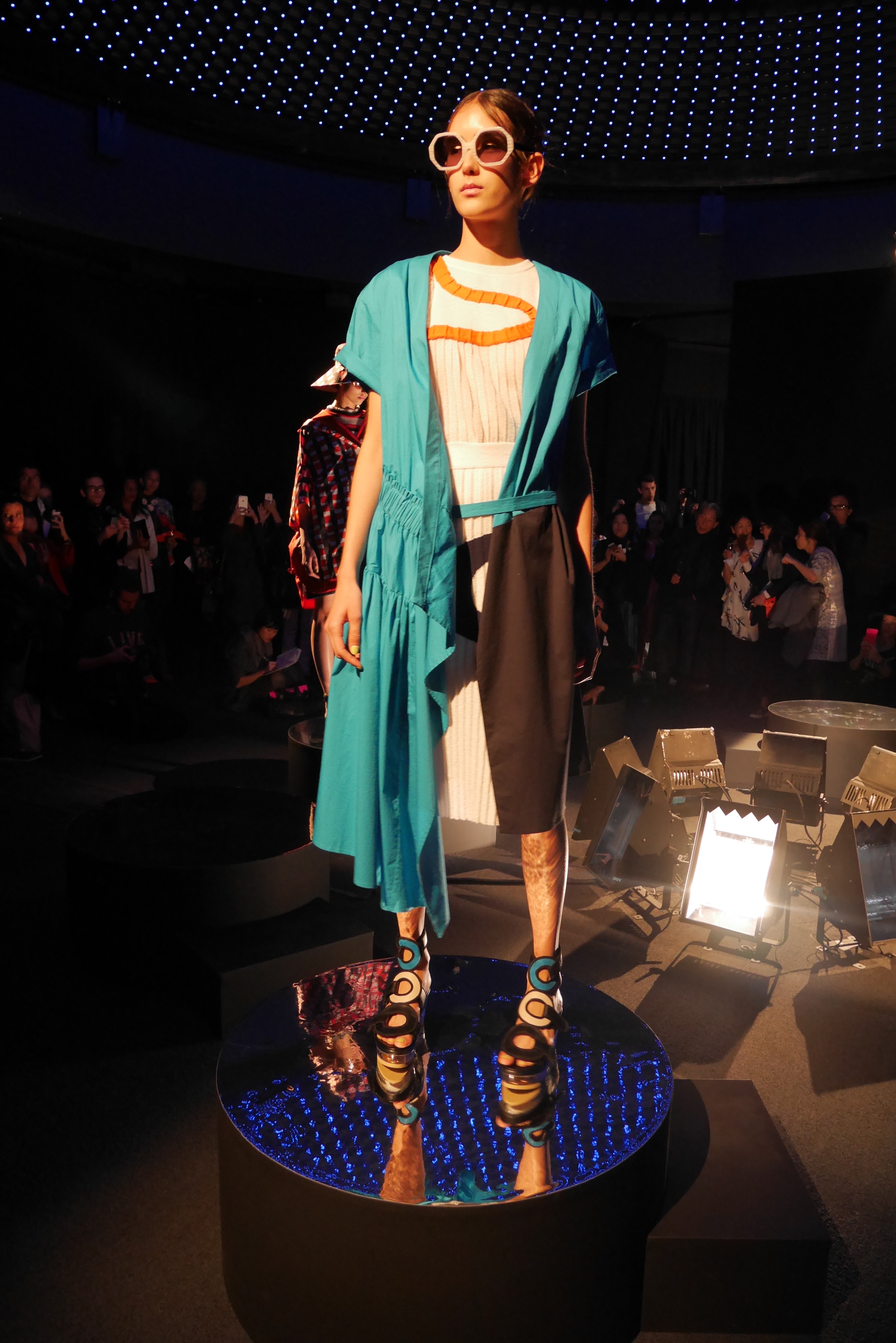 Des bulles deviennent une broderie anglaise qui égaye les bordures de robes élégantes, tandis que des frises géométriques d’algues dansent à chaque pas, comme touchées par la caresse du courant. En hommage à l’inspiration des flots, les accessoires portent en eux l’esprit joyeux et toujours juvénile de Tsumori Chisato.