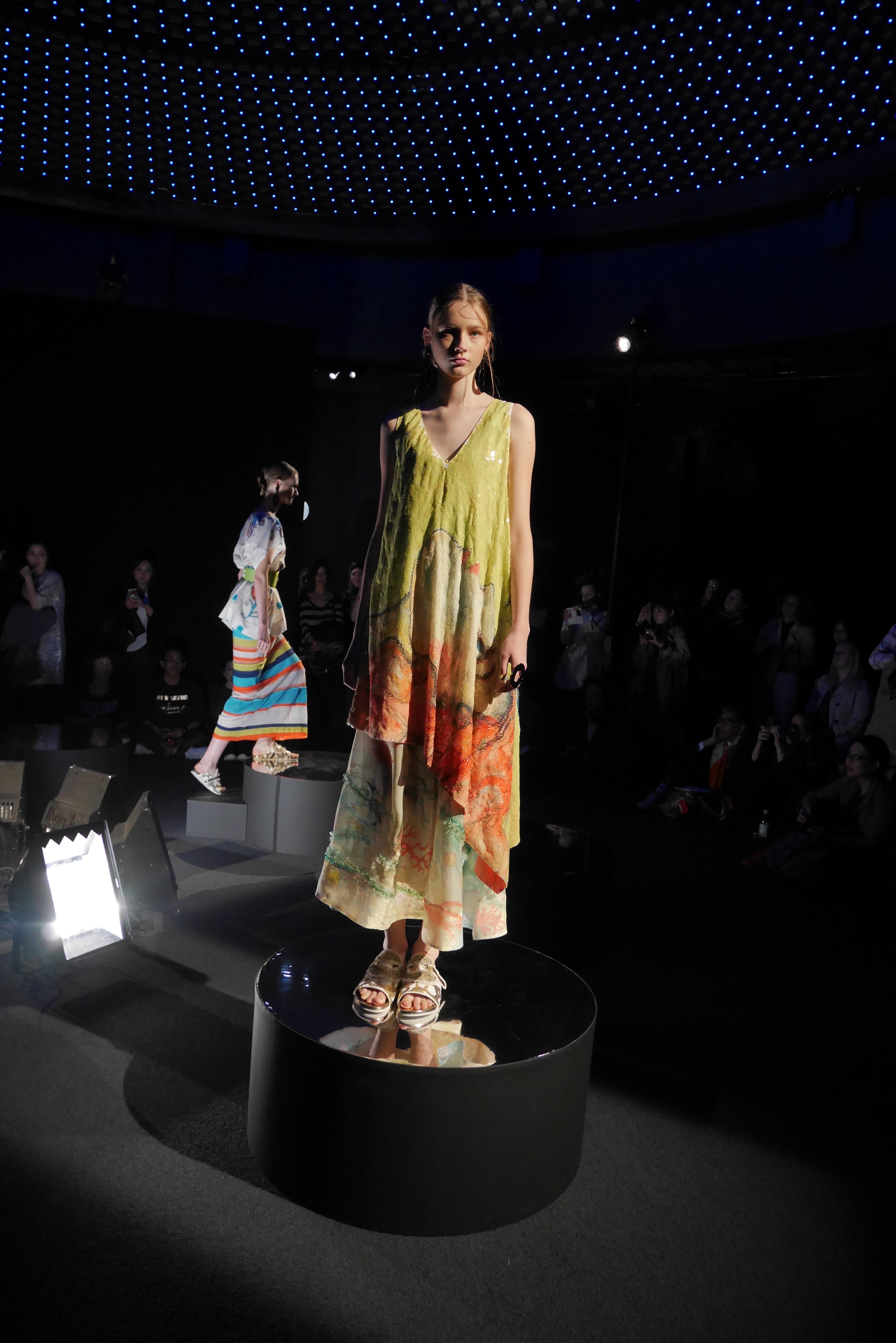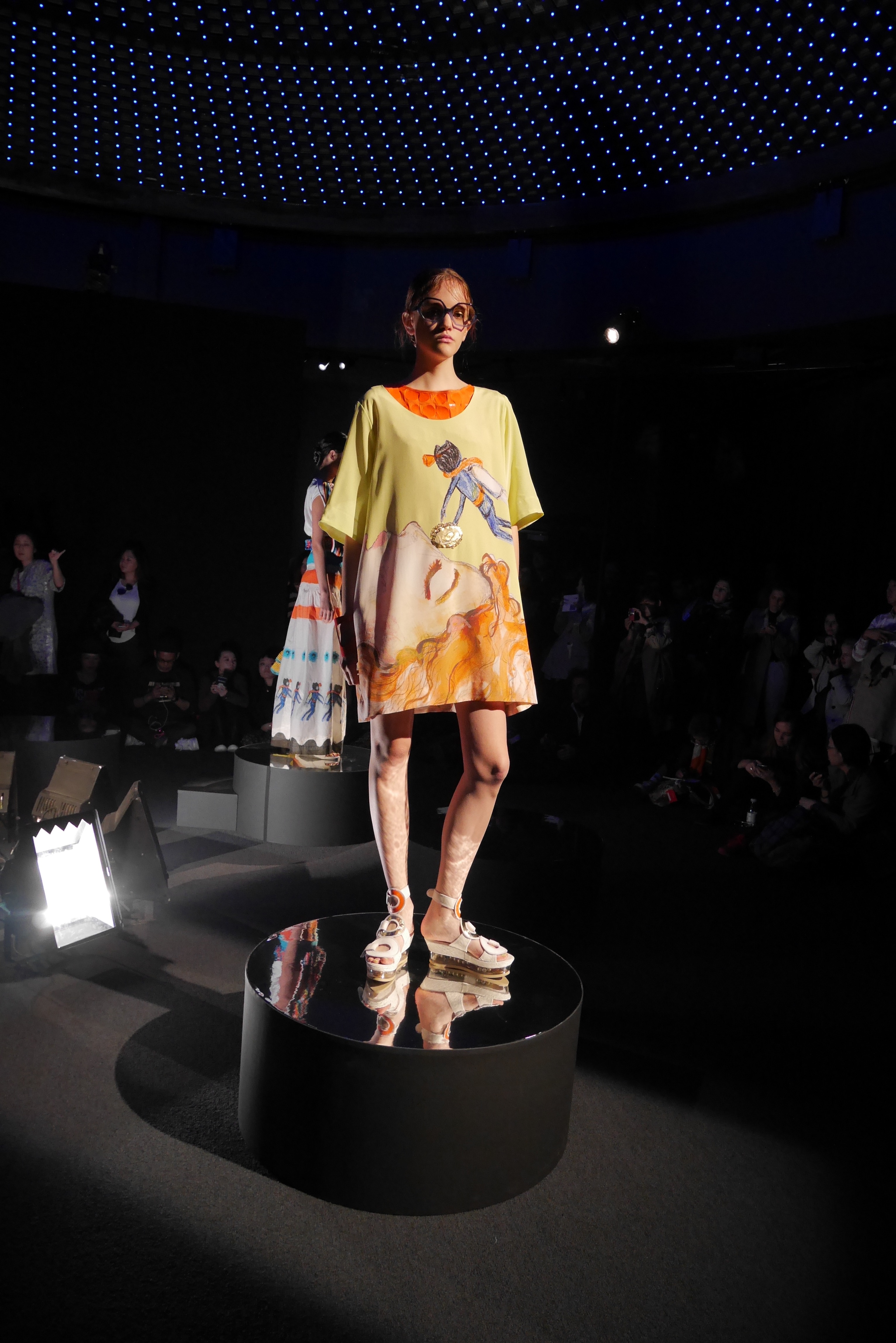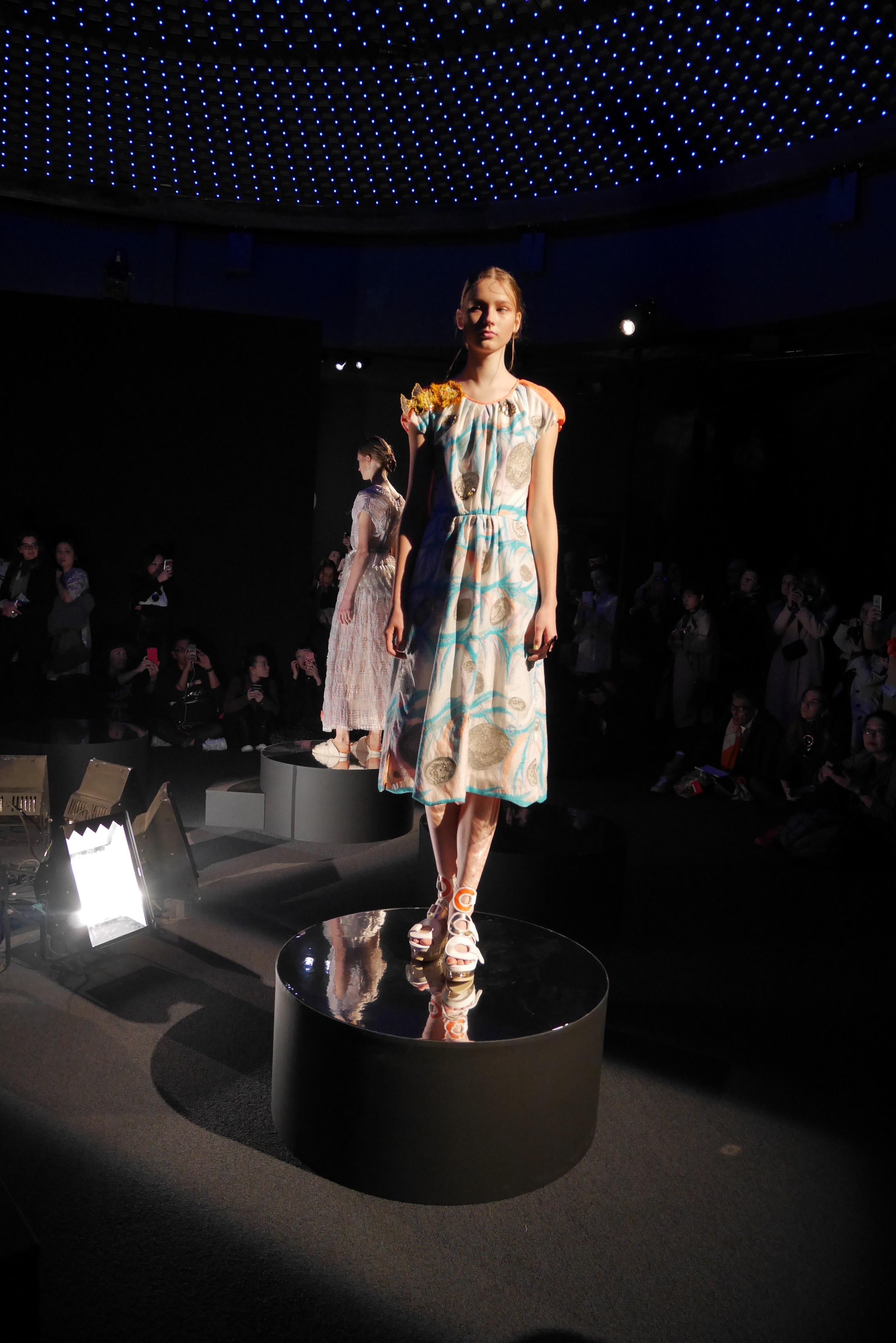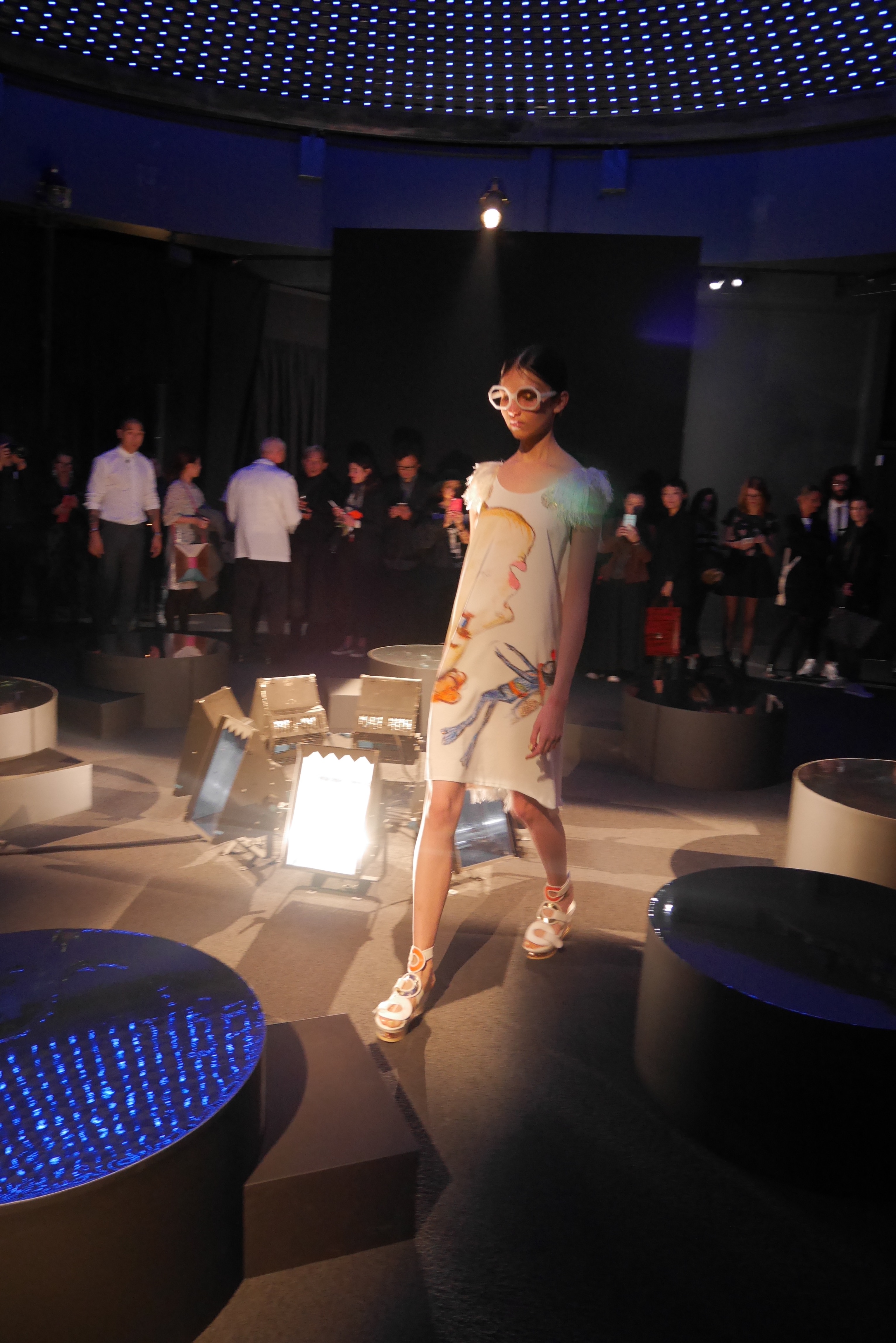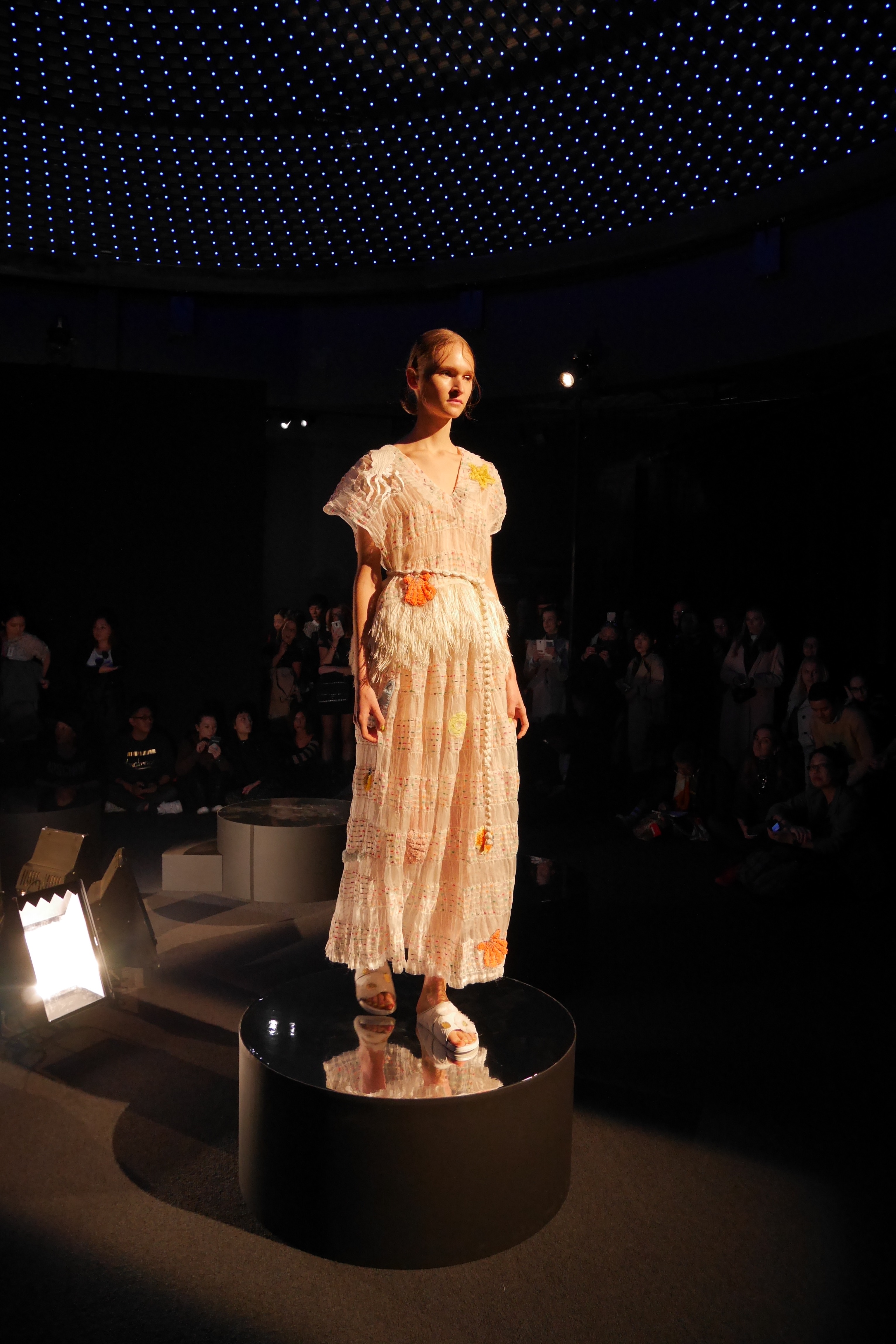Des bulles deviennent une broderie anglaise qui égaye les bordures de robes élégantes, tandis que des frises géométriques d’algues dansent à chaque pas, comme touchées par la caresse du courant. En hommage à l’inspiration des flots, les accessoires portent en eux l’esprit joyeux et toujours juvénile de Tsumori Chisato.