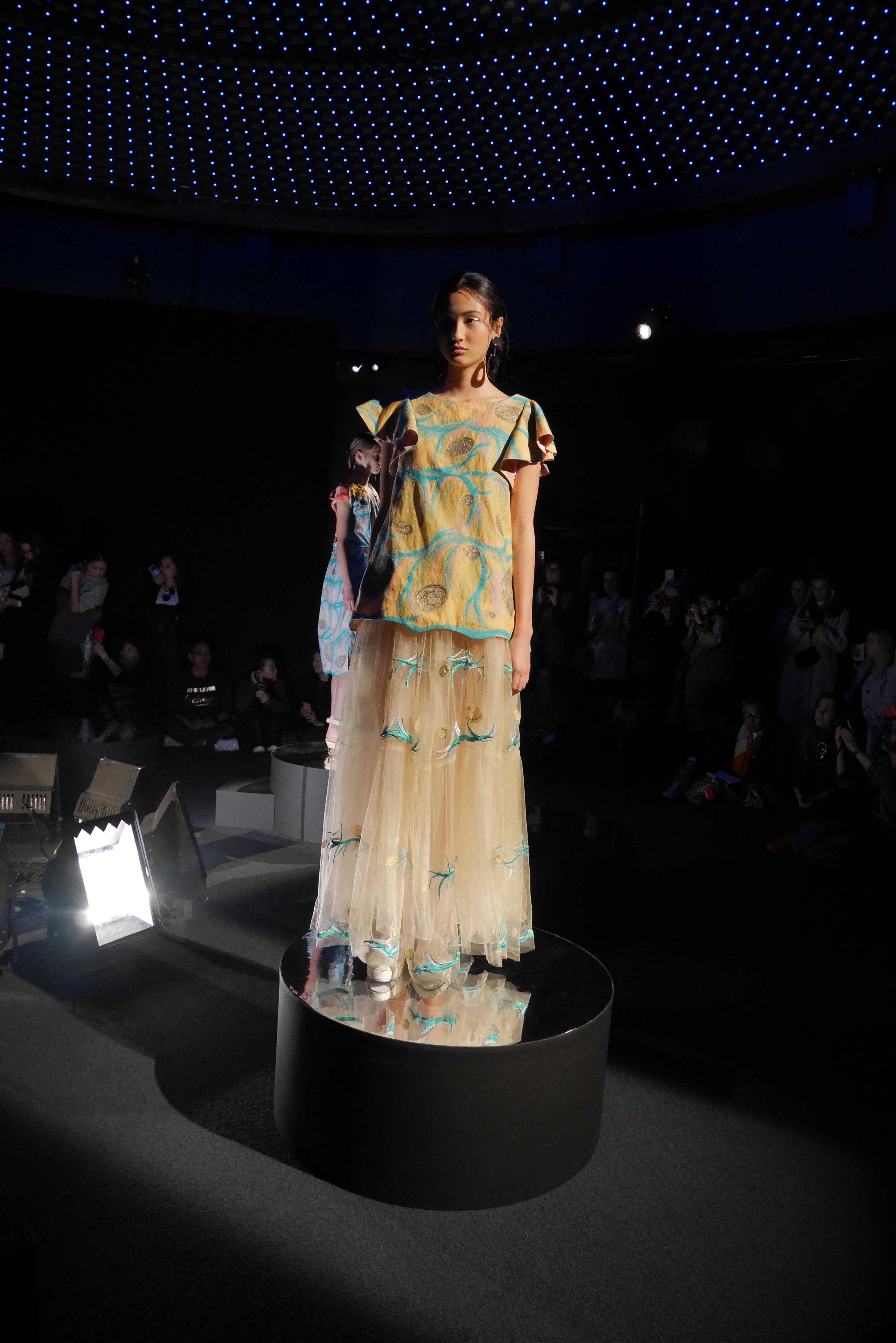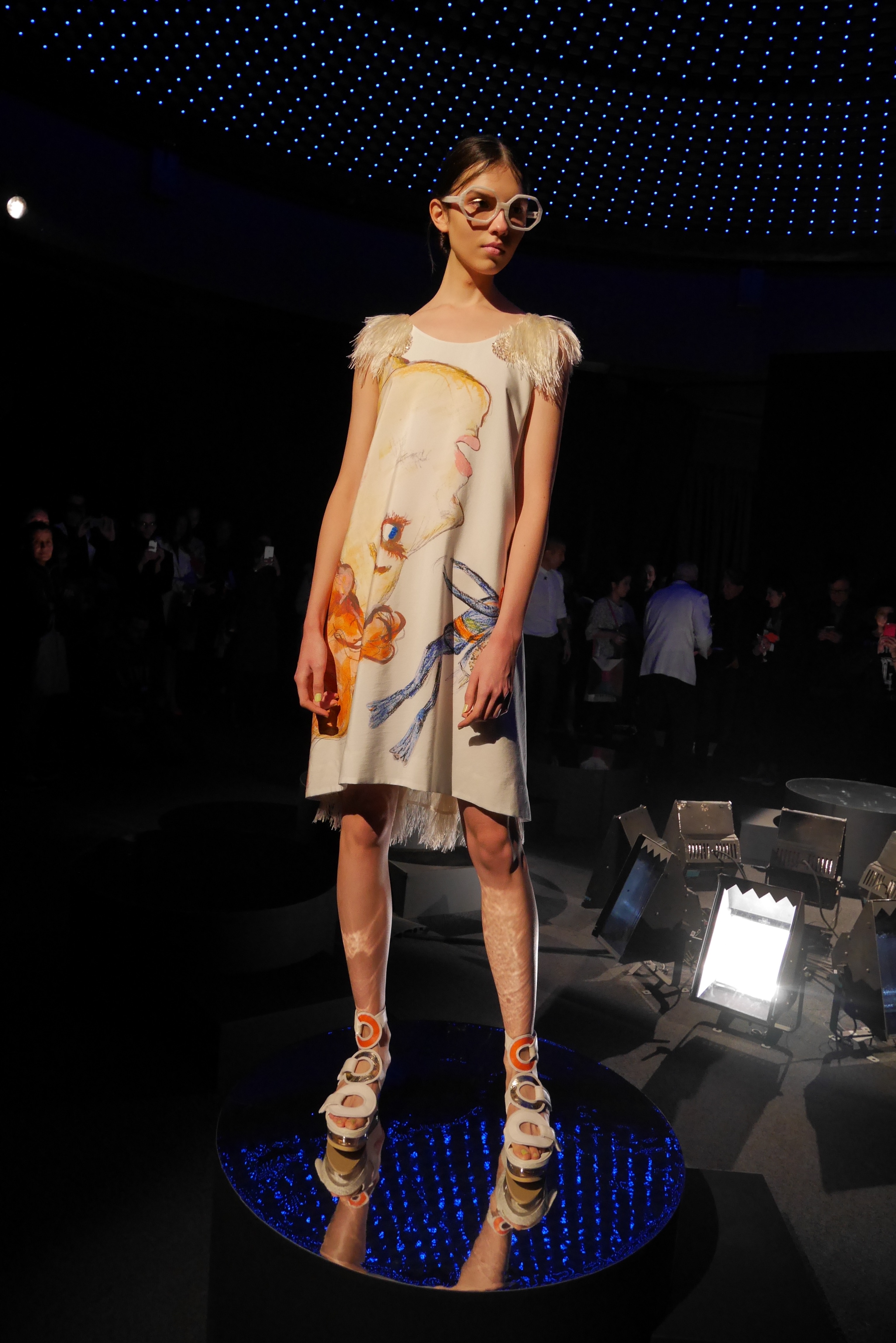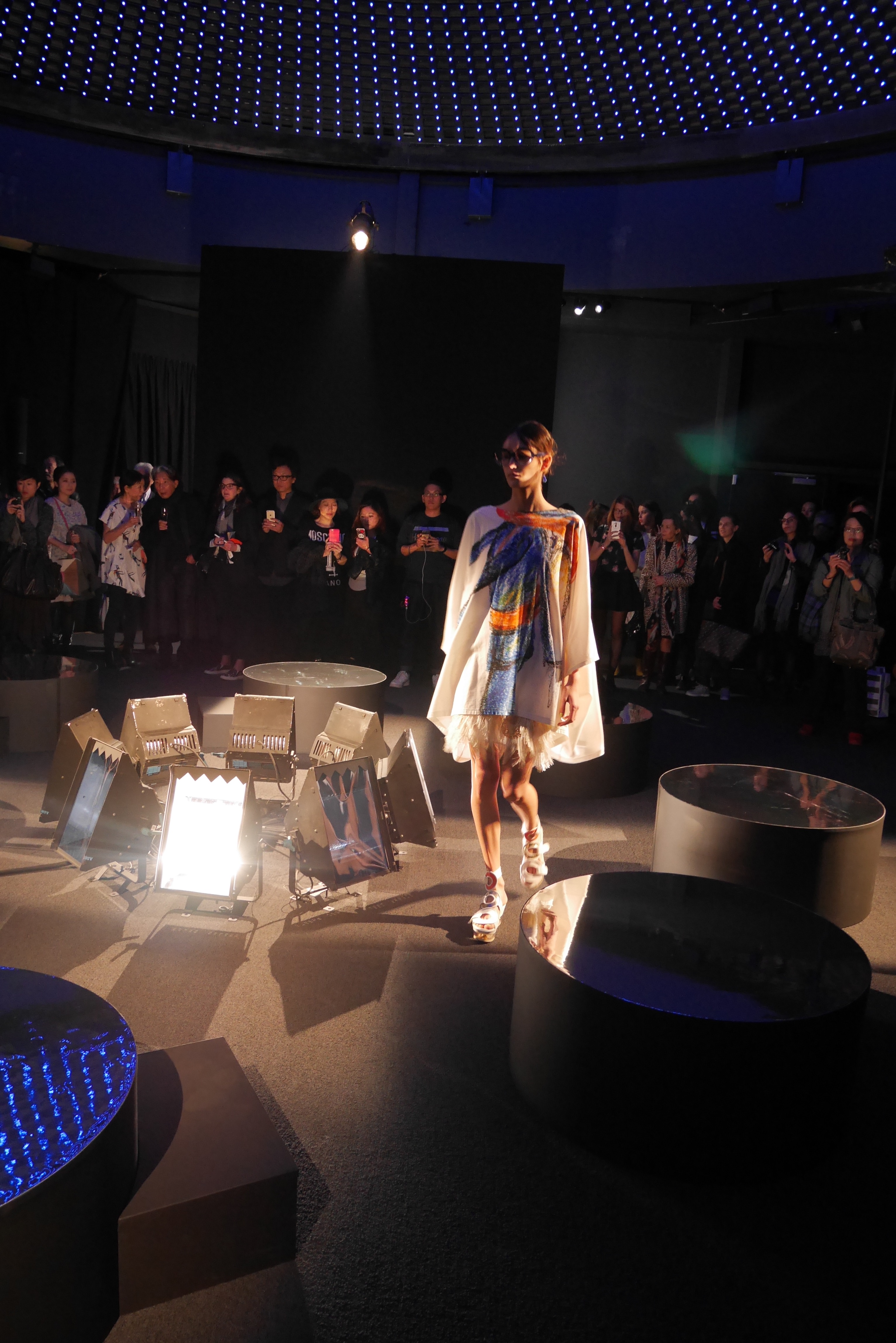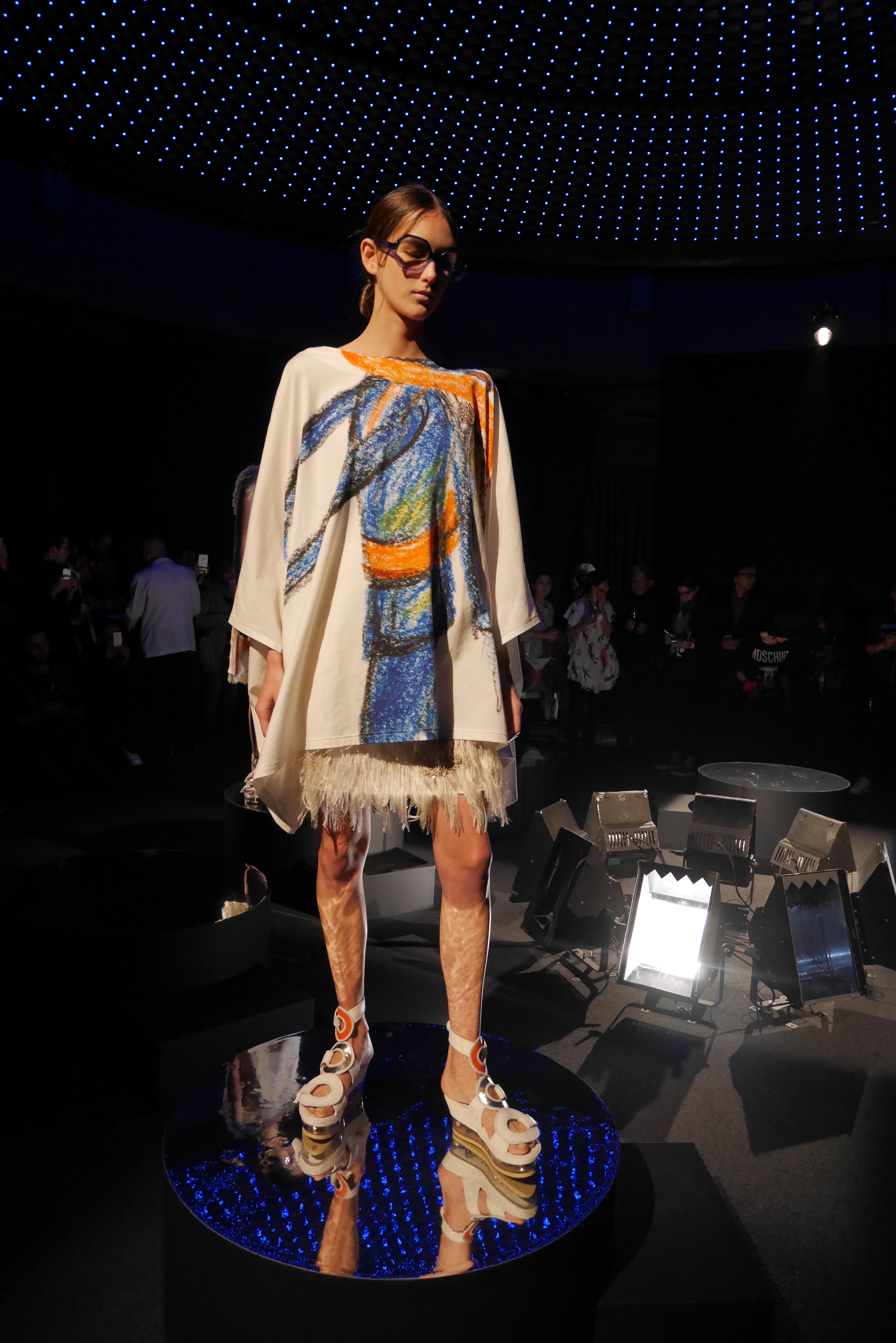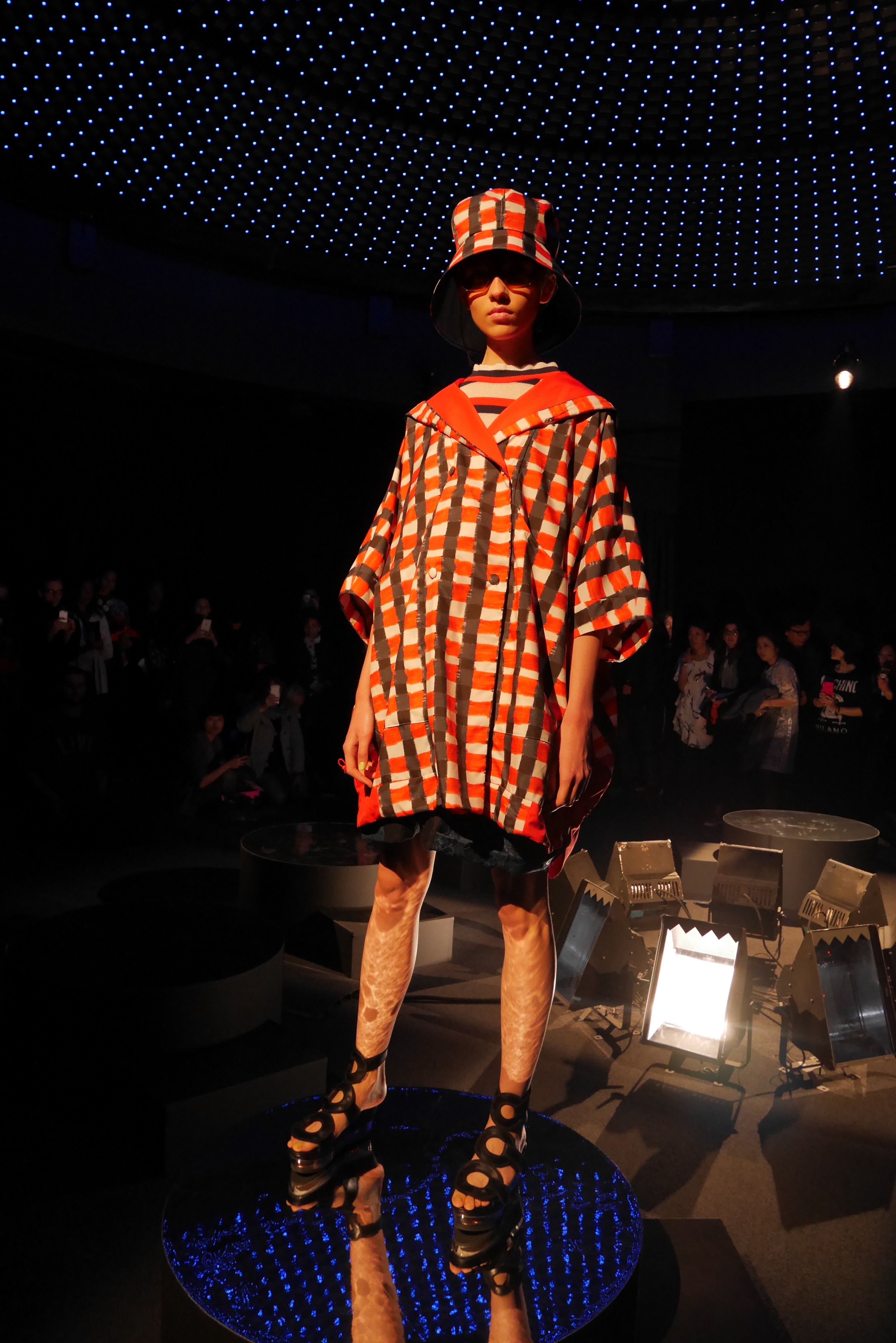 Des bulles deviennent une broderie anglaise qui égaye les bordures de robes élégantes, tandis que des frises géométriques d’algues dansent à chaque pas, comme touchées par la caresse du courant. En hommage à l’inspiration des flots, les accessoires portent en eux l’esprit joyeux et toujours juvénile de Tsumori Chisato.