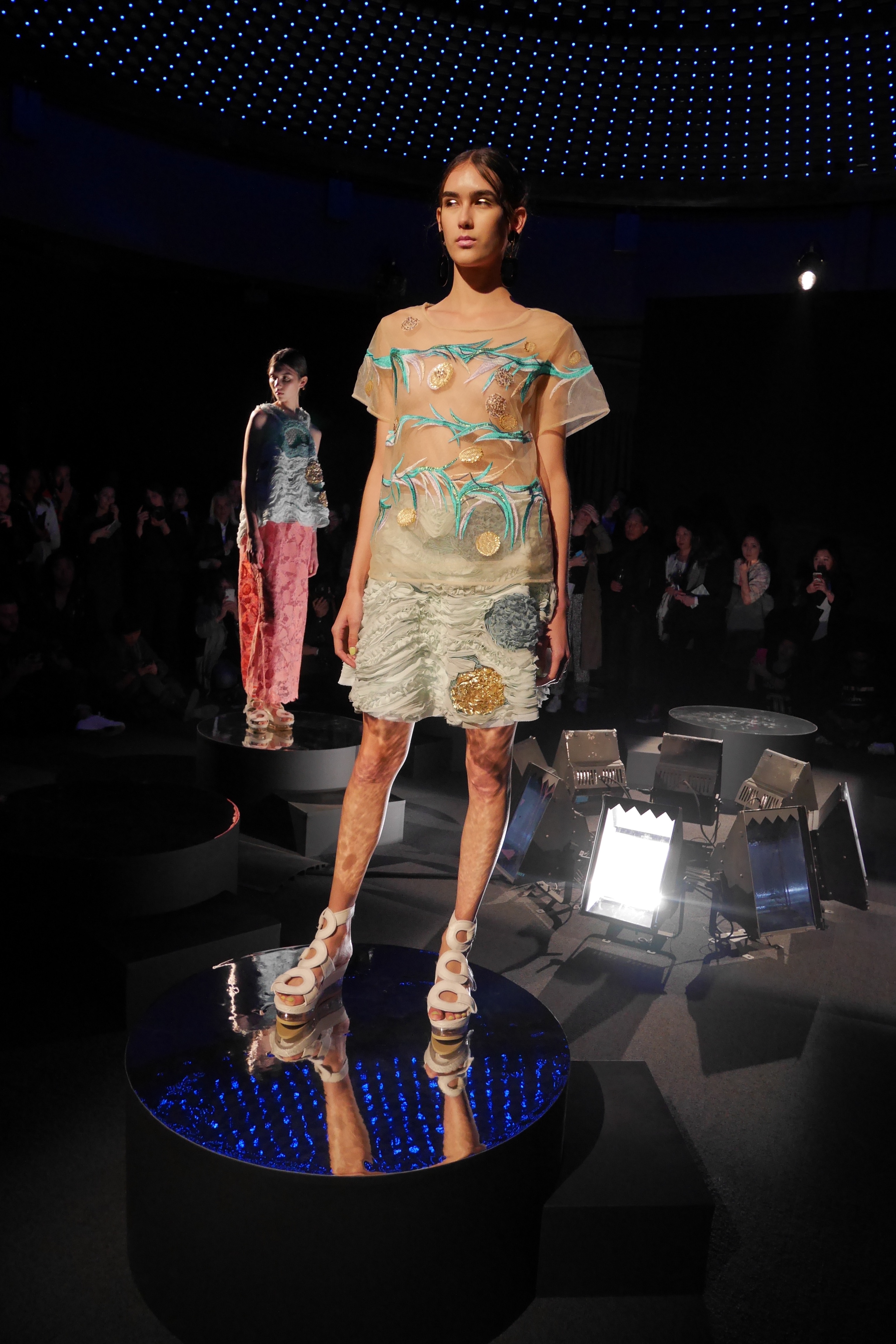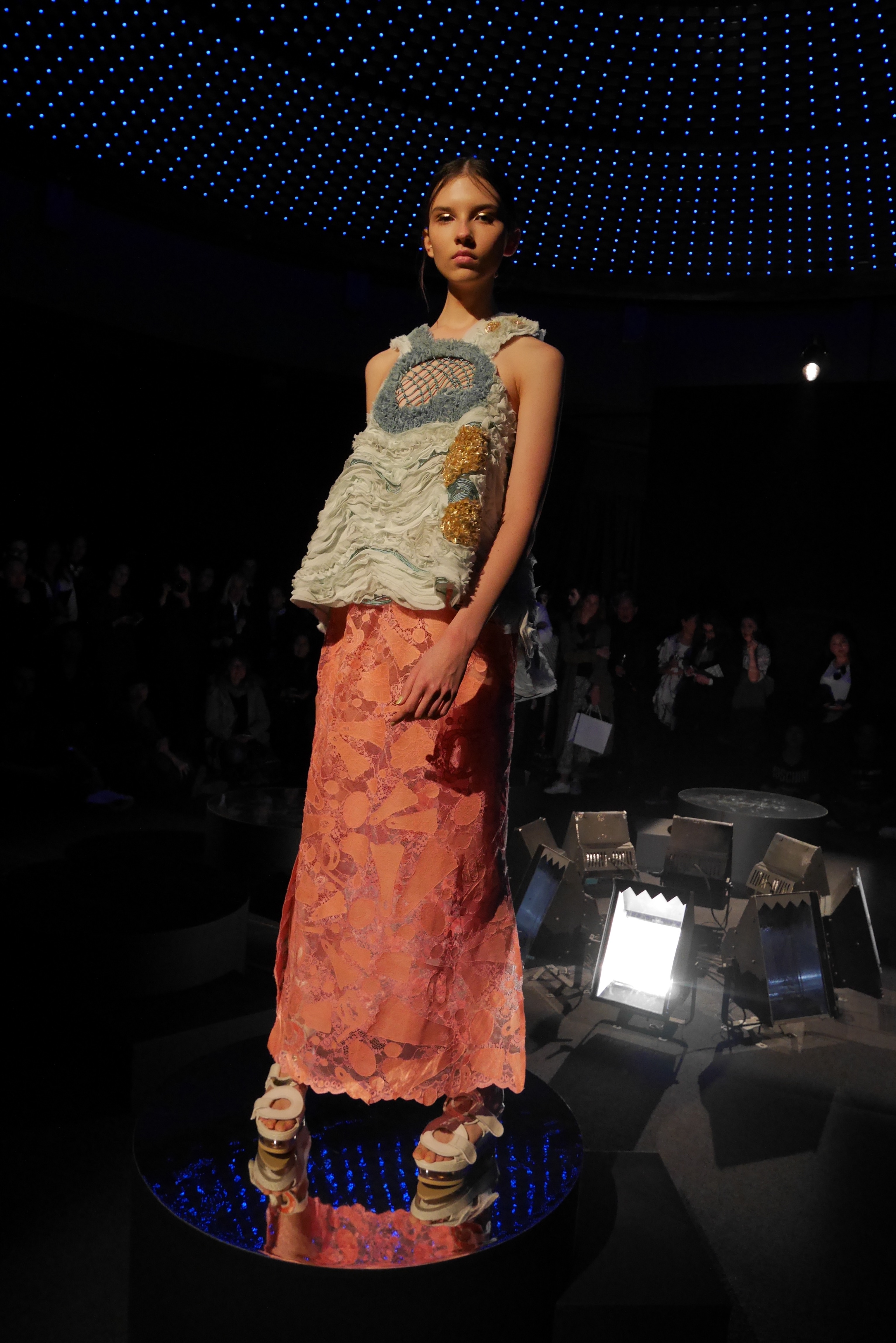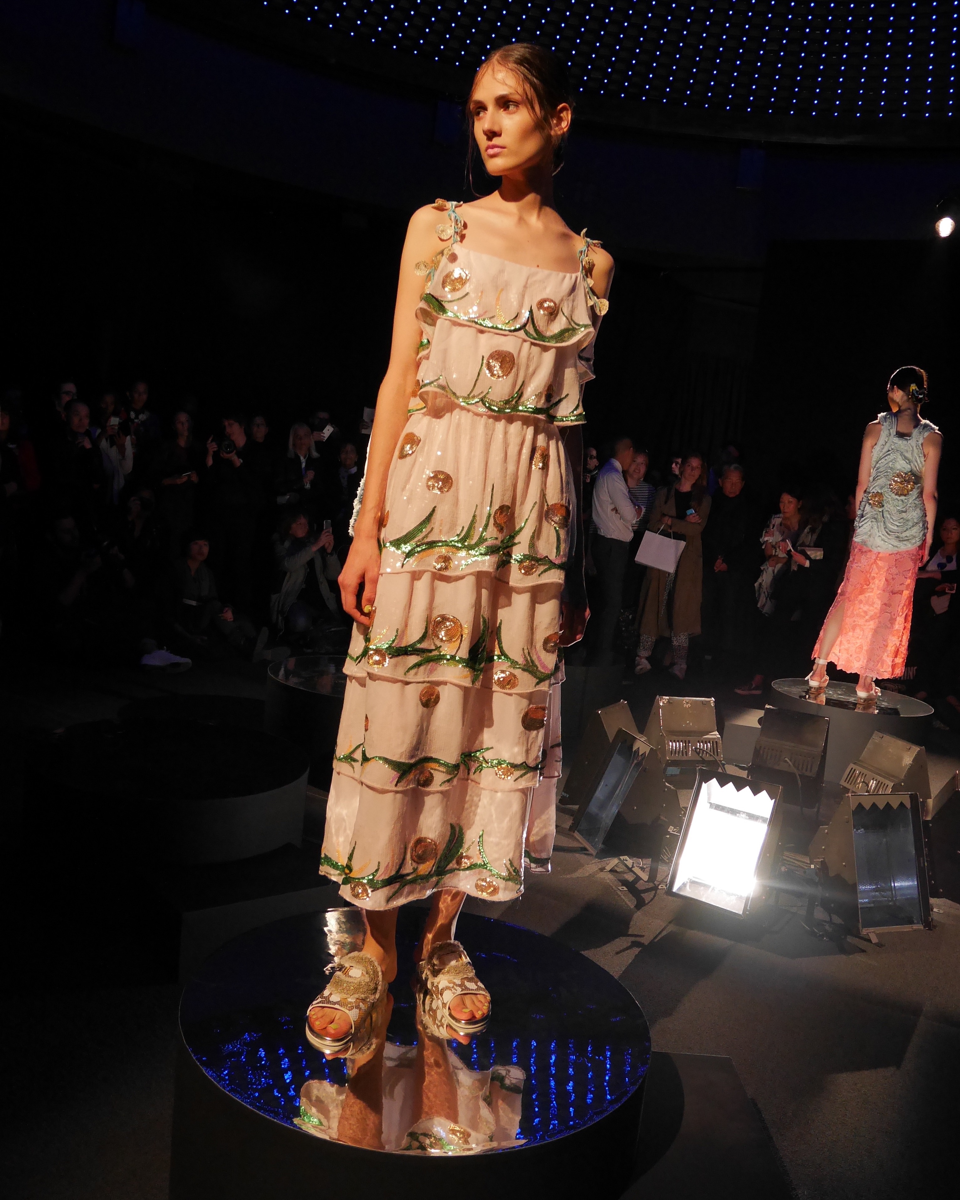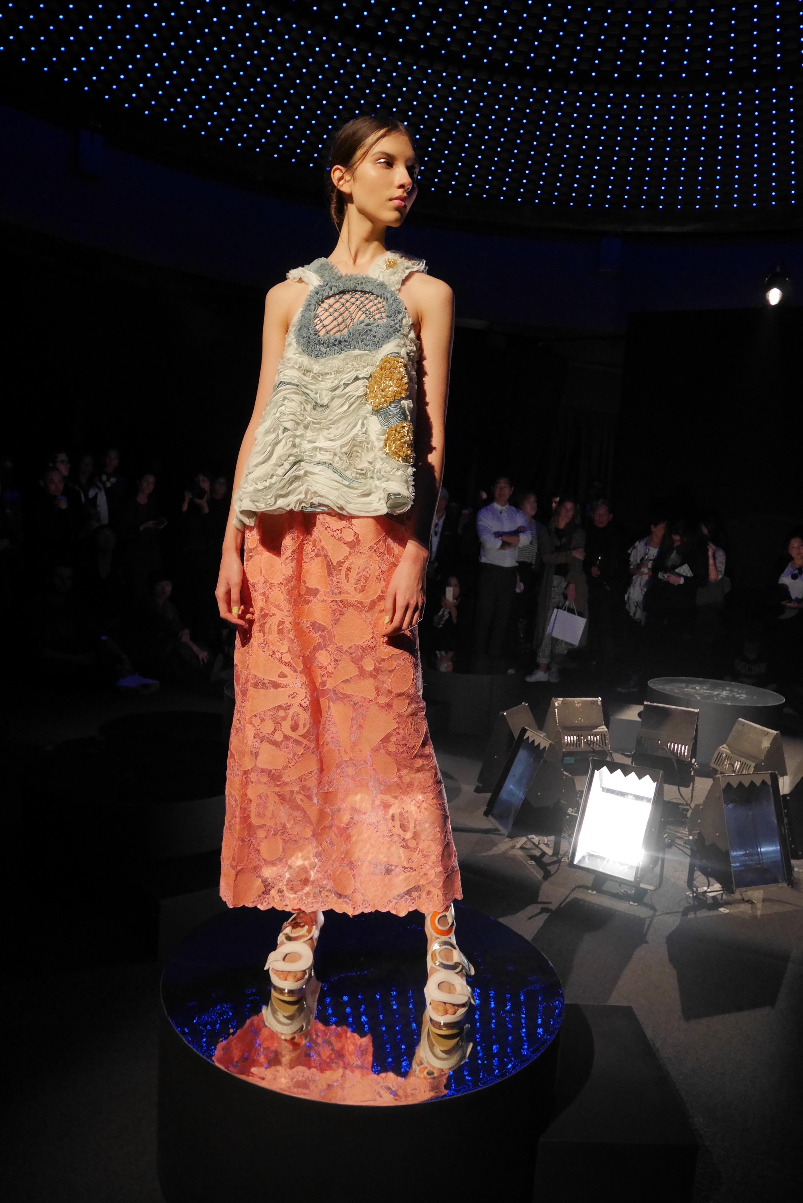 Sous les vagues, la richesse du monde marin devient une source nourricière d’inspirations qui s’entr’aperçoit au travers d’un masque de plongée. Touché par l’imaginaire vivifiant de Tsumori Chisato, le filet du chalutier devient un cadre à cette chasse précieuse. Un éclat d’or attire l’œil, révélant vite le trésor de quelque roi pirate oublié, dont les pièces d’or s’échappent d’un coffre enfoui. Des perles s’accumulent dans la semelle d’une sandale, leur nacre scintillant d’un rose tendre et lumineux.