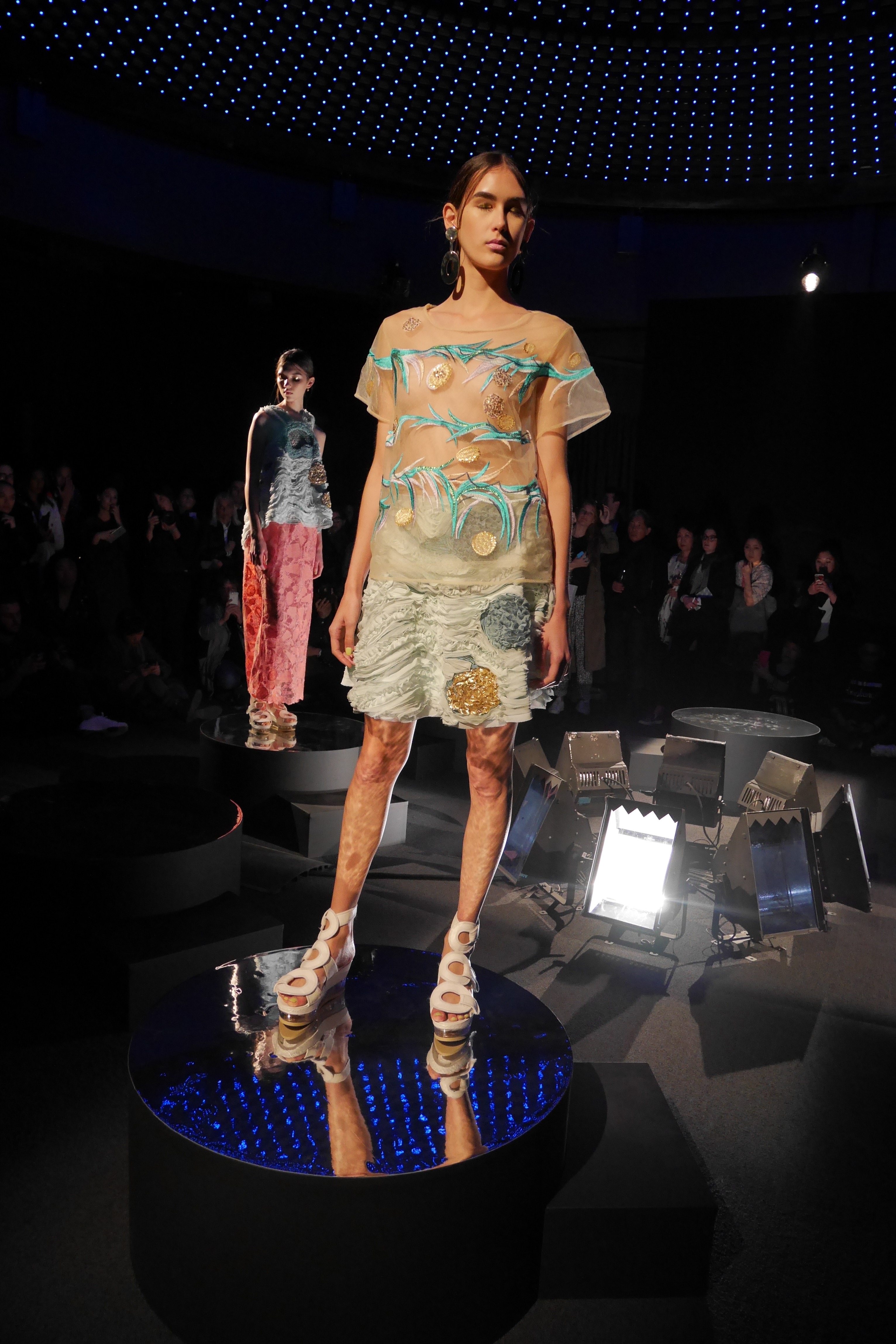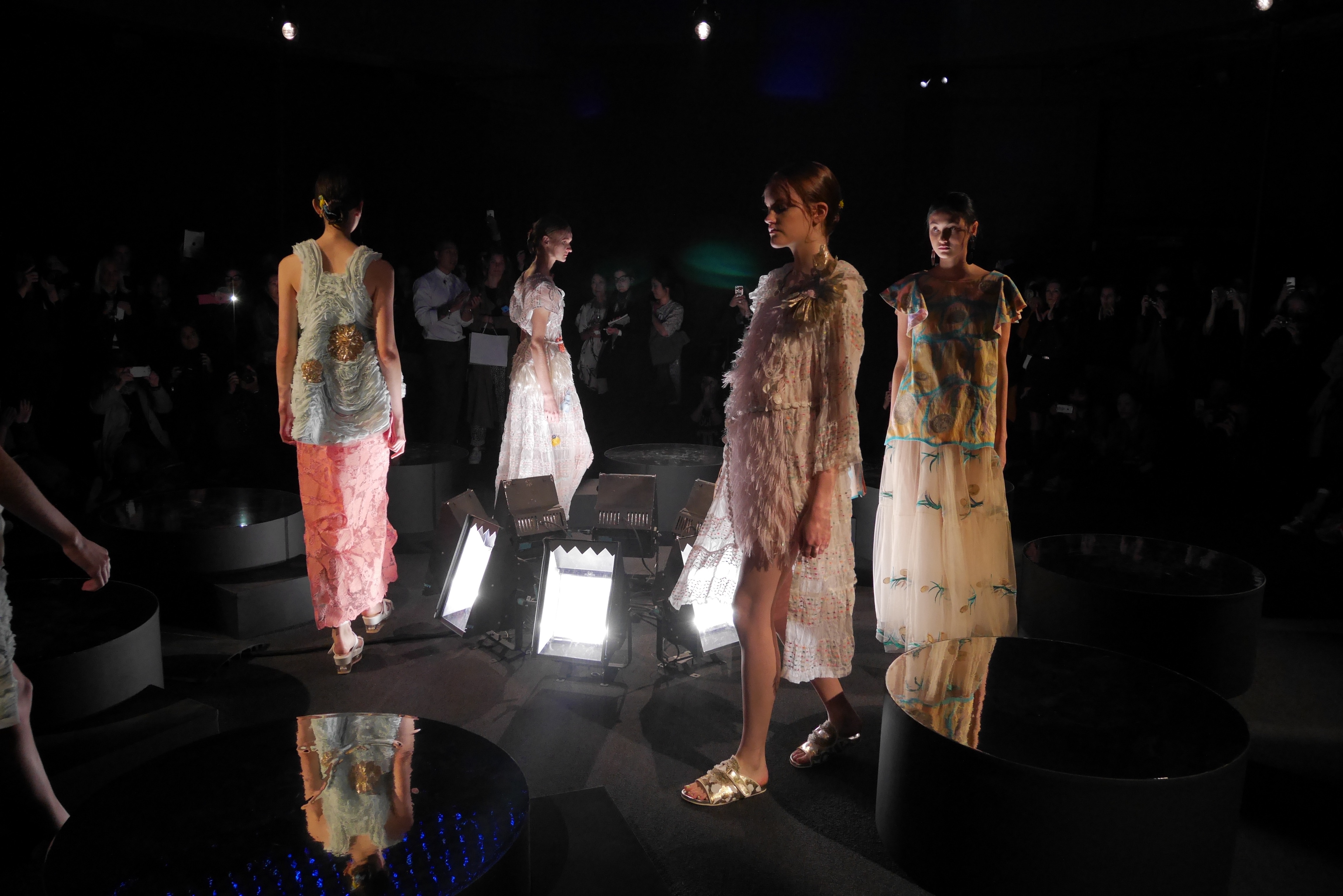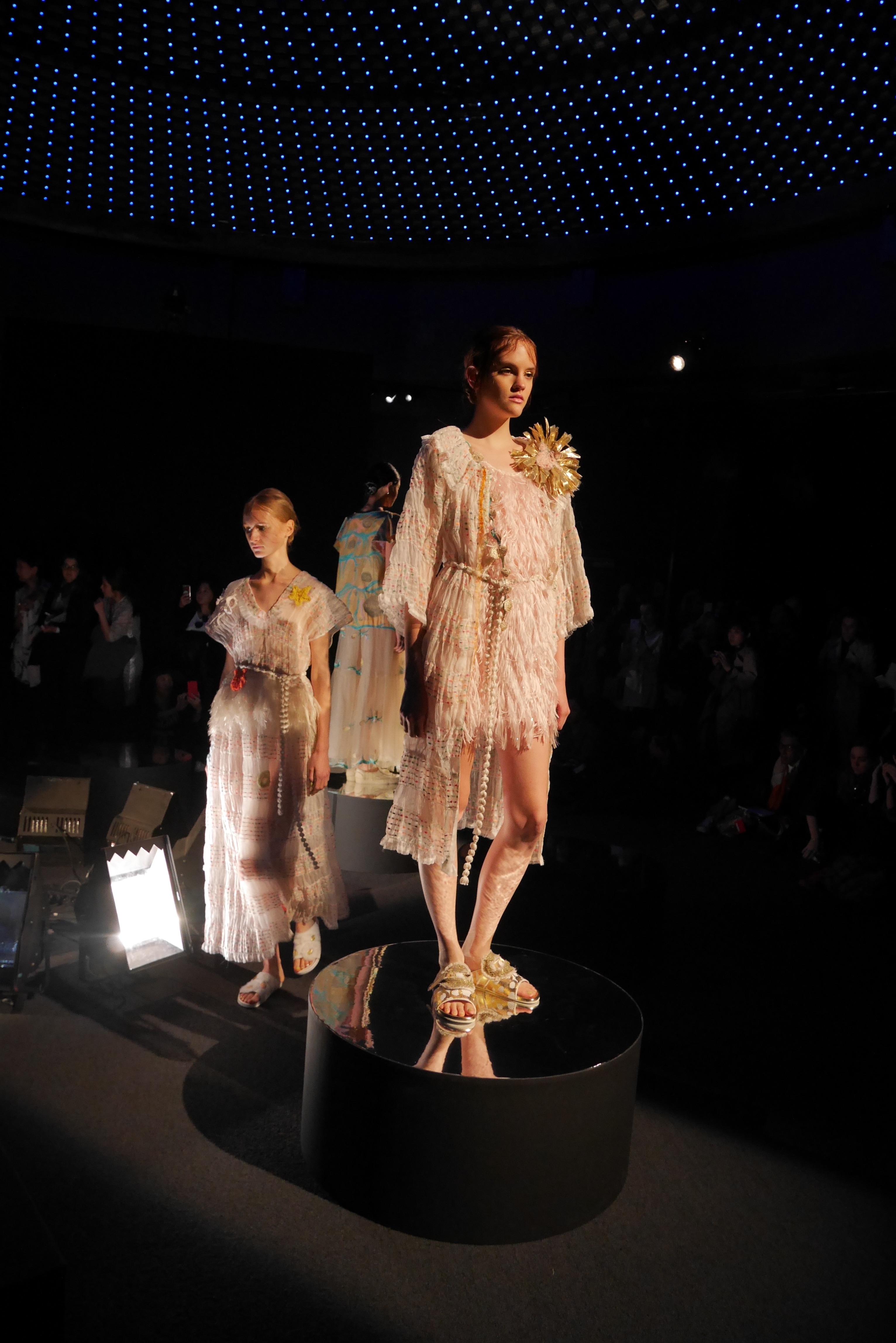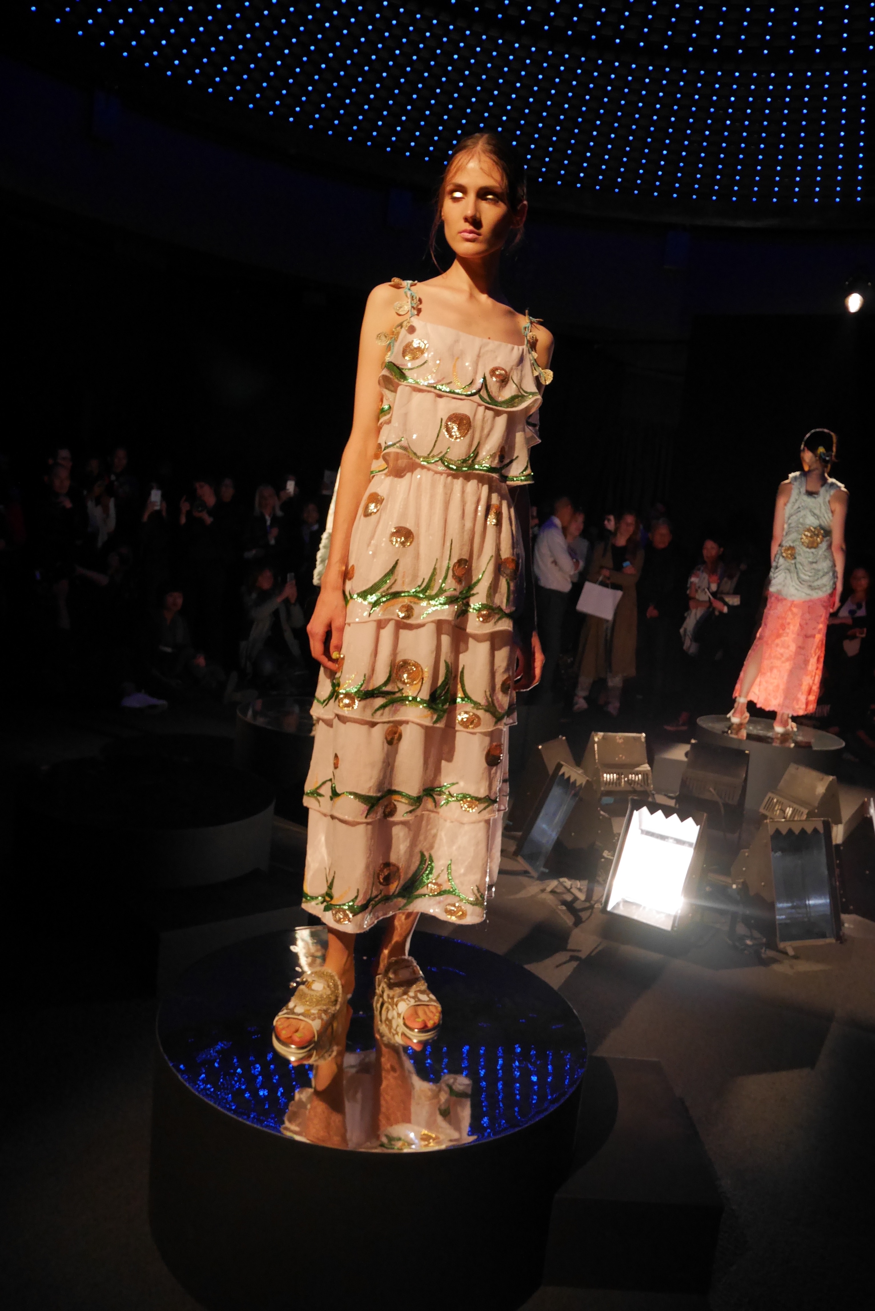 Sous les vagues, la richesse du monde marin devient une source nourricière d’inspirations qui s’entr’aperçoit au travers d’un masque de plongée. Touché par l’imaginaire vivifiant de Tsumori Chisato, le filet du chalutier devient un cadre à cette chasse précieuse. Un éclat d’or attire l’œil, révélant vite le trésor de quelque roi pirate oublié, dont les pièces d’or s’échappent d’un coffre enfoui. Des perles s’accumulent dans la semelle d’une sandale, leur nacre scintillant d’un rose tendre et lumineux.
