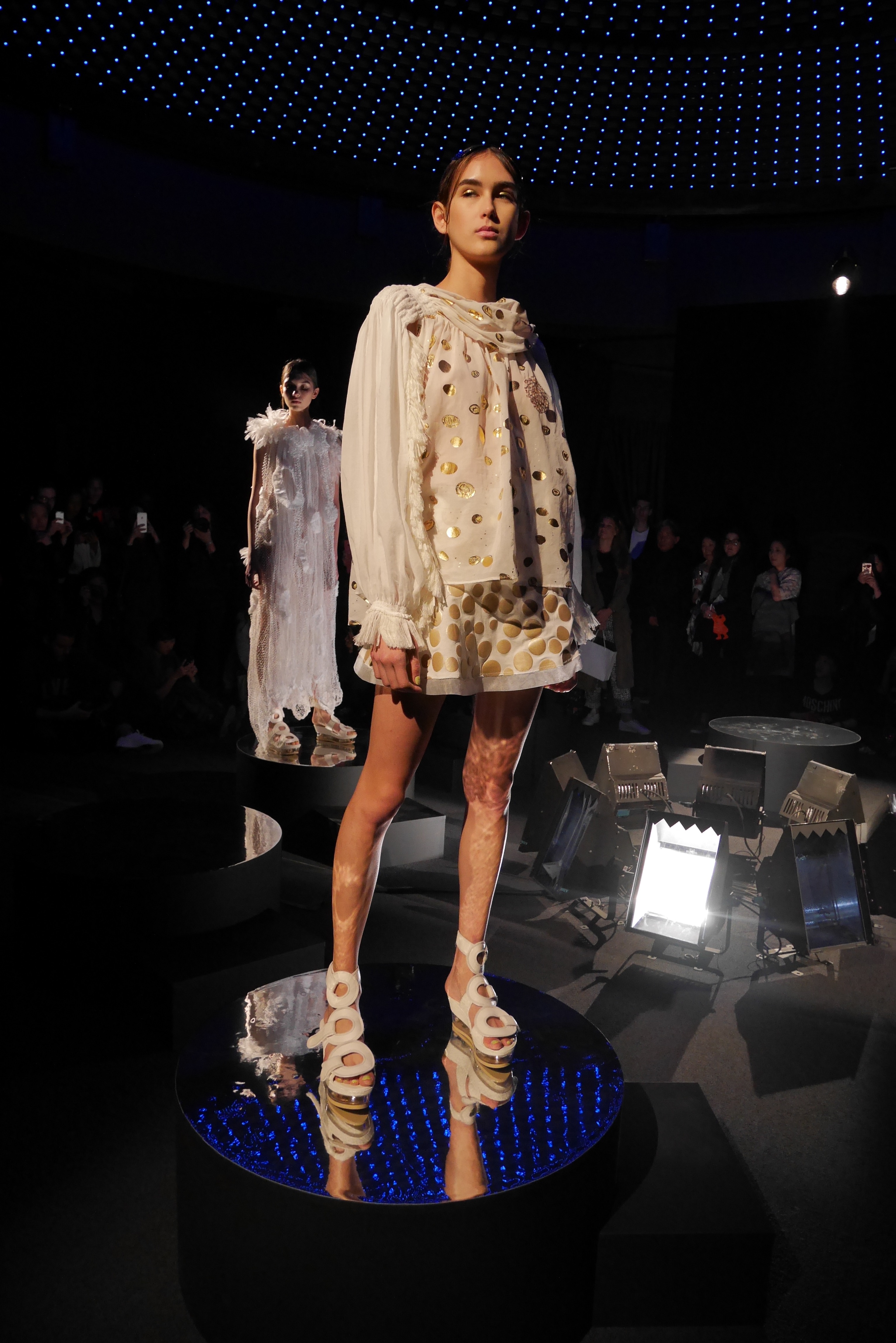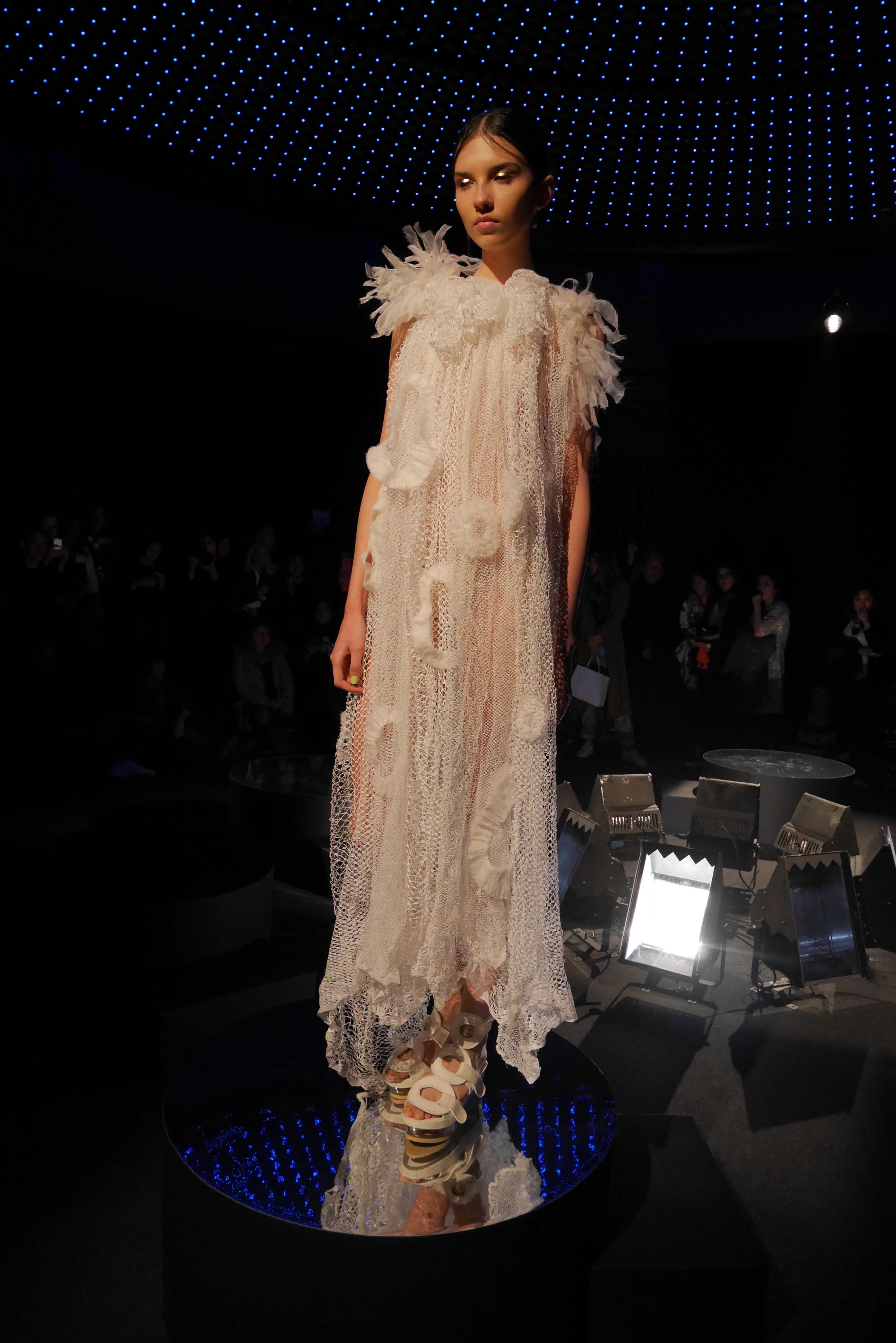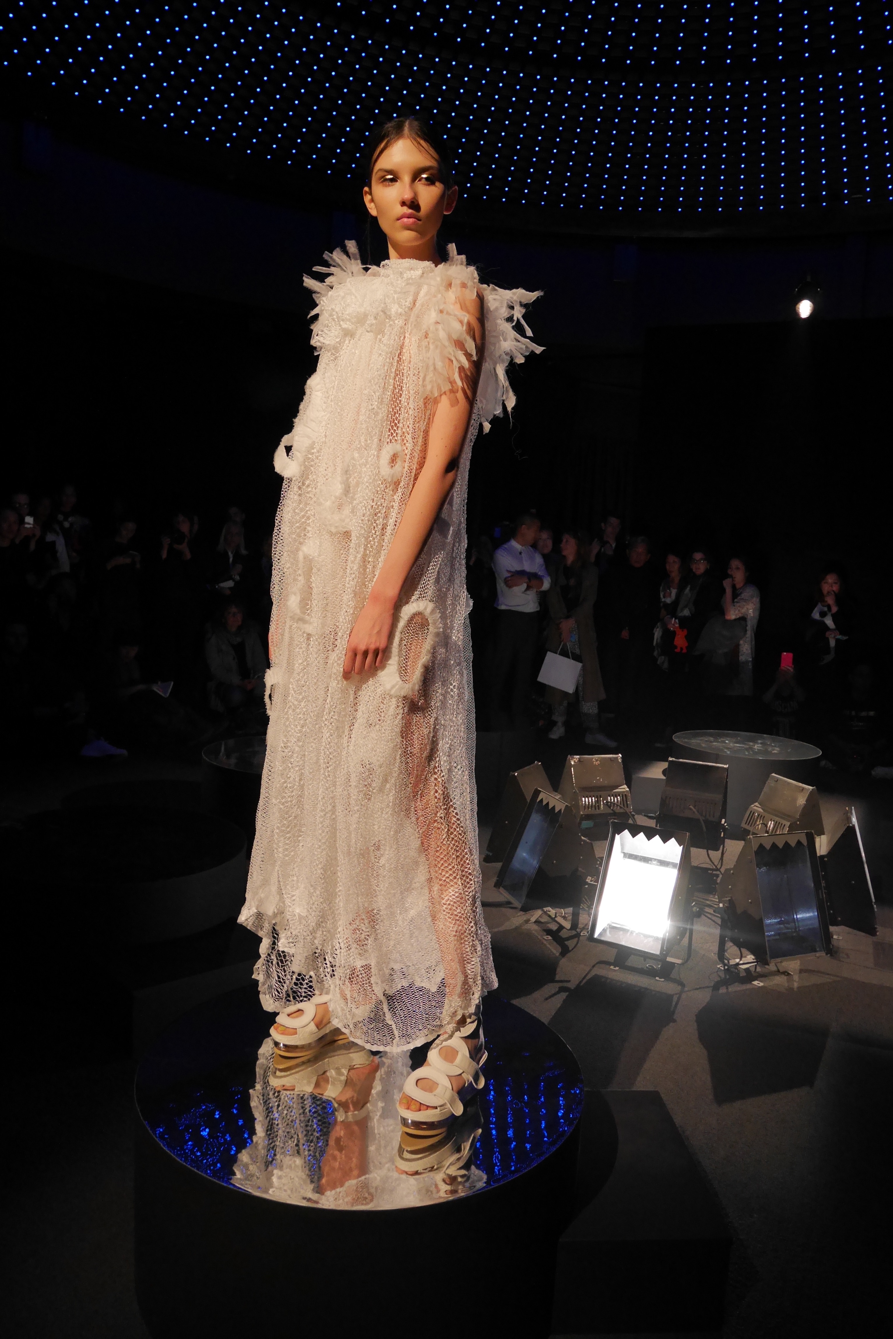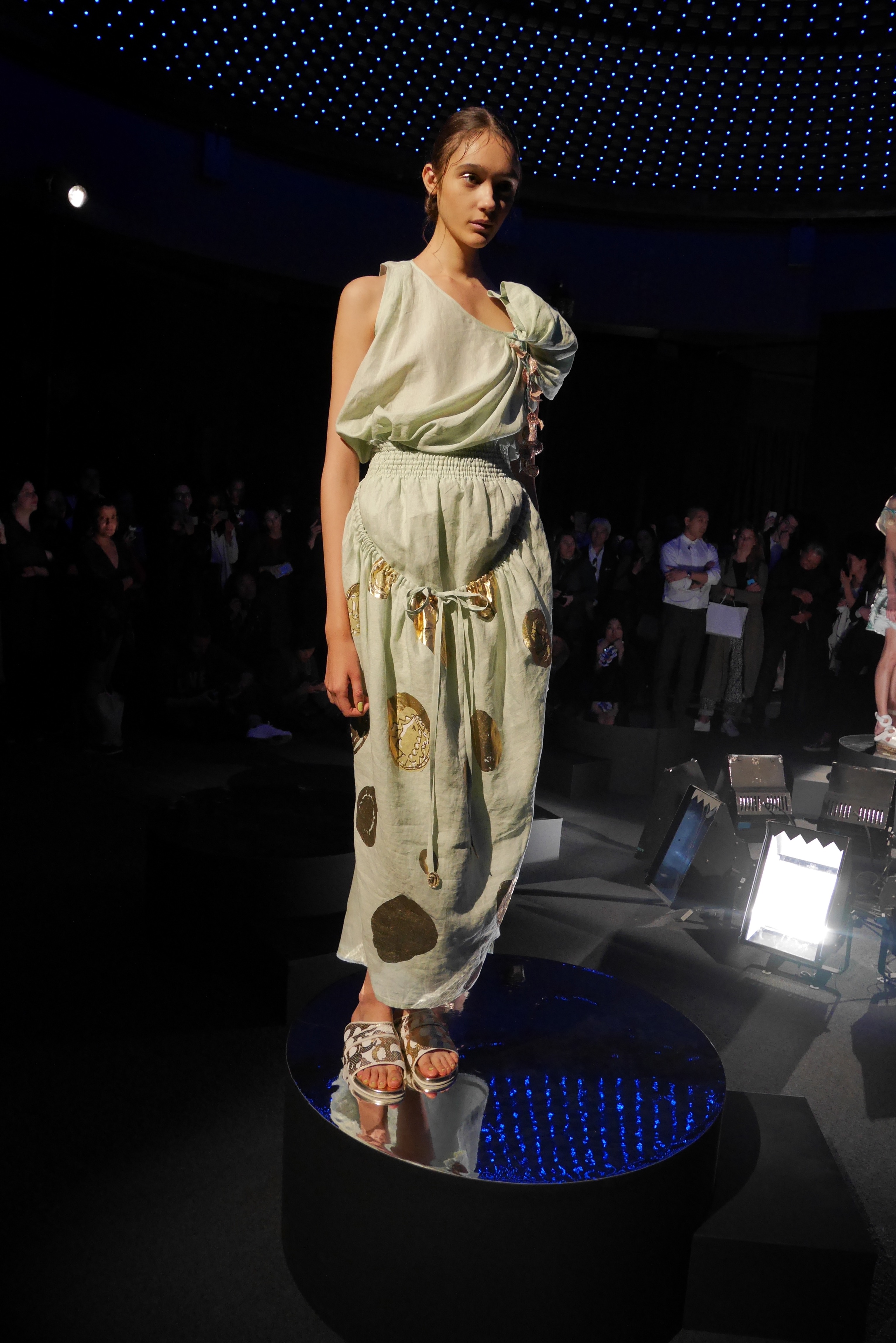 Sous les vagues, la richesse du monde marin devient une source nourricière d’inspirations qui s’entr’aperçoit au travers d’un masque de plongée. Touché par l’imaginaire vivifiant de Tsumori Chisato, le filet du chalutier devient un cadre à cette chasse précieuse. Un éclat d’or attire l’œil, révélant vite le trésor de quelque roi pirate oublié, dont les pièces d’or s’échappent d’un coffre enfoui. Des perles s’accumulent dans la semelle d’une sandale, leur nacre scintillant d’un rose tendre et lumineux.