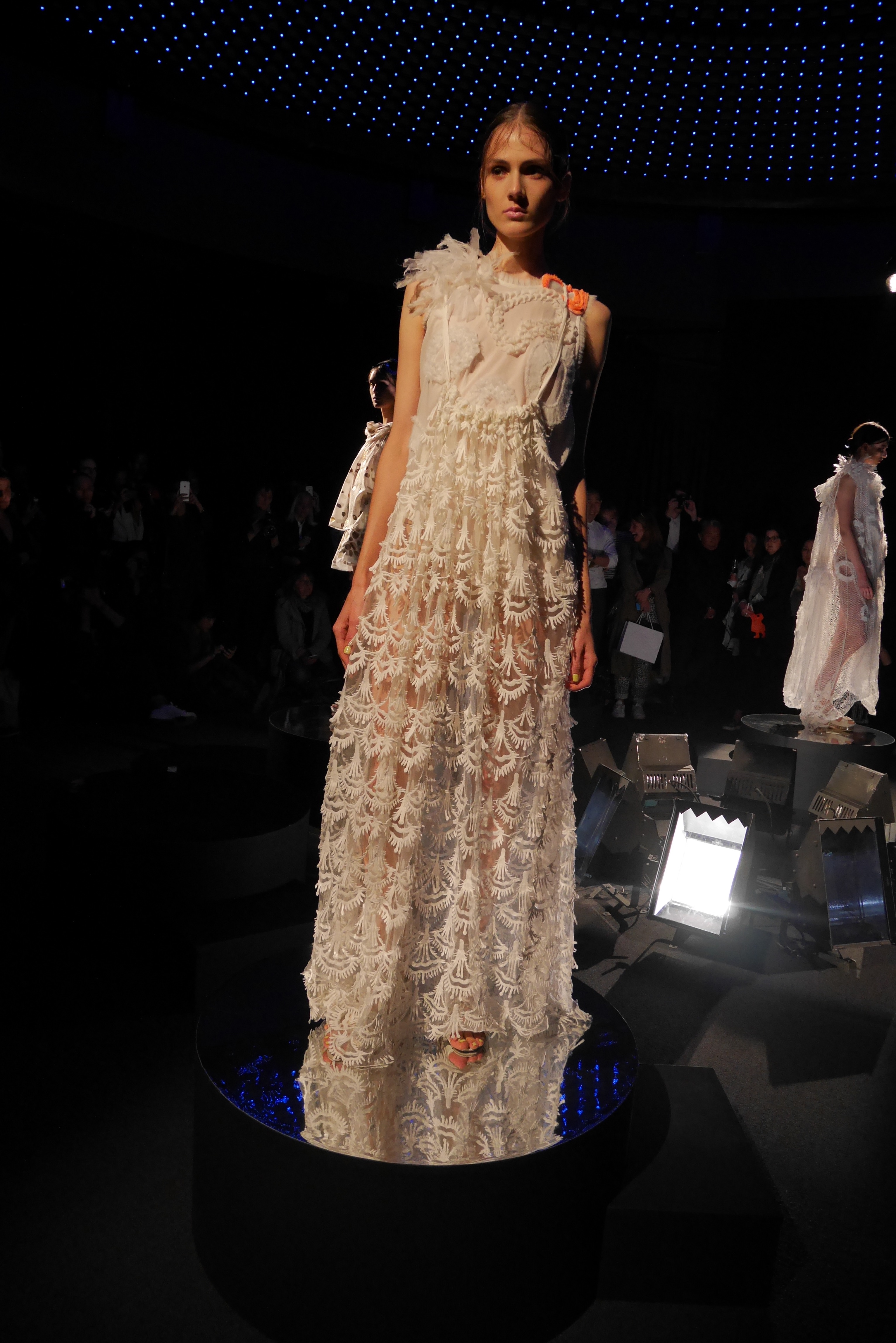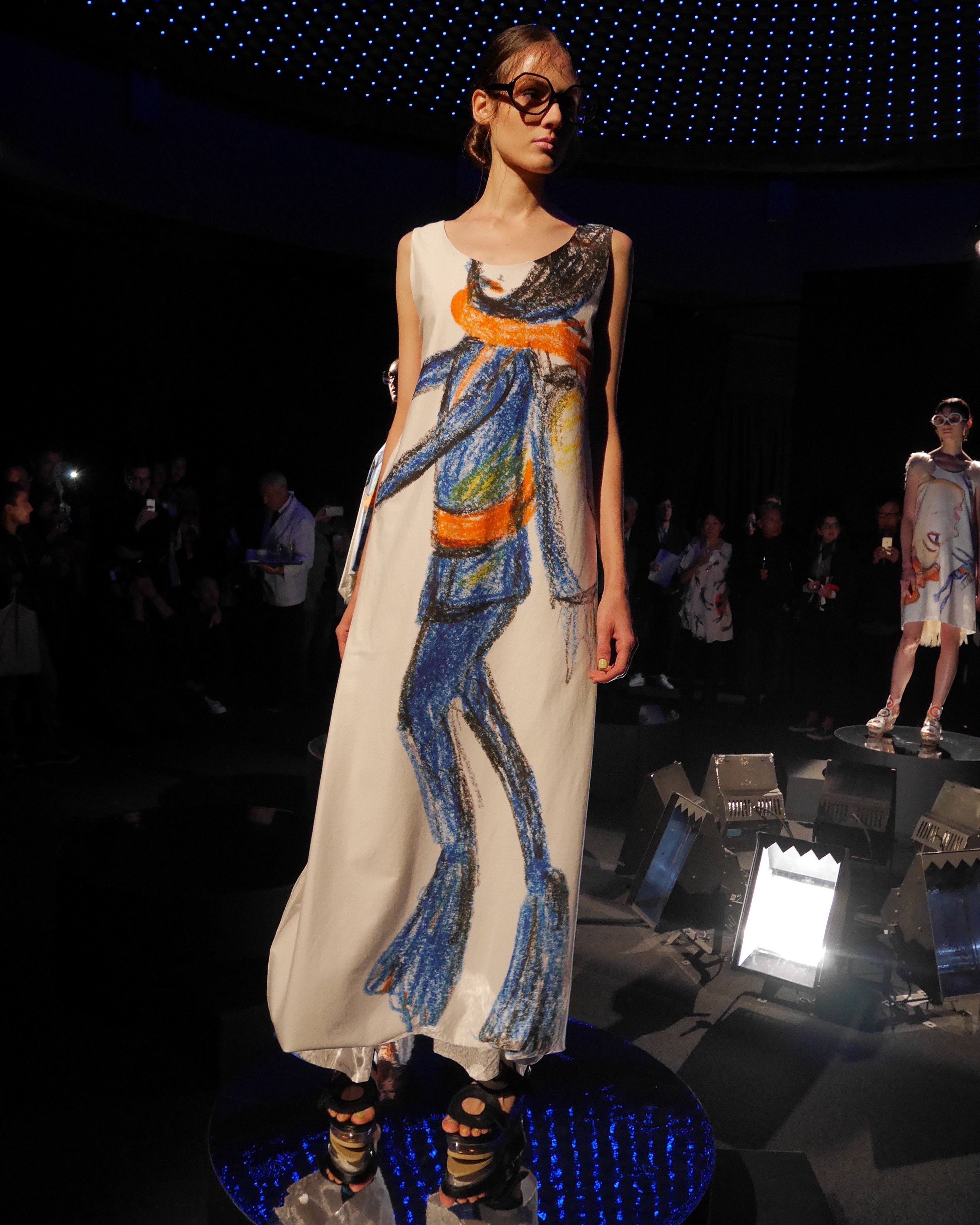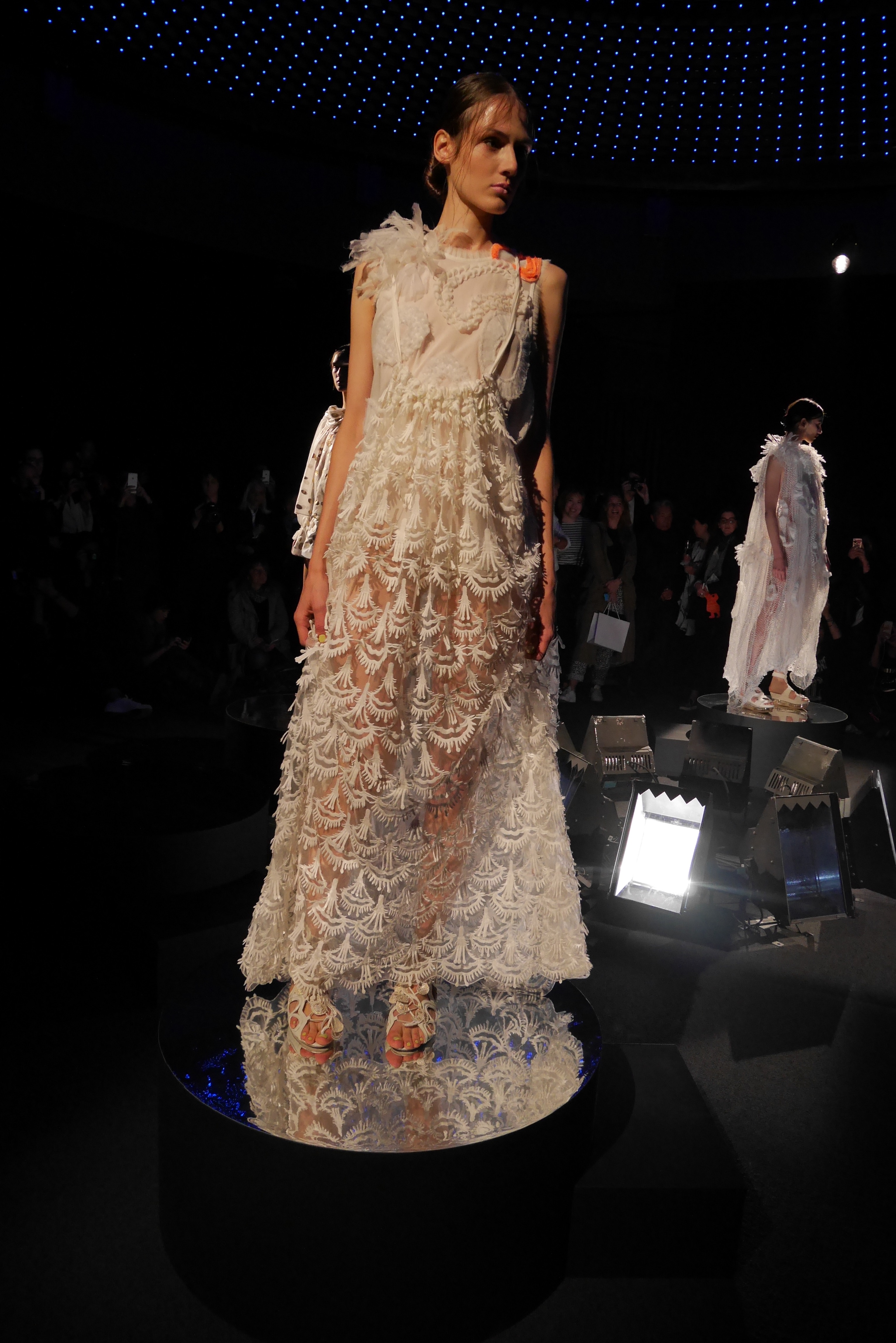L’élégance estivale est facile, confectionnée dans des cotons épais et des soies tactiles, en accord avec l’identité luxueuse de Tsumori Chisato. Comme pour rappeler les textures du monde sous-marin, les contrastes abondent. Une dentelle de coton vient rappeler le décor des grands fonds, tandis qu’une poche s’habille d’organza pour figurer les palmes du plongeur.