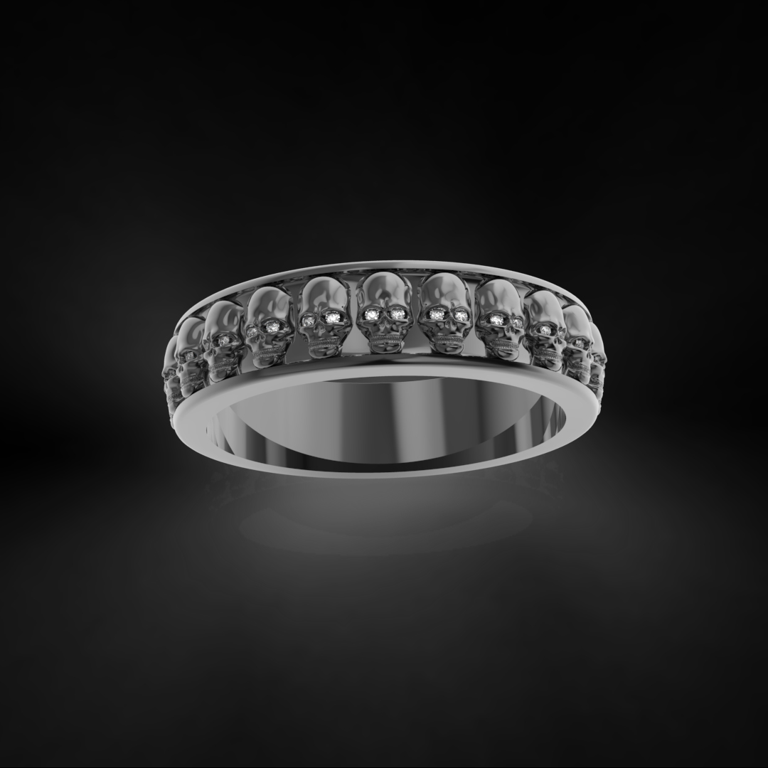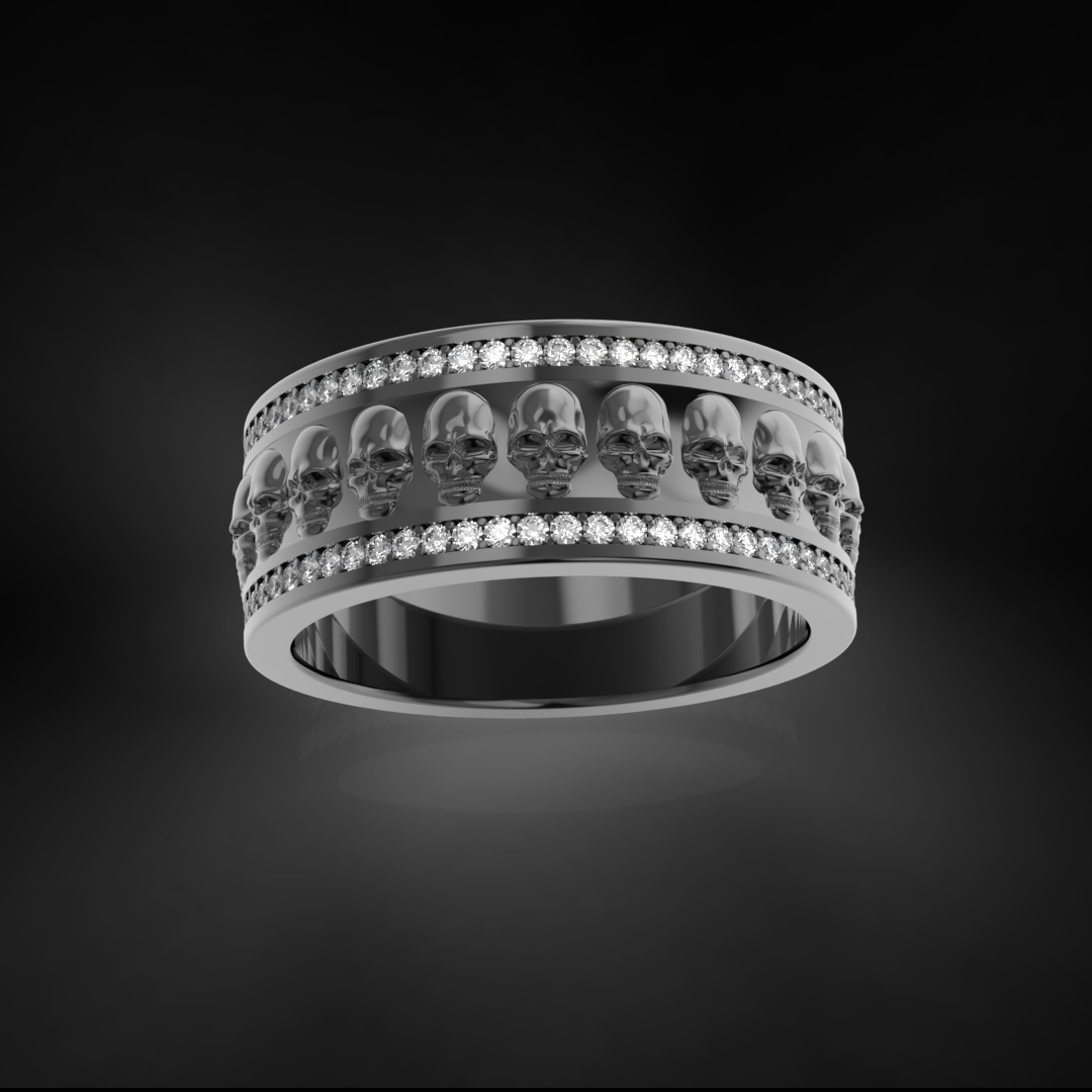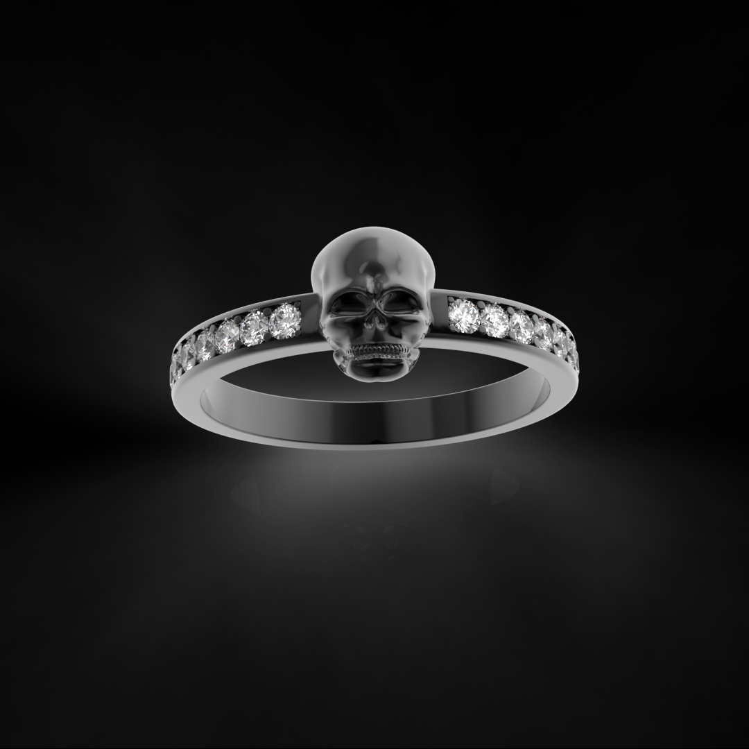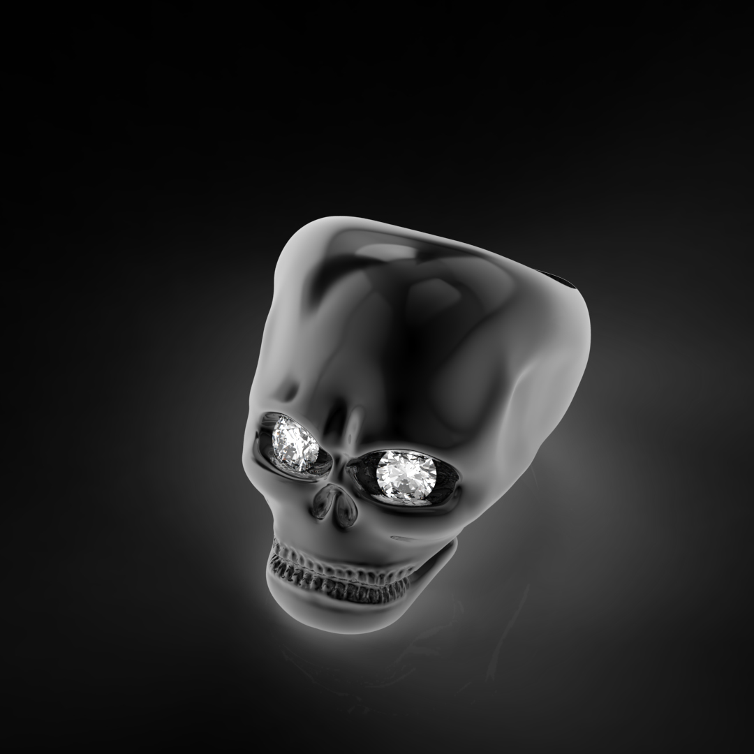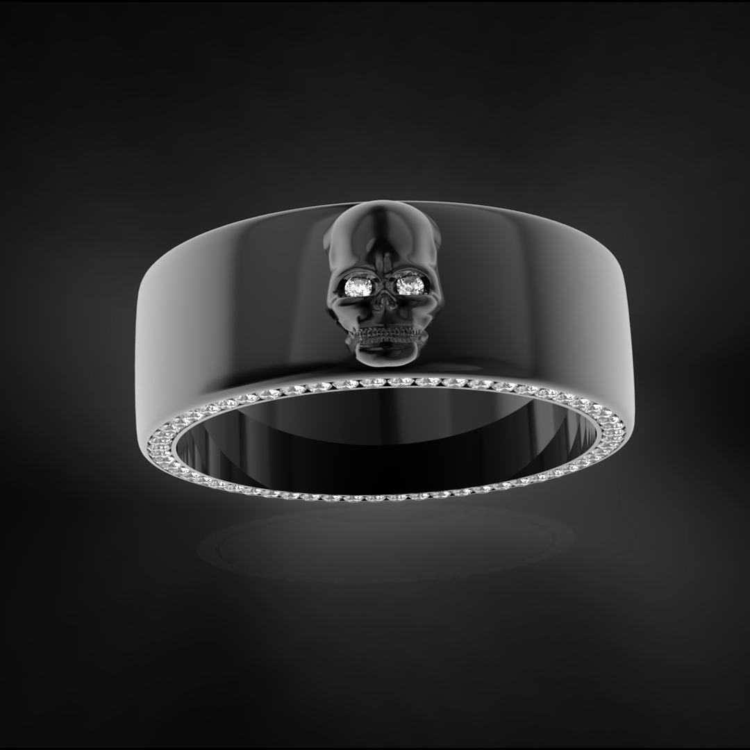 Son alliage épais composé exclusivement d’or noir et d’or blanc n’est pas surmonté d’une pierre précieuse, comme dans la joaillerie traditionnelle, mais d’une tête de mort en or incrustée de diamants. Un pavage de diamants subtilement placé dans l’épaisseur de la monture vient ajouter à ce bijou finesse et élégance.
