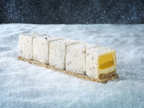 Une fine neige de noix de coco recouvre un soyeux qui laisse place aux saveurs exotiques : mandarine, mangue et passion se côtoient pour un rendu aérien et fruité, le tout sur une dacquoise coco.