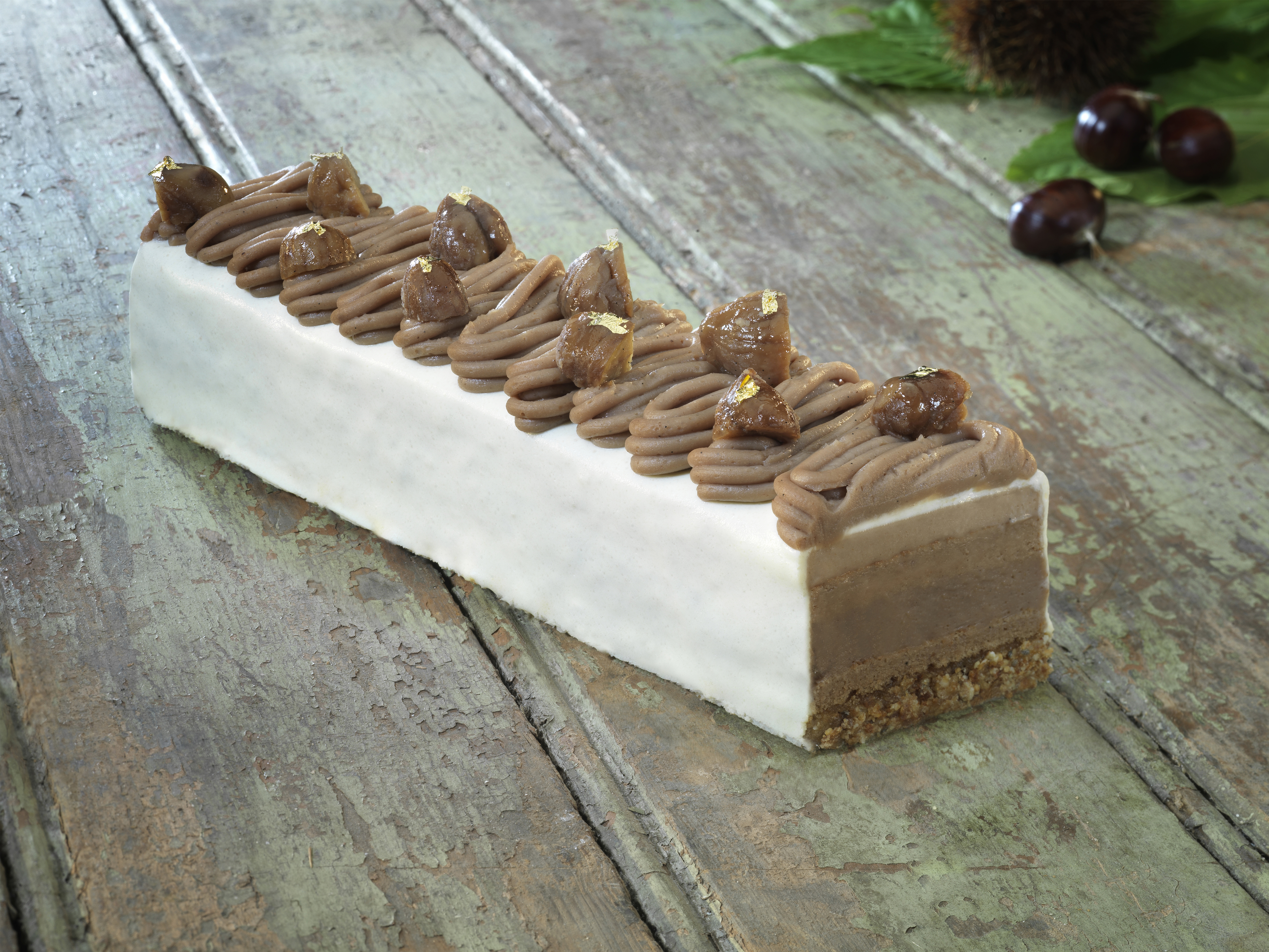 Une sublimation du marron par les textures : sous le glaçage de Noël et ses marrons brillants, découvrez une mousse, une génoise, une glace et un fondant aux marrons sur une base craquante de dattes et sarrasin.