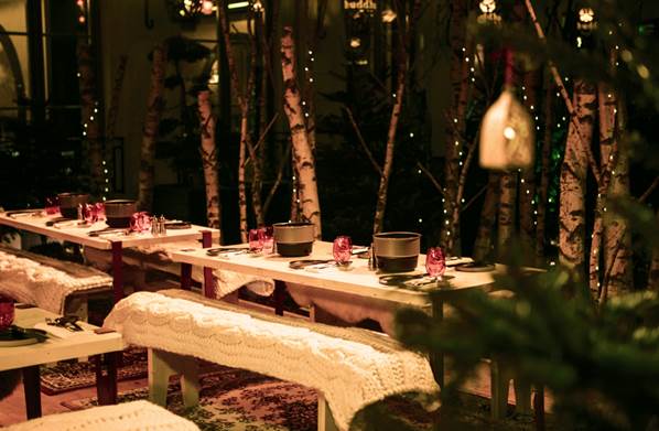 Pénétrez sur la terrasse de l’hôtel particulier par un chemin serpentant à travers une forêt de bouleaux. Les arbres enneigés s’élèvent, les sapins scintillent, dans des couleurs aux accents d’aurores boréales. Au centre de la forêt se déploie un lieu de restauration exclusif et chaleureux. La maison UGG® et le Buddha-Bar Hotel Paris ont imaginé un décor cocooning unique pour le bonheur du voyageur avide de découvertes : sapins illuminés, coussins, plaids et peaux de bêtes côtoieront tables de bois et décorations de fin d’année. Sur les tables d’hôtes, on sert le Shabu Shabu fumant. Fondue chinoise d’origine mongole où se mêlent dans un bouillon épicé et salé des ingrédients de premier choix : poissons, viandes, légumes et Dim Sum. Les marmites se partagent entre deux et six personnes !