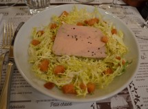 La salle est restée dans son jus. Un vrai décor de cinéma. Banquette en moleskine, affiches vintage qui nous replonge en enfance. Le chef de salle a beaucoup d’assurance et connaît son affaire. En entrée, le foie gras est parfait avec sa petite salade des gones. La carte offre une beau panorama de la cuisine lyonnaise.