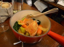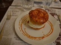 Le fricassé de poulet est parfait. Un plat solide. La cuisson juste. Les petits légumes sont savoureux et croquants. Un vrai régal. Le sommelier est très avenant et n’hésite pas à faire une belle explication de texte à chaque vin servi :  Bourgogne, Château-Neuf-du Pape, Condrieu. Une belle palette de vins pour accompagner cette cuisine. En dessert, le gros chou au beurre salé est divin.
