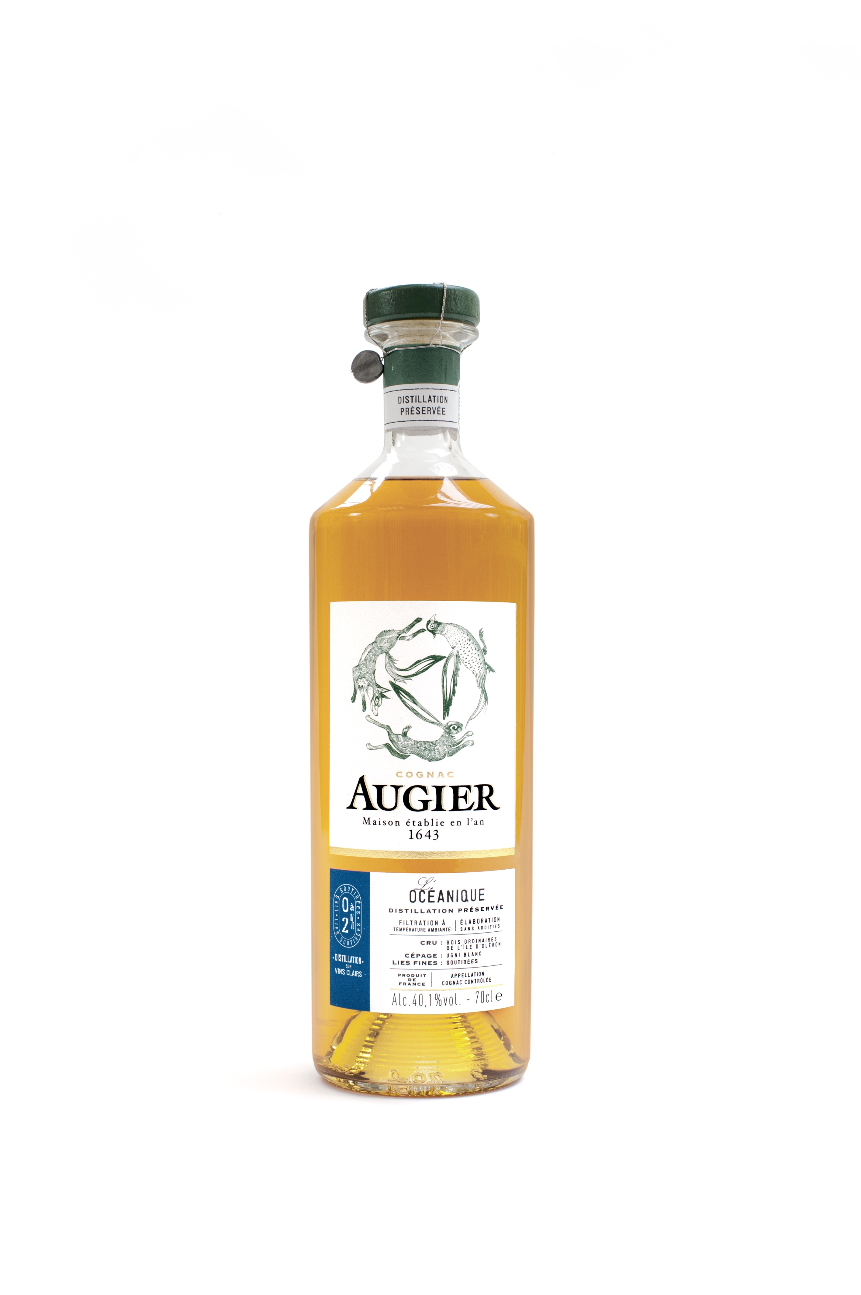 Les flacons sont illustrés d’un emblème empreint d’histoire dont la gravure évoque la nature cognaçaise riche et sauvage du XVIIème siècle. Ils ont la forme originelle de la « montre », bouteille traditionnellement utilisée pour présenter ses eaux-de-vies au Maître de Chai. Ils sont par ailleurs scellés d’un muselet dont l’usage symbolise la méthode de distillation préservée que la maison met en œuvre pour tous les cognacs de la Maison Augier.
