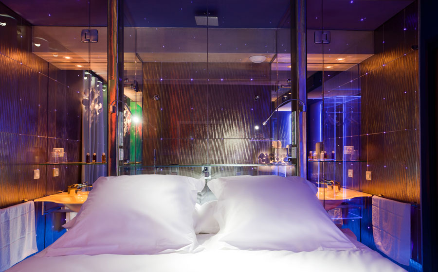 Dans les chambres Plus près des étoiles, l’illusion est parfaite ! Le lit flotte au milieu de la pièce, comme en lévitation, adossé à une cabine de douche lumineuse. La fibre optique complète l’atmosphère unique de cette cabine spatiale, promesse de magie et de voyage à profusion pour un séjour dans les étoiles !