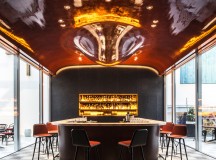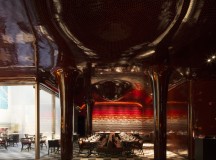La Salle à Manger, néo-brasserie chic, où sont sensibles les réminiscences du légendaire restaurant des Bains Douches. Au sol, les arabesques florales originelles fin-de-siècle retrouvent par morphing et pixellisation le dancefloor en damier noir et blanc Cold Wave créé par Philippe Stark en 1978 puis, par les mêmes effets, deviennent troubles comme inondé – ici, marcher sur l’eau, c’est traverser le temps. Au plafond ondulent dômes et rotondes, dont la pourpre fait ressortir l’acajou des tables.