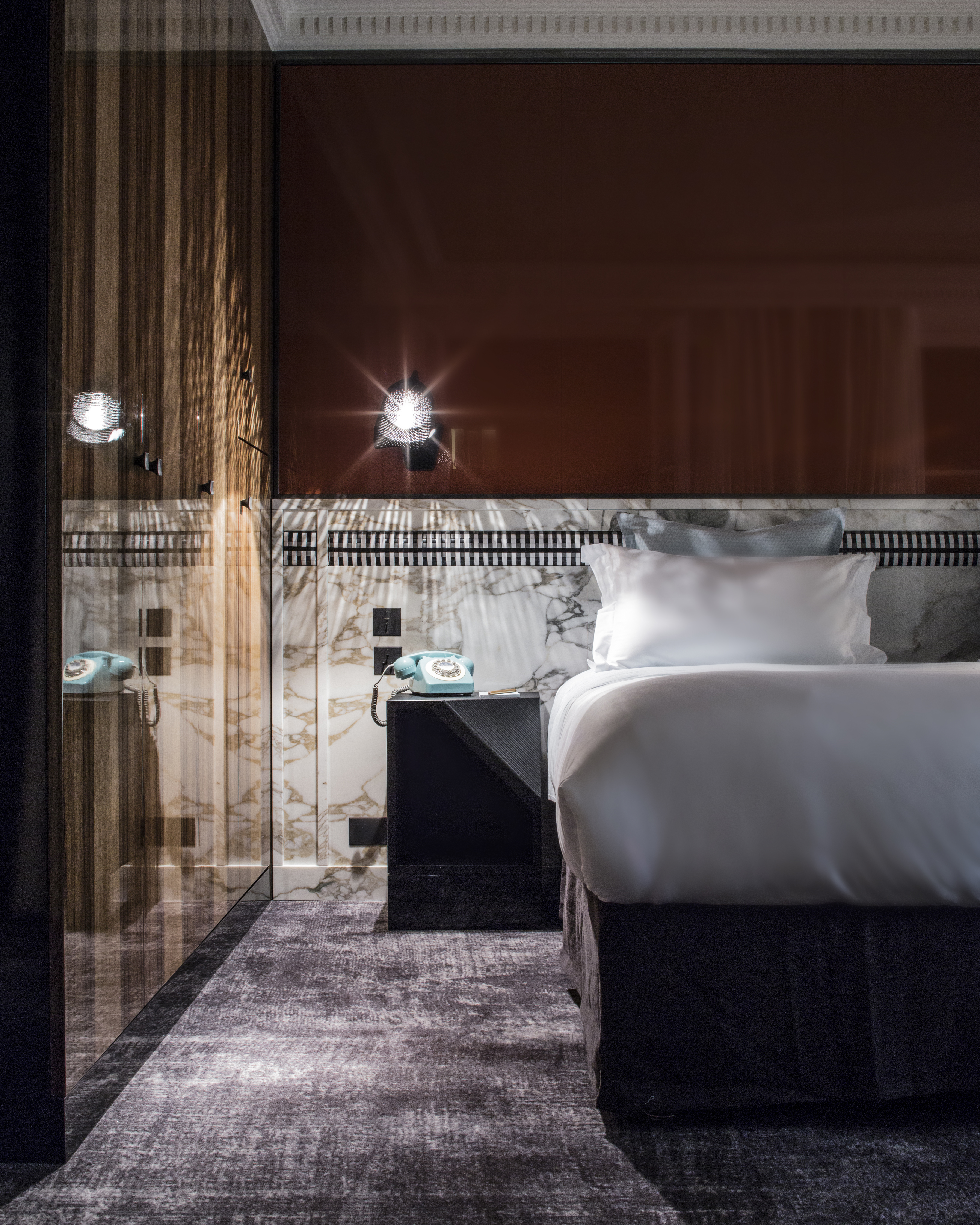 subtilement uniques, brassent des matériaux choisis, entre marbres blancs et bois précieux, ainsi qu’un mobilier raffiné sur mesure, référencé, en hommage à ses hôtes de marque, moquette gainsbourienne et réplique de canapé wharolien. Entre les pochettes de vinyle Joy Division, les sirènes des Bains qui égaient de leurs facéties les panneaux « do not disturb » et un beauty case concocté aux petits soins, l’ensemble préserve cette touche de transgression