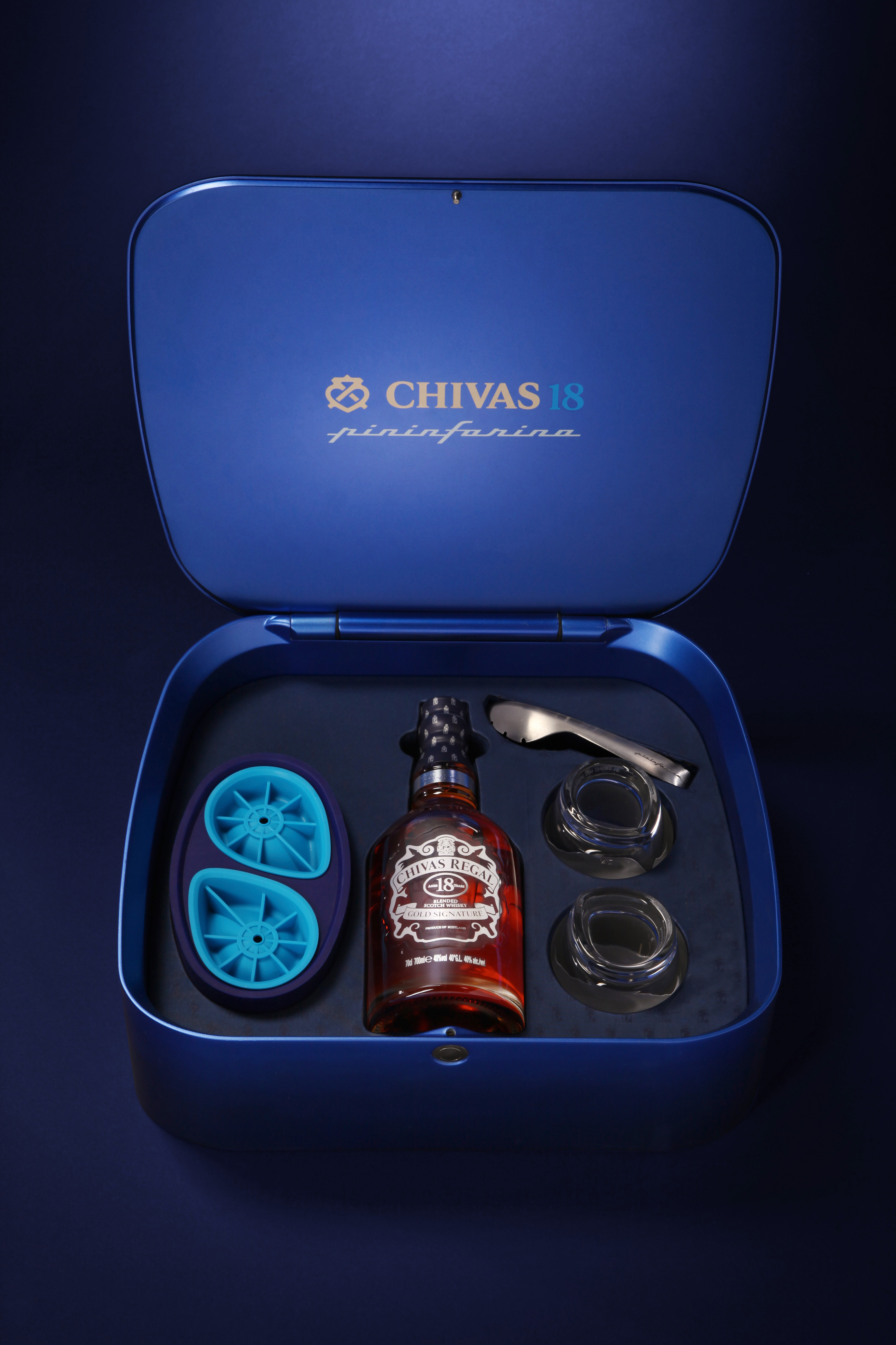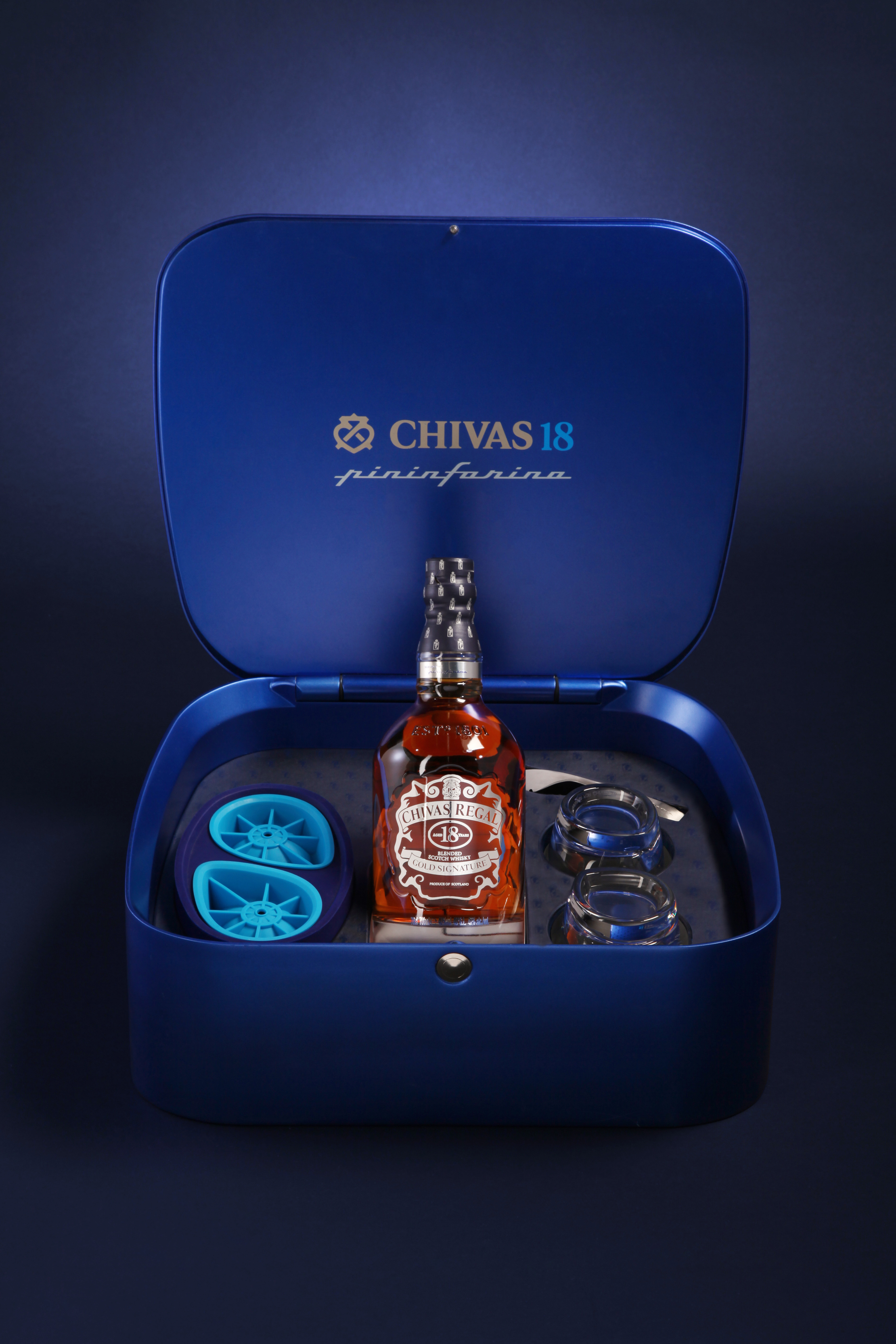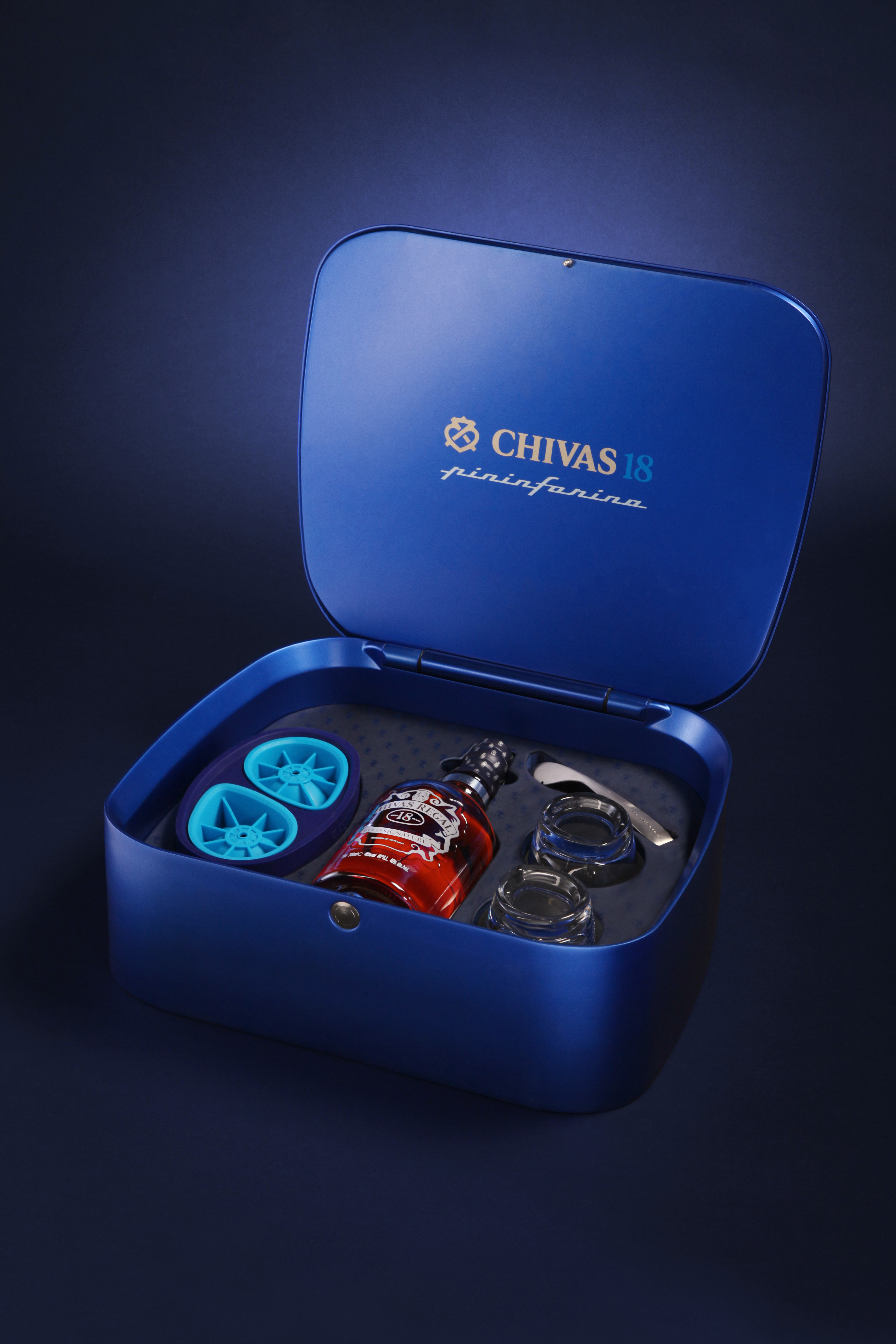 Cet écrin bleu métallique captive le regard par son élégance et sa puissance de caractère. Un coffret pour reproduire chez soi le nouveau rituel de dégustation « The drop » : une bouteille de Chivas Regal 18 ans d’âge griffée Pininfarina, deux verres à dégustation, deux coques « The Drop » et une pince.