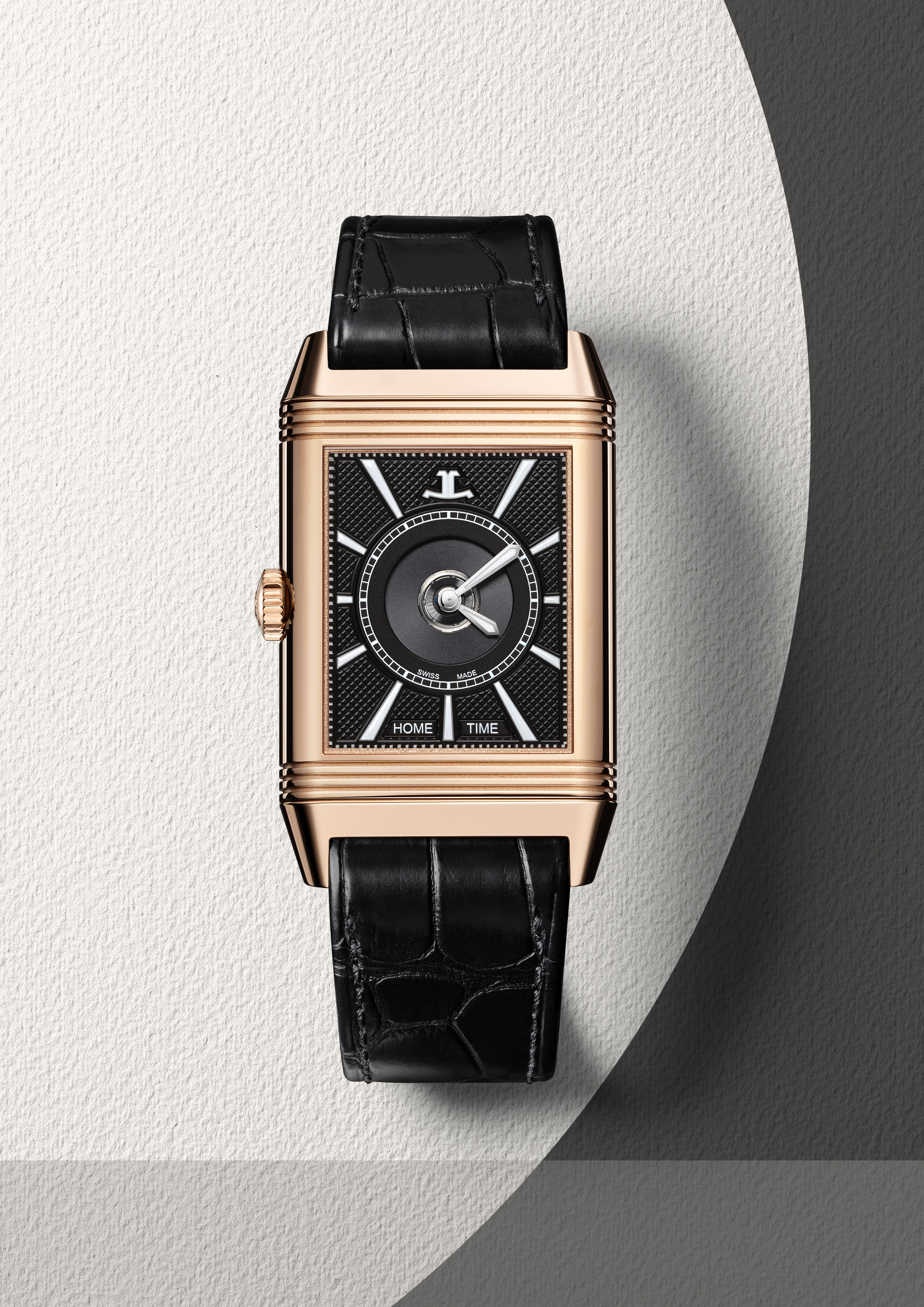 Sur le cadran brossé et guilloché du recto se découpe à 6 heures un indicateur jour/nuit. Au verso, le cadran noir aux finitions « clous de Paris », où se détachent de larges index frappés, arbore le « home time ». En lieu et place du traditionnel chiffre 12, l’ancre symbolisant Jaeger-LeCoultre domine cette composition en soleil qui contraste avec la linéarité du recto de la montre. Autre effet de surprise, le second cadran révèle en son centre la présence discrète mais tangible de la masse oscillante qui évolue librement.