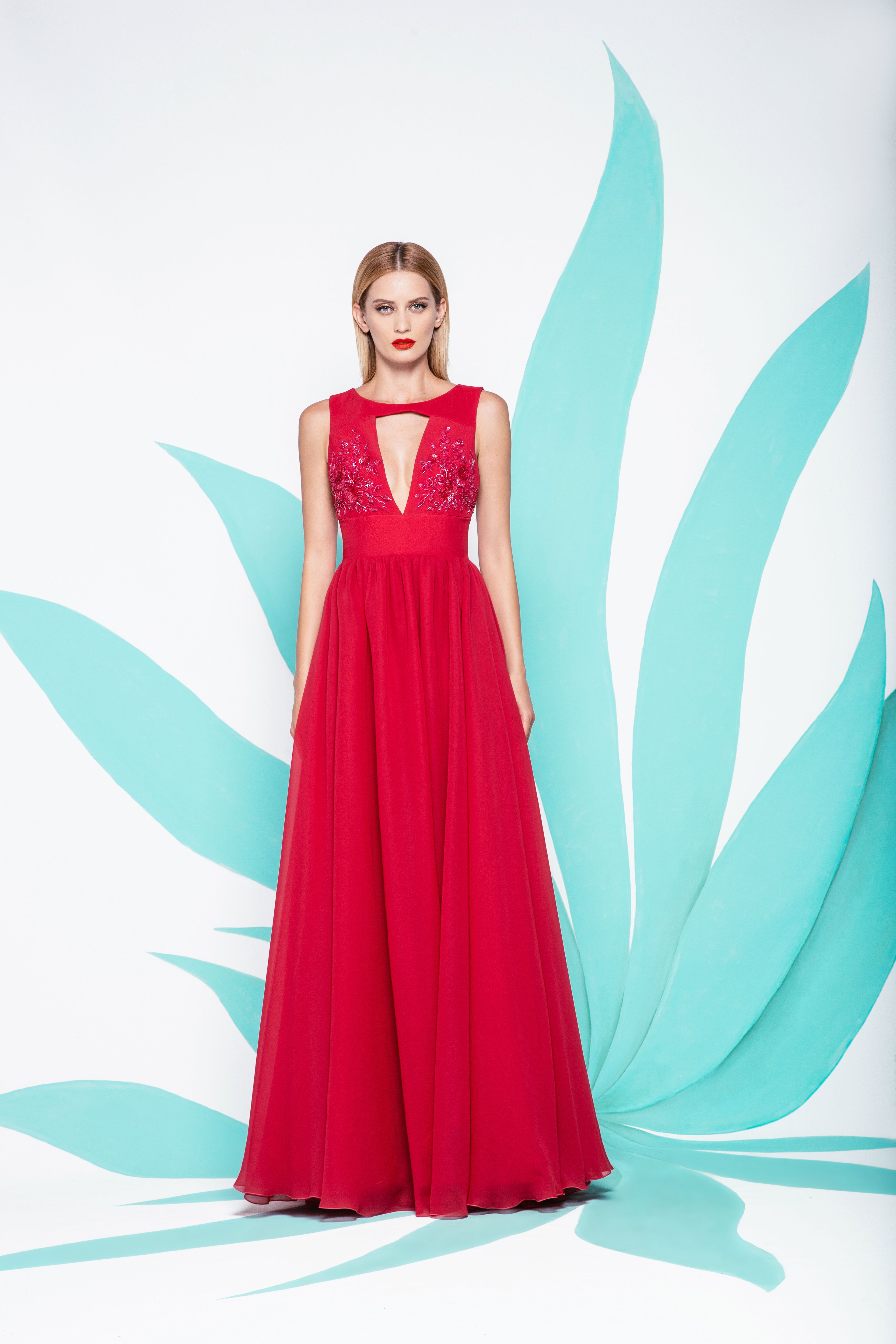 Fascinantes interprètes de cet état d’esprit estival et joyeux, les couleurs vives et gourmandes infusent leurs ardentes énergies sur des imprimés de plantes vigoureuses et charnues, comme venues de déserts brulants, mais aussi sur des fleurs vivaces dessinées par le couturier lui même, avant d’être peintes à la main.
