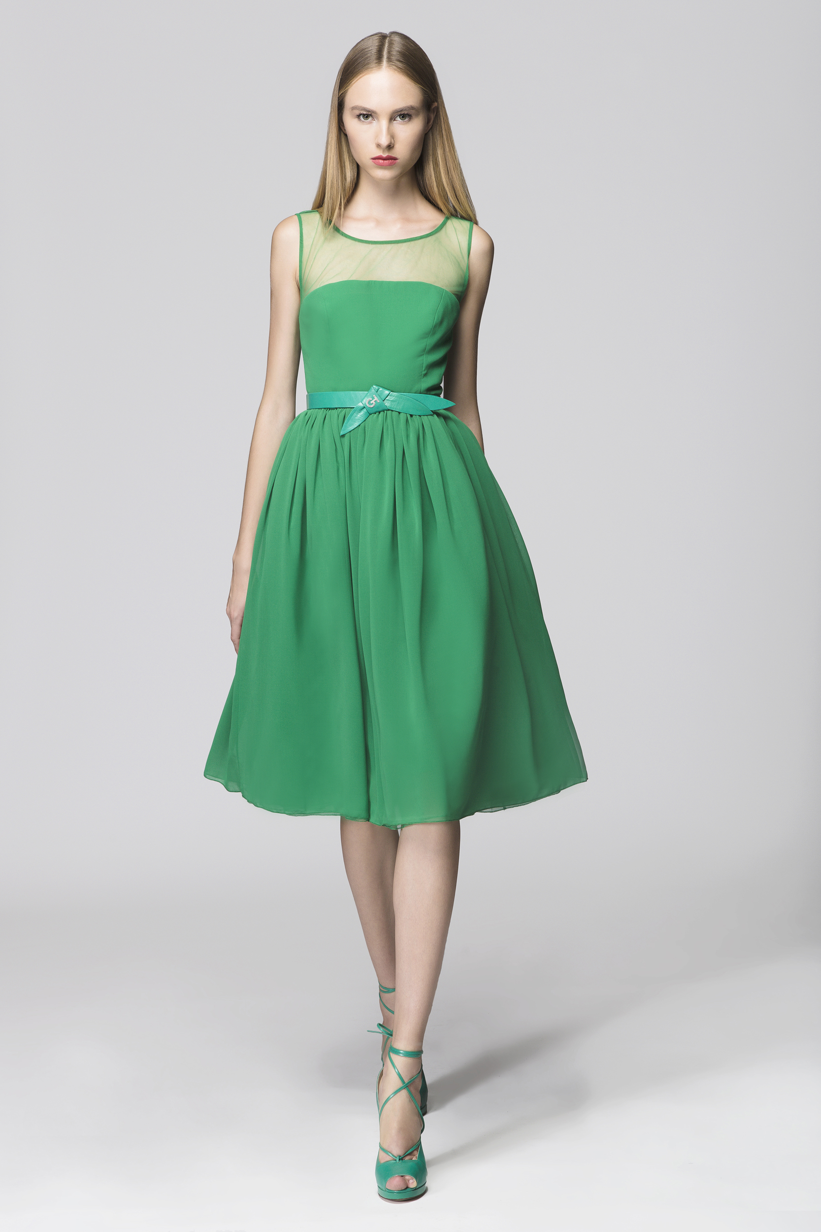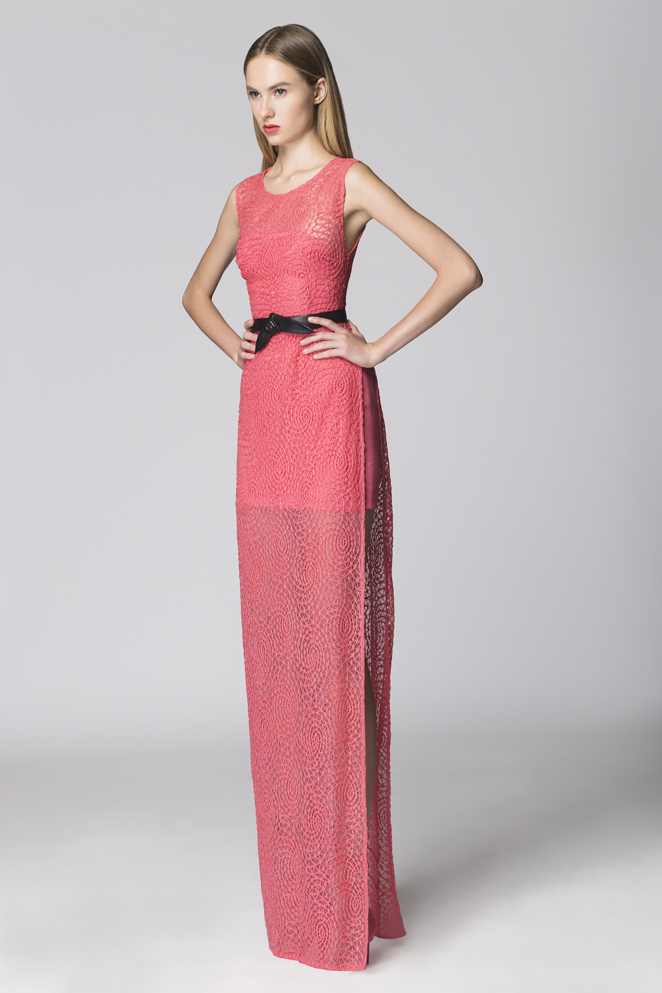 Cette philosophie balnéaire injecte son manifeste d’allégresse et de joie de vivre sur des étoffes fines et virevoltantes – ziberline, dentelle brodée, mousseline imprimée, tulle – parées pour la villégiature et la croisière ; sur des broderies flamboyantes, parfois dissimulées comme un trésor caché, dans une découpe délicate et imprévue ; sur la transparence du tulle qui se superpose à l’envi sous un top bustier. Le soleil semble promener ses reflets dorés sur les rayures transat tandis que les tailles fuselées ajoutent une notion de vitesse et de dimension sportive à des robes tuniques, conçues pour le mouvement et le plaisir.