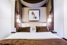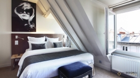 Parce que Paris a la réputation d’héberger les plus belles femmes du monde, cette chambre accueille ses occupants avec le grand portrait d’une parisienne qu’on croirait tout juste revenue d’un défilé ! D’ailleurs, les tapis rouges sont là aussi !
