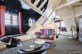 Christian Lacroix lui-même aurait pu s’inspirer de cette chambre aux atours spectaculaires ! Ce nid d’amour perché sous les toits du Marais s’habille de murs blancs, imprimés ou laqués de noir, comme pour mieux mettre en scène chaque poutre, apparente, et chaque lucarne, rayonnante.