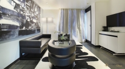 Spacieuse, blanche, lumineuse, cette chambre est signée Olivier Lapidus. Au cœur du salon, un canapé et deux fauteuils très design, en cuir noir, trônent devant un immense tableau plein de nuances grises et argentées.