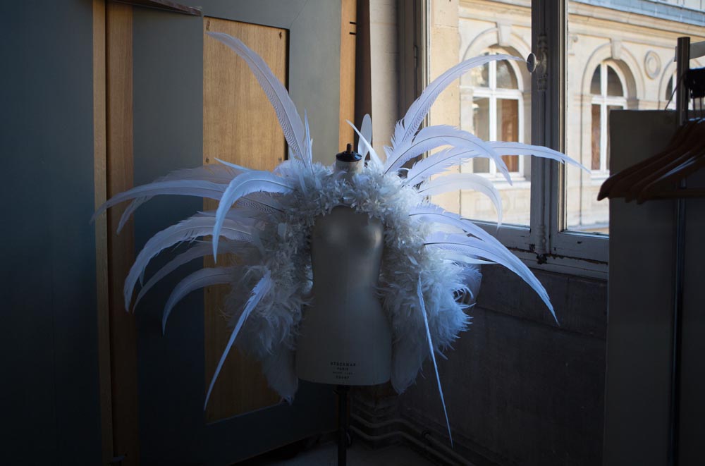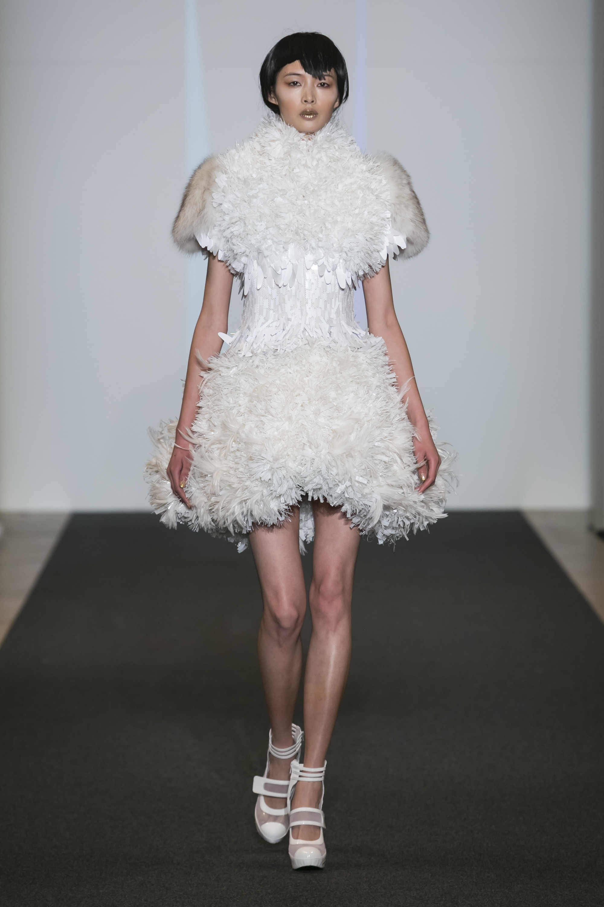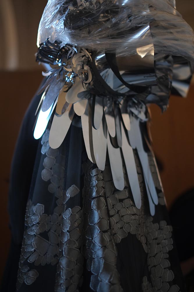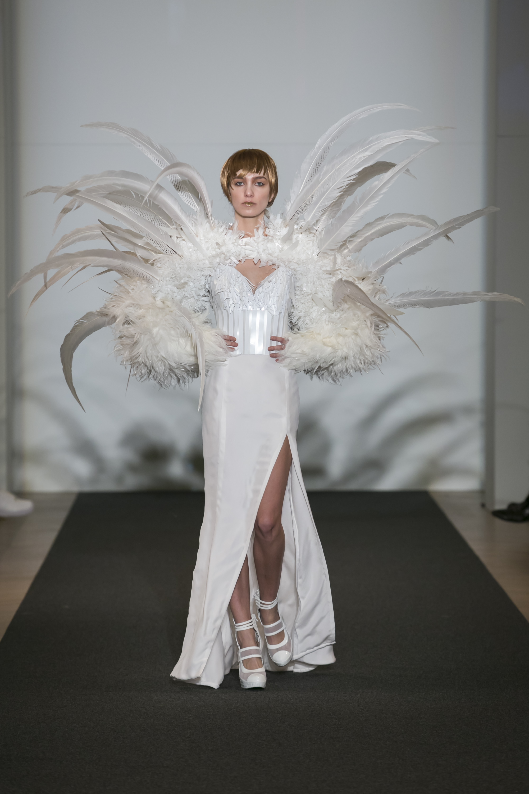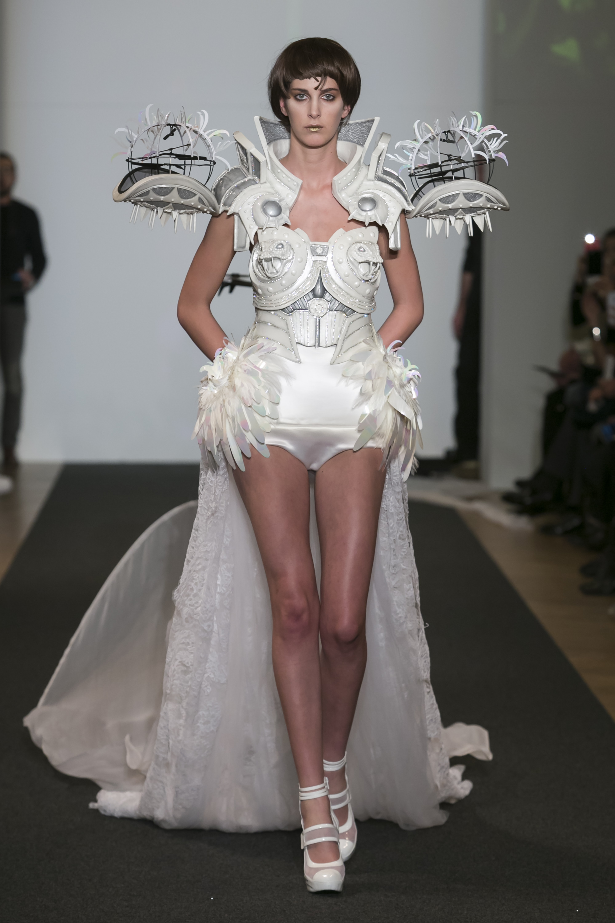 Galons frissonnants et pétales abstraites de rhodoïd ponctuent cette collection aux formes futuristes et aux mouvements intemporels. La douceur de la soie, la dentelle évaporée et les plumes délicates flottent dans un temps suspendu. A la manière d’une peinture surréaliste, les formes et les silhouettes s’opposent et se complètent.