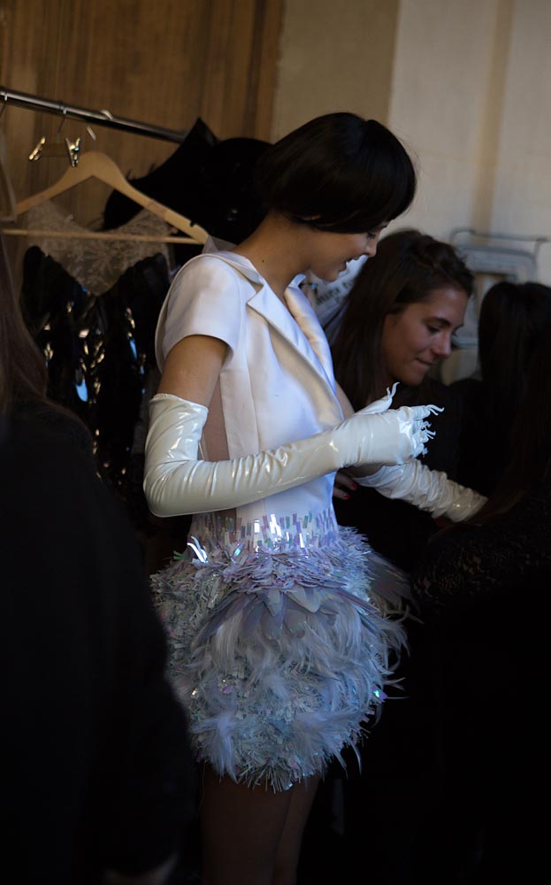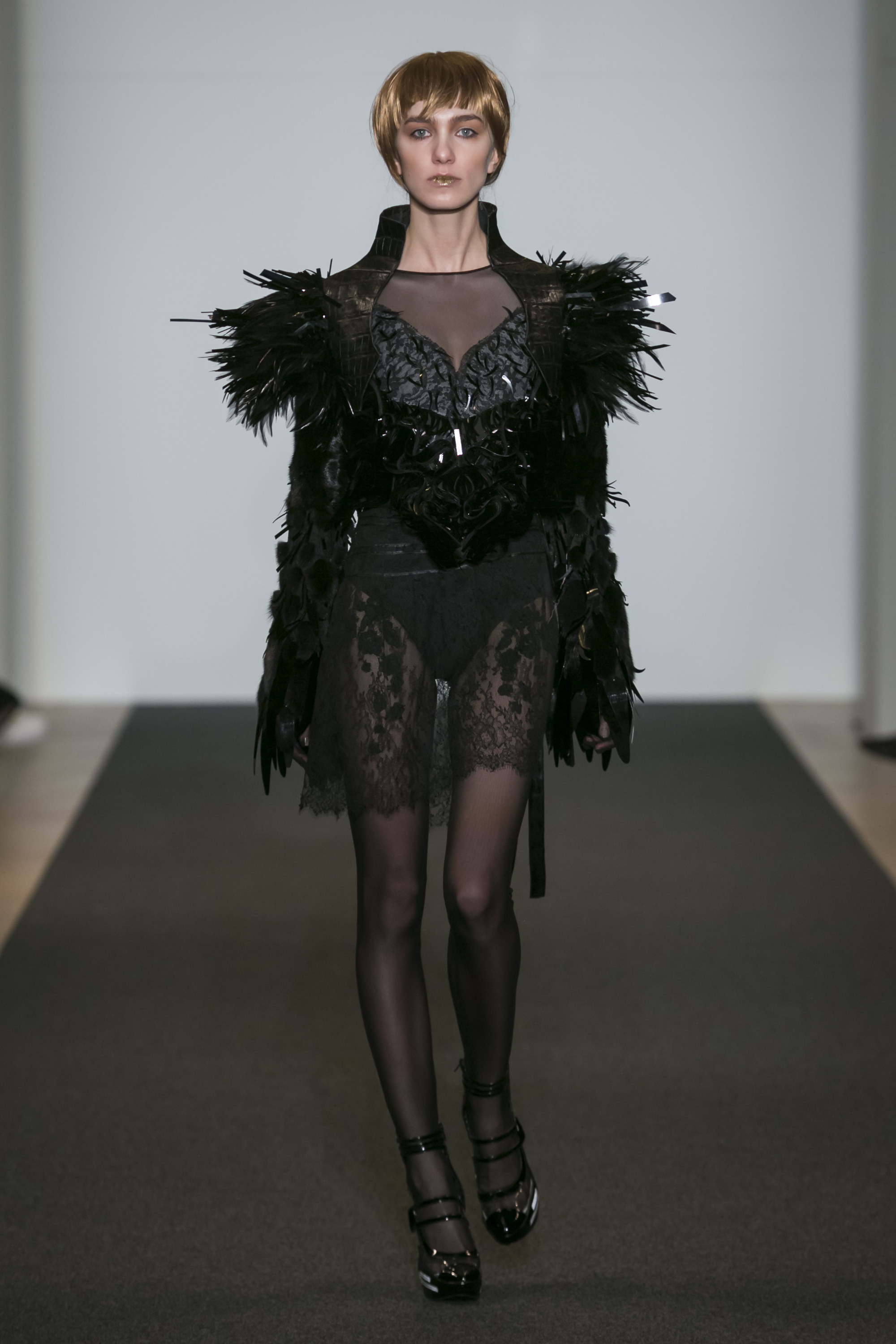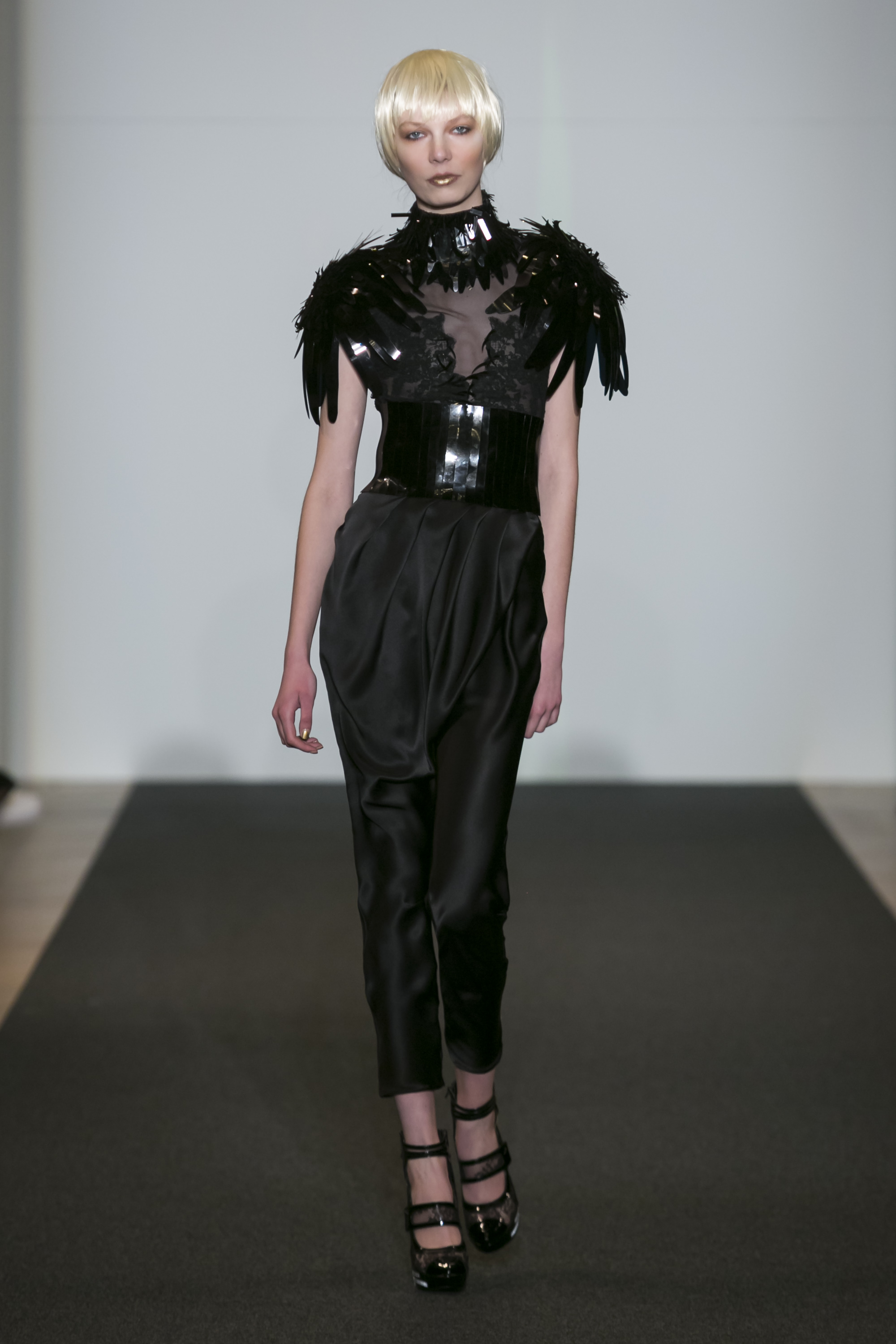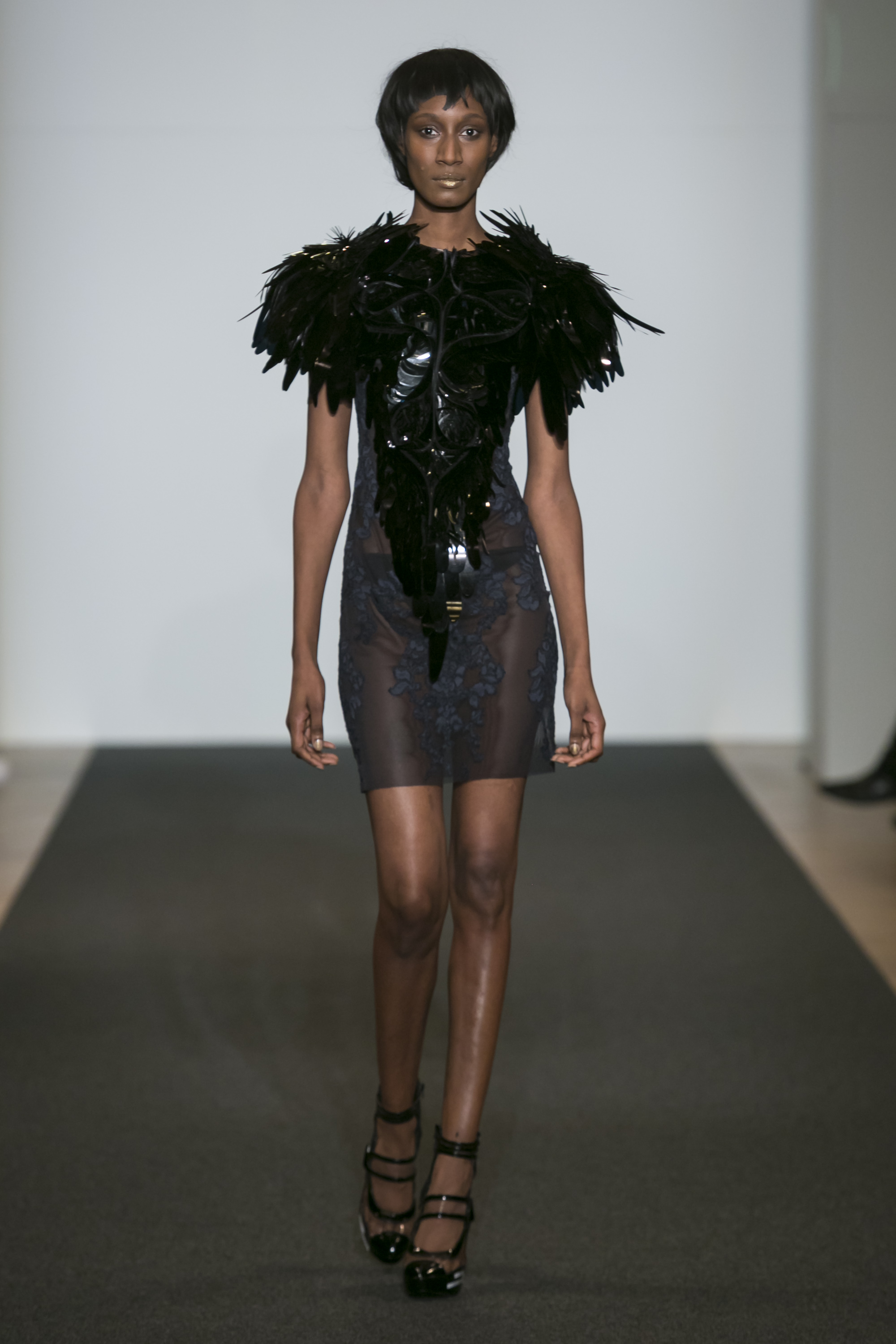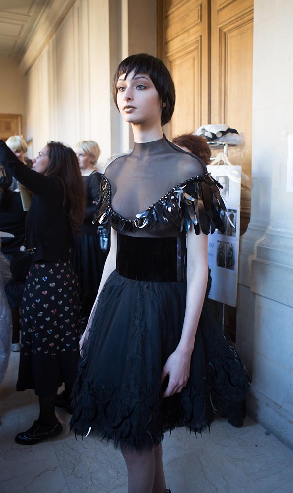 Galons frissonnants et pétales abstraites de rhodoïd ponctuent cette collection aux formes futuristes et aux mouvements intemporels. La douceur de la soie, la dentelle évaporée et les plumes délicates flottent dans un temps suspendu. A la manière d’une peinture surréaliste, les formes et les silhouettes s’opposent et se complètent.