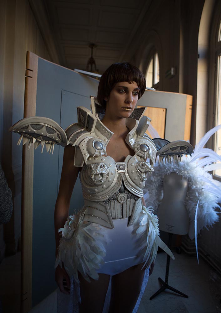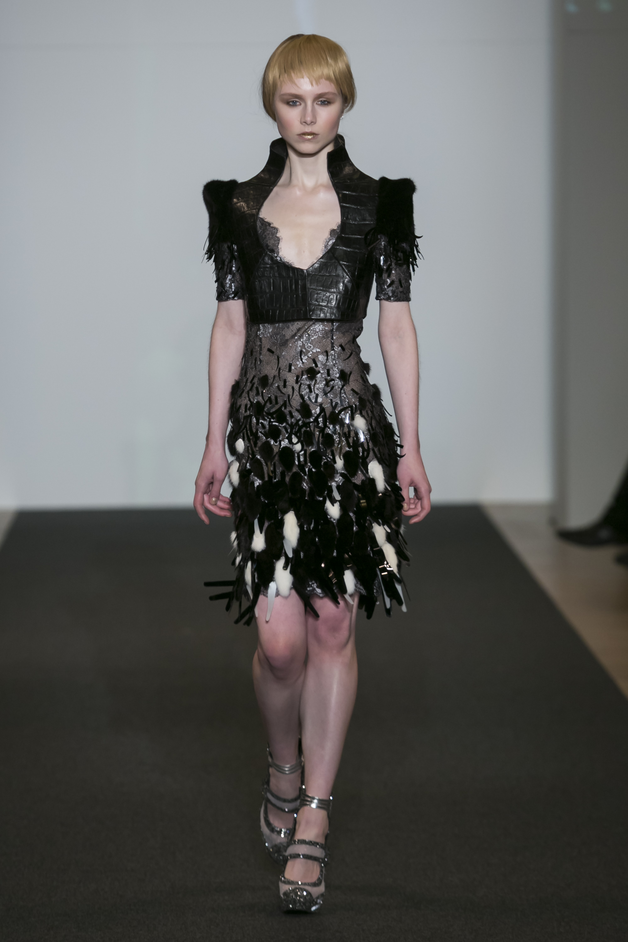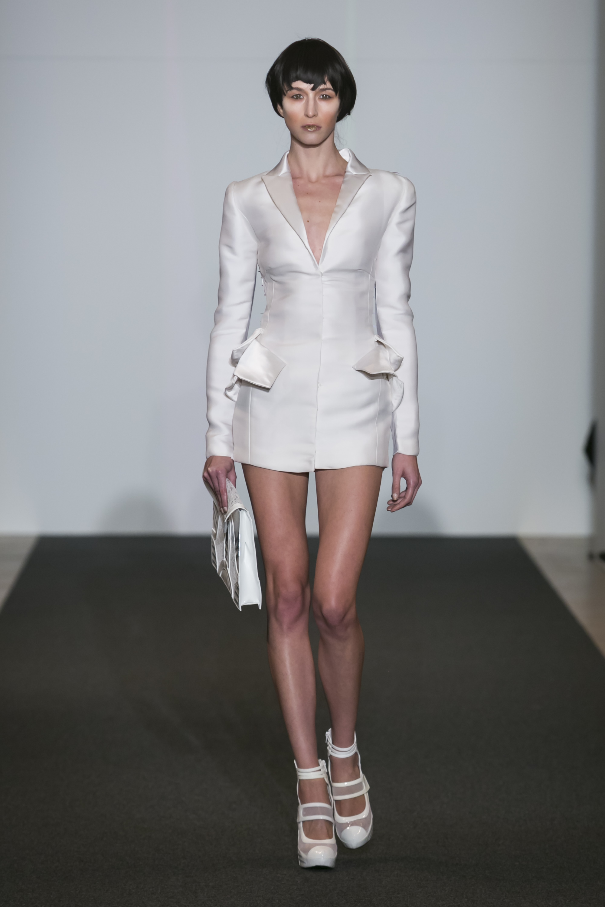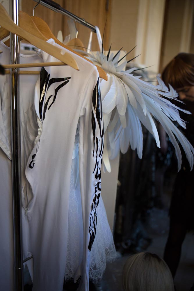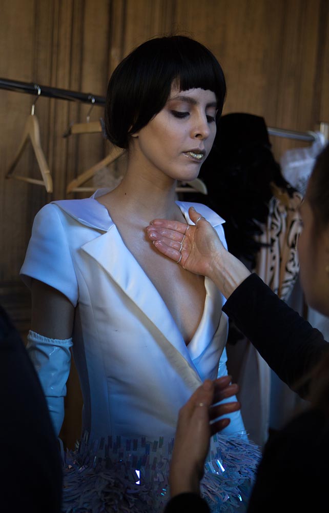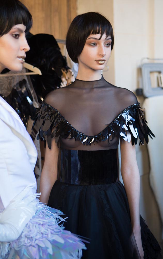 Galons frissonnants et pétales abstraites de rhodoïd ponctuent cette collection aux formes futuristes et aux mouvements intemporels. La douceur de la soie, la dentelle évaporée et les plumes délicates flottent dans un temps suspendu. A la manière d’une peinture surréaliste, les formes et les silhouettes s’opposent et se complètent.