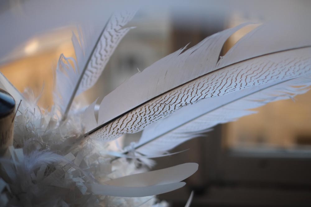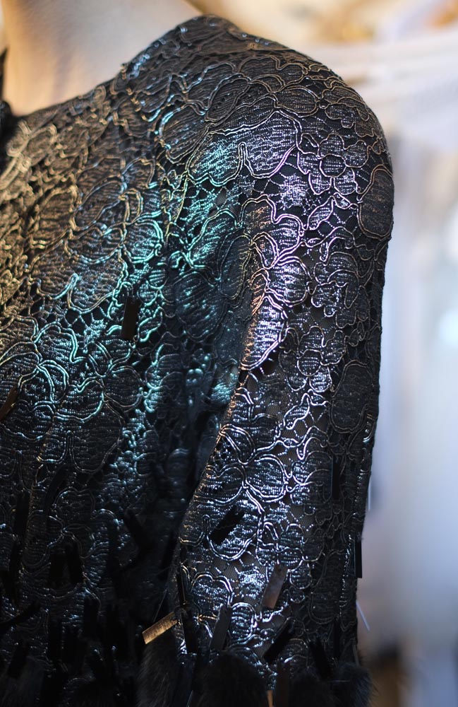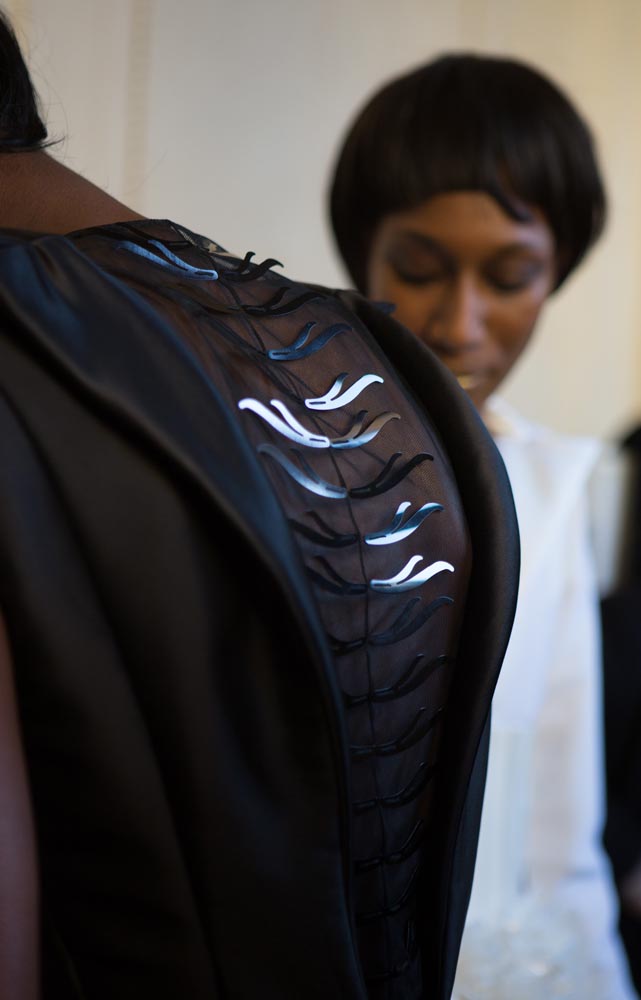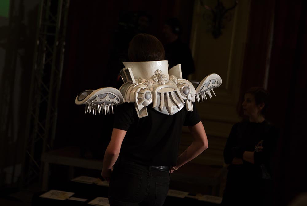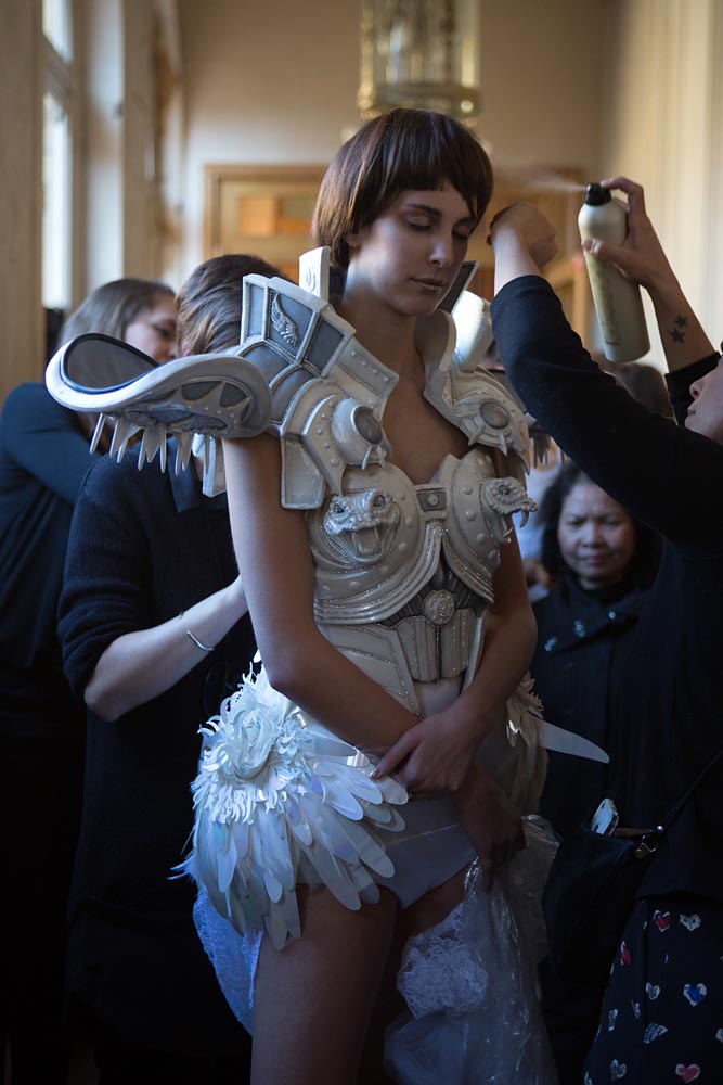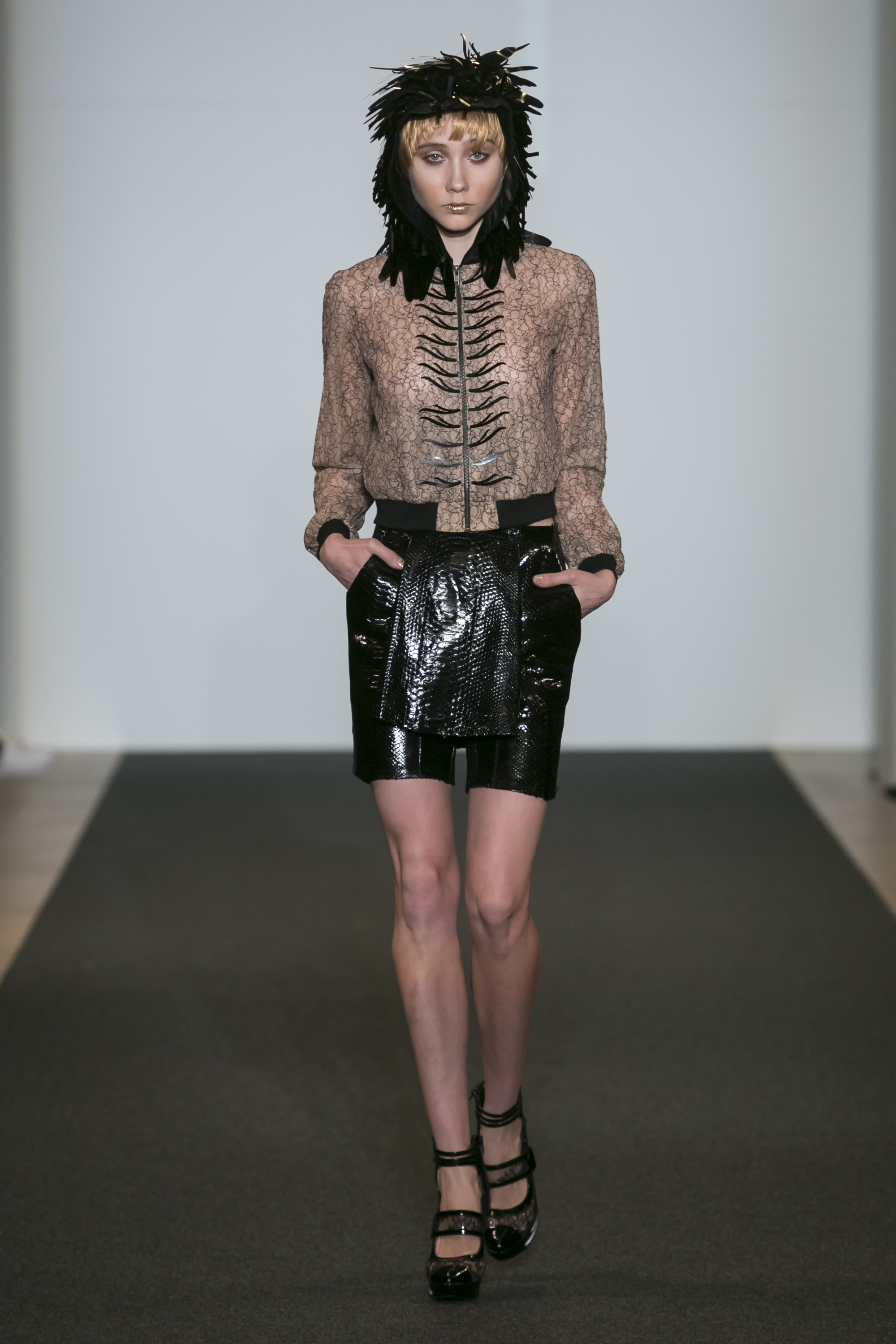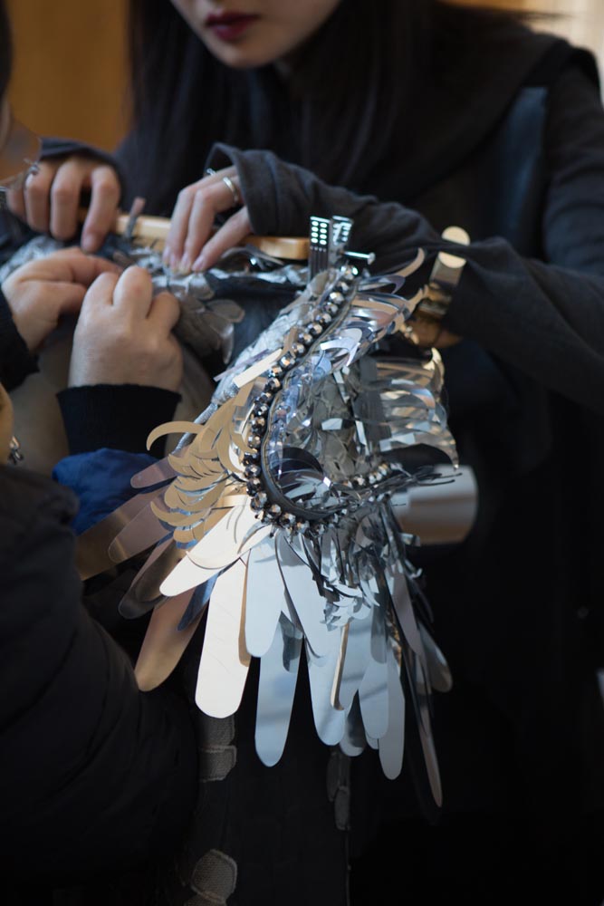 Galons frissonnants et pétales abstraites de rhodoïd ponctuent cette collection aux formes futuristes et aux mouvements intemporels. La douceur de la soie, la dentelle évaporée et les plumes délicates flottent dans un temps suspendu. A la manière d’une peinture surréaliste, les formes et les silhouettes s’opposent et se complètent.