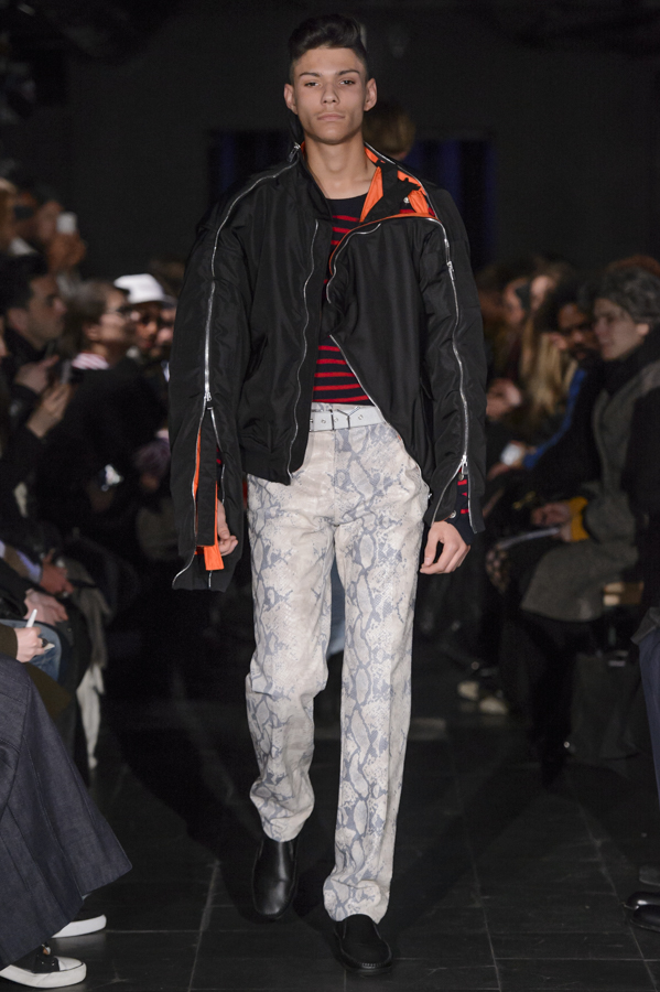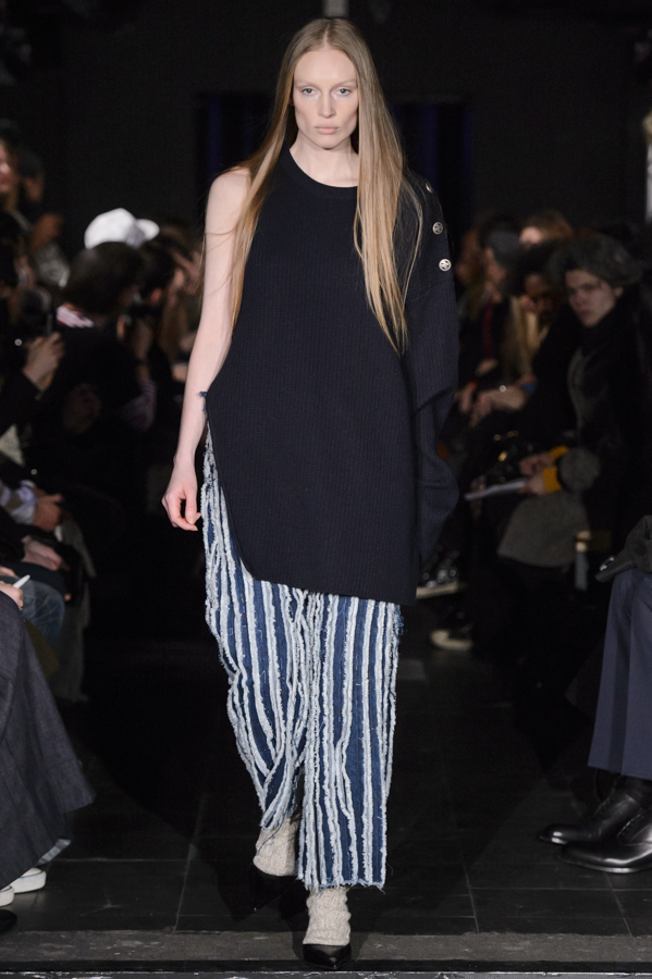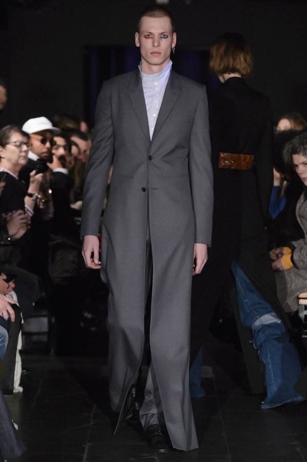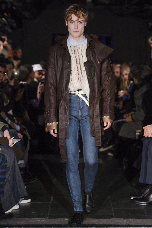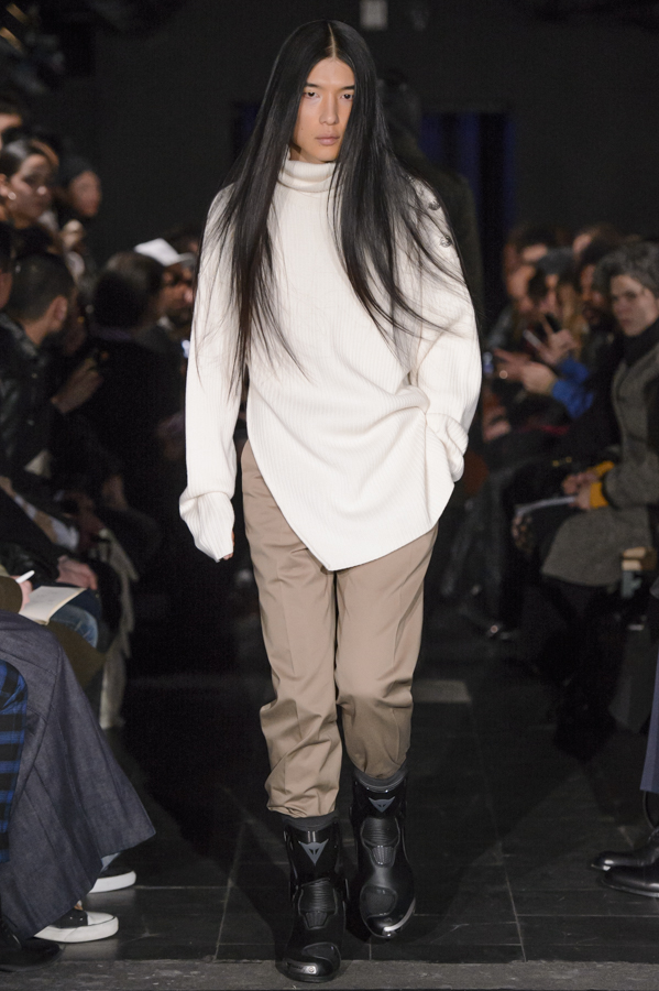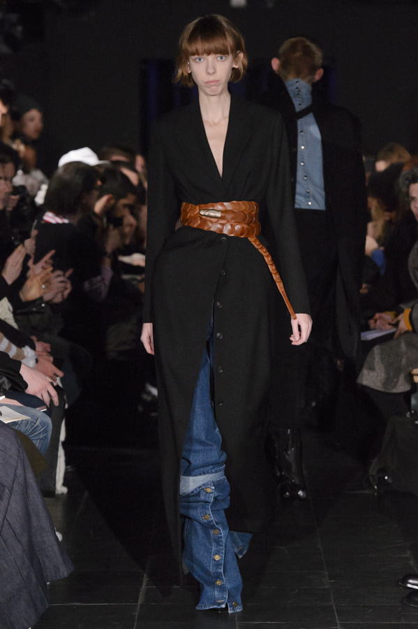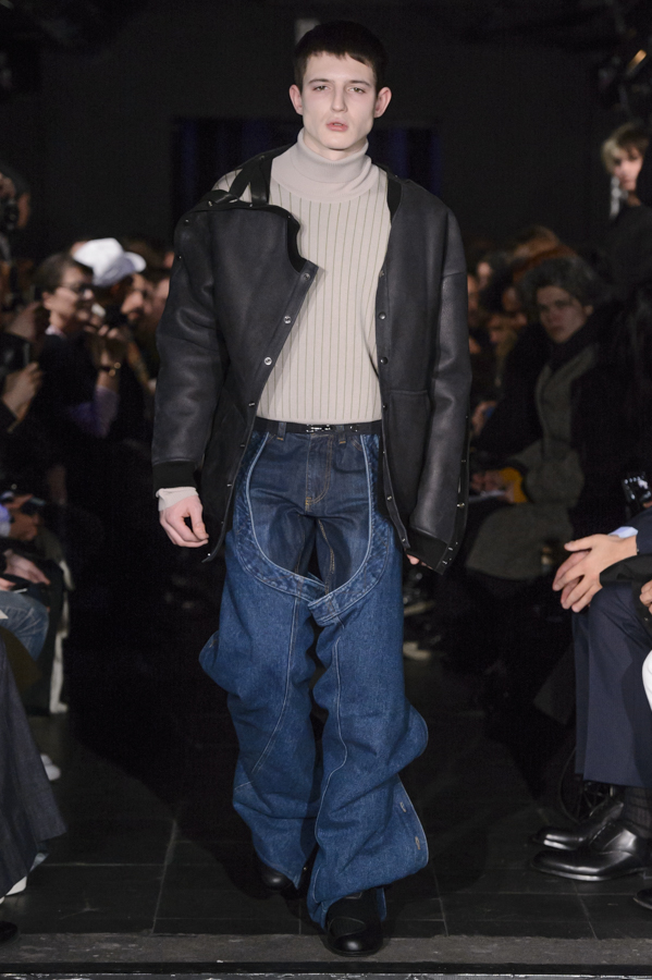 Glenn Martens, aux commandes d’Y/Project depuis 2013 a su imposer pour cette collection sa vision, mélange de plusieurs influences : un peu néo-gothique, grunge, moyenâgeux, sportswear et punk. Le show sur fond de musique métal mettait en scène des mannequins aux looks affirmés, féroces. Les pièces phares de la collection sont les jeans, qui se font extra-longs, slim ou cowboy. Les vestes et manteaux sont quant à eux soit en cuir façon grand perfecto, soit droits dans une forme beaucoup plus classique, soit façon bomber avec de longs zips sur les manches.