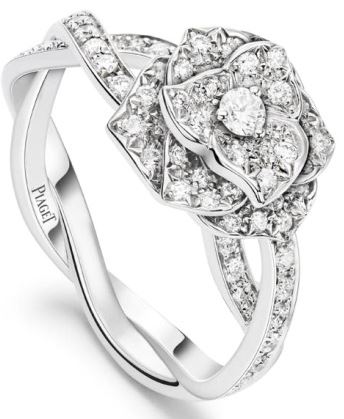 La bague en or blanc Piaget rose, toujours changeante dans sa beauté naturelle s’enroule avec passion autour du doigt, épanouissant ses 71 diamants taille brillant et donnant vie à l’intense émotion qui unit deux amants.