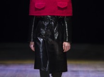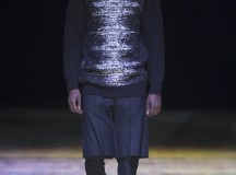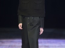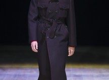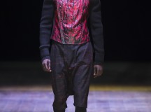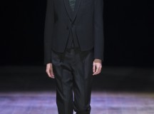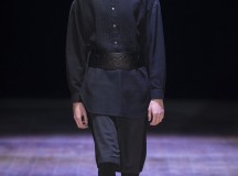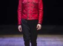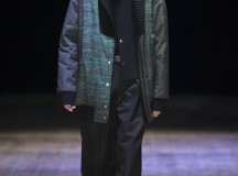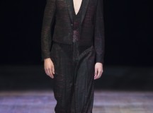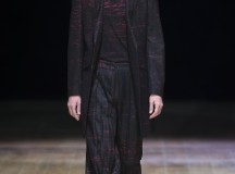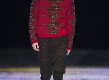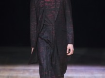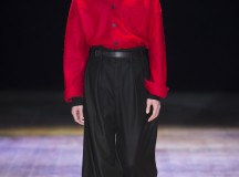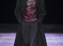 La collection nous a donné l’image d’un samouraï des temps modernes : les silhouettes sont amples mais élégantes, avec de longs manteaux enveloppants, des pantalons extra-larges, des pantacourts portés sur des collants noirs, des trenchs, des blazers, des cols roulés. La couleur dominante de la collection est le noir associé à une couleur plus vive : du rouge vermillon (couleur phare de la collection, le nom du défilé est d’ailleurs « Vermilion Hue »), du bleu foncé, du vert sapin et du violet. On retrouve également des tenues entièrement en gris et en noir.