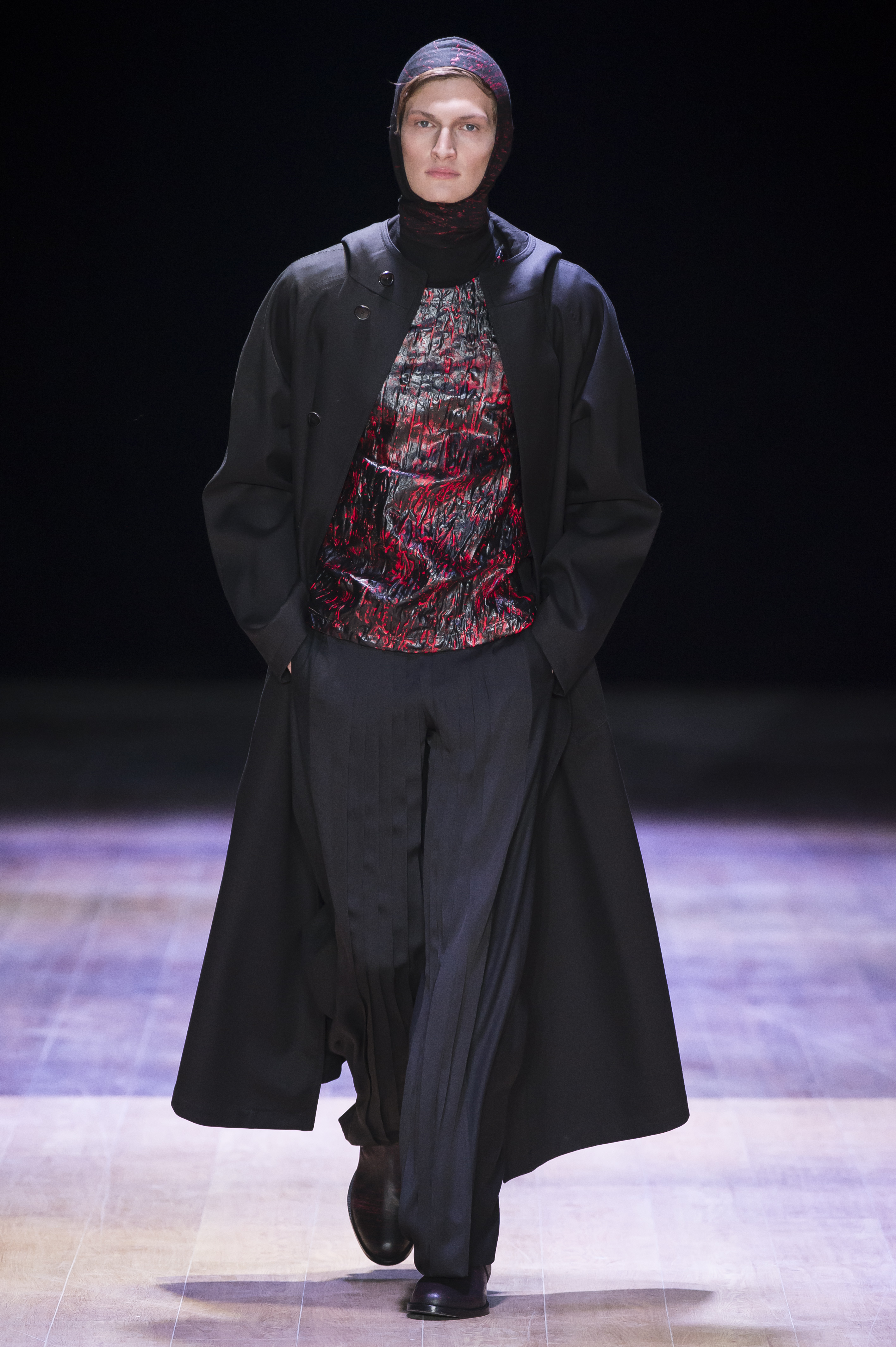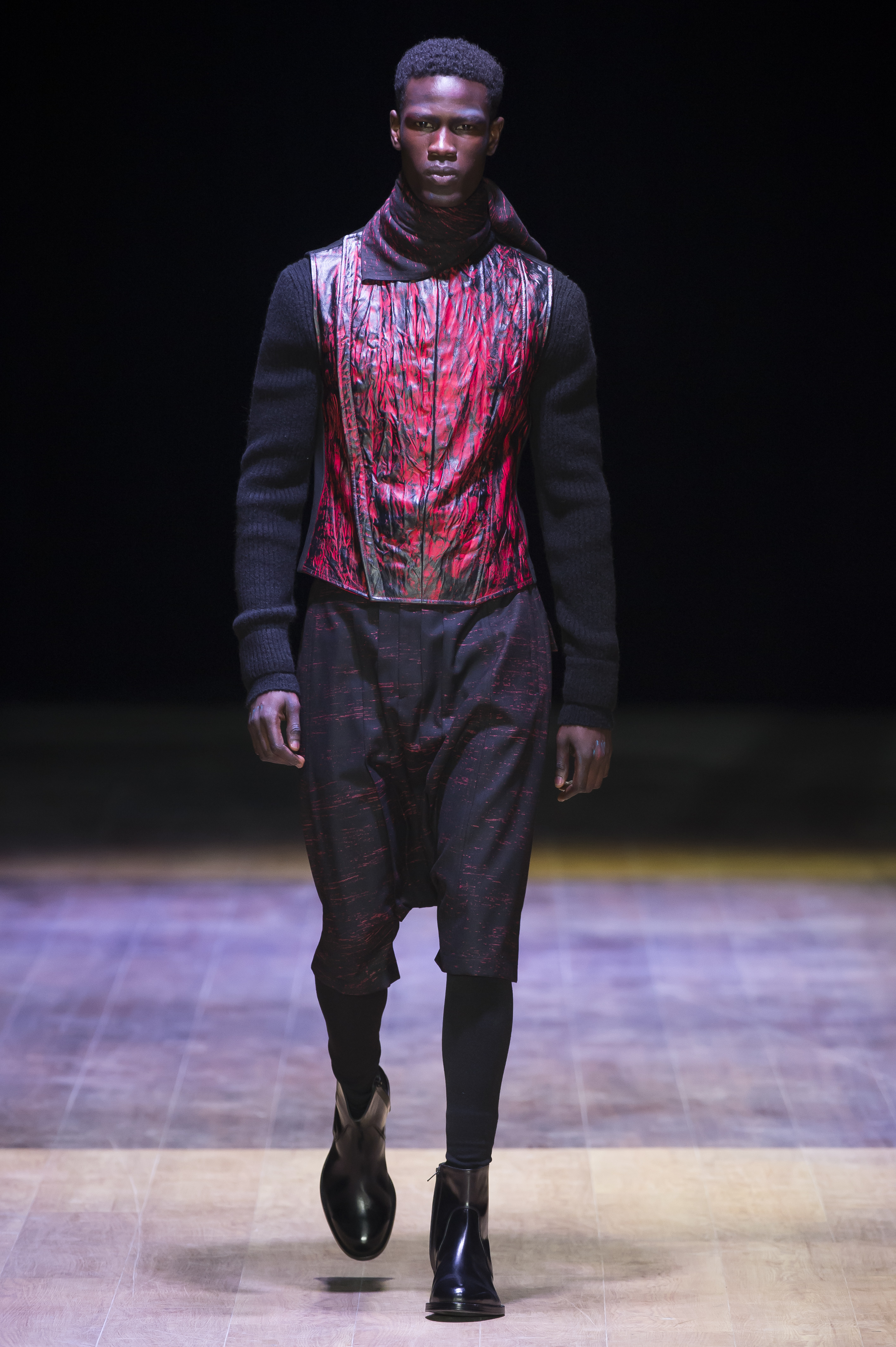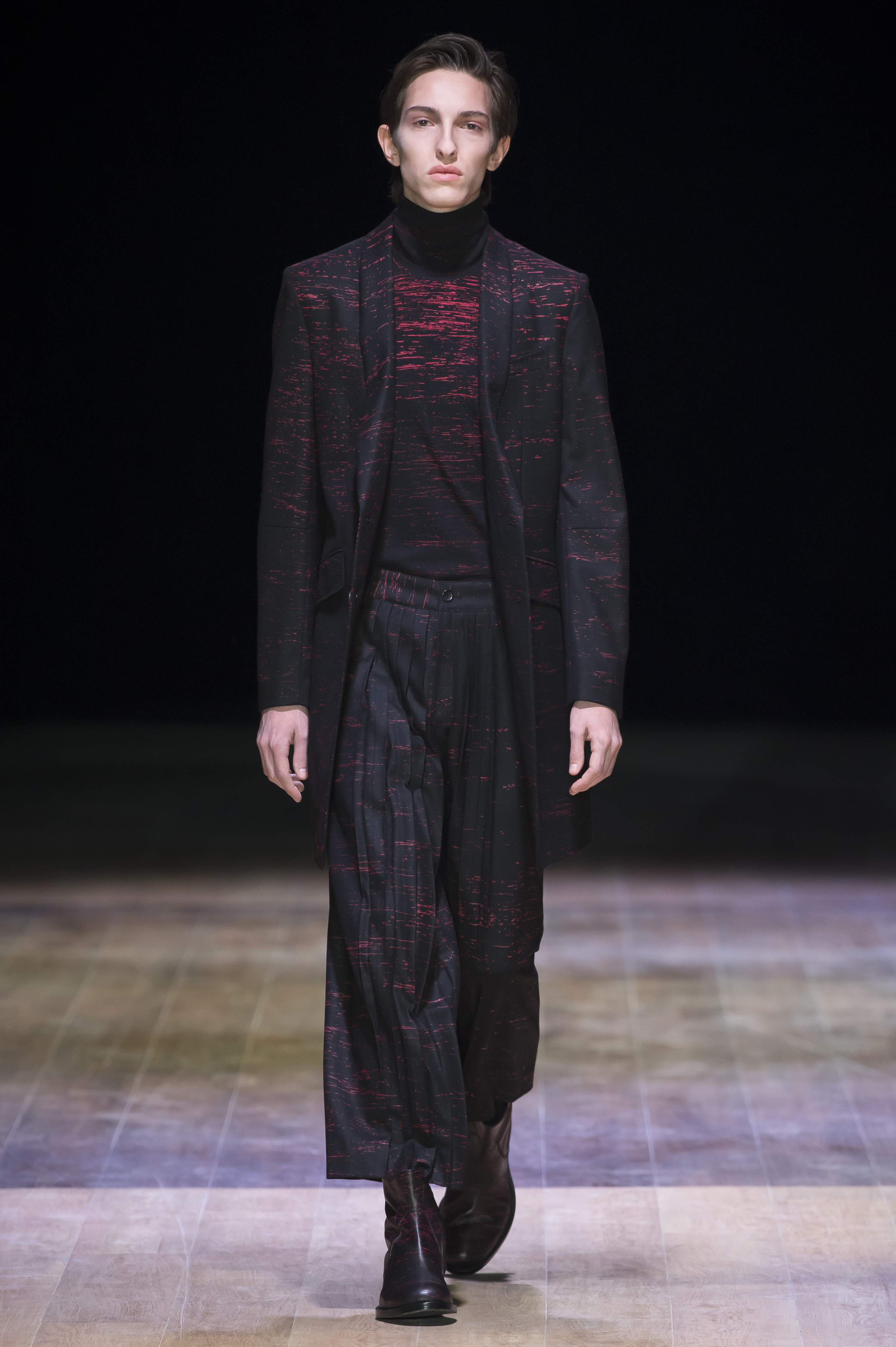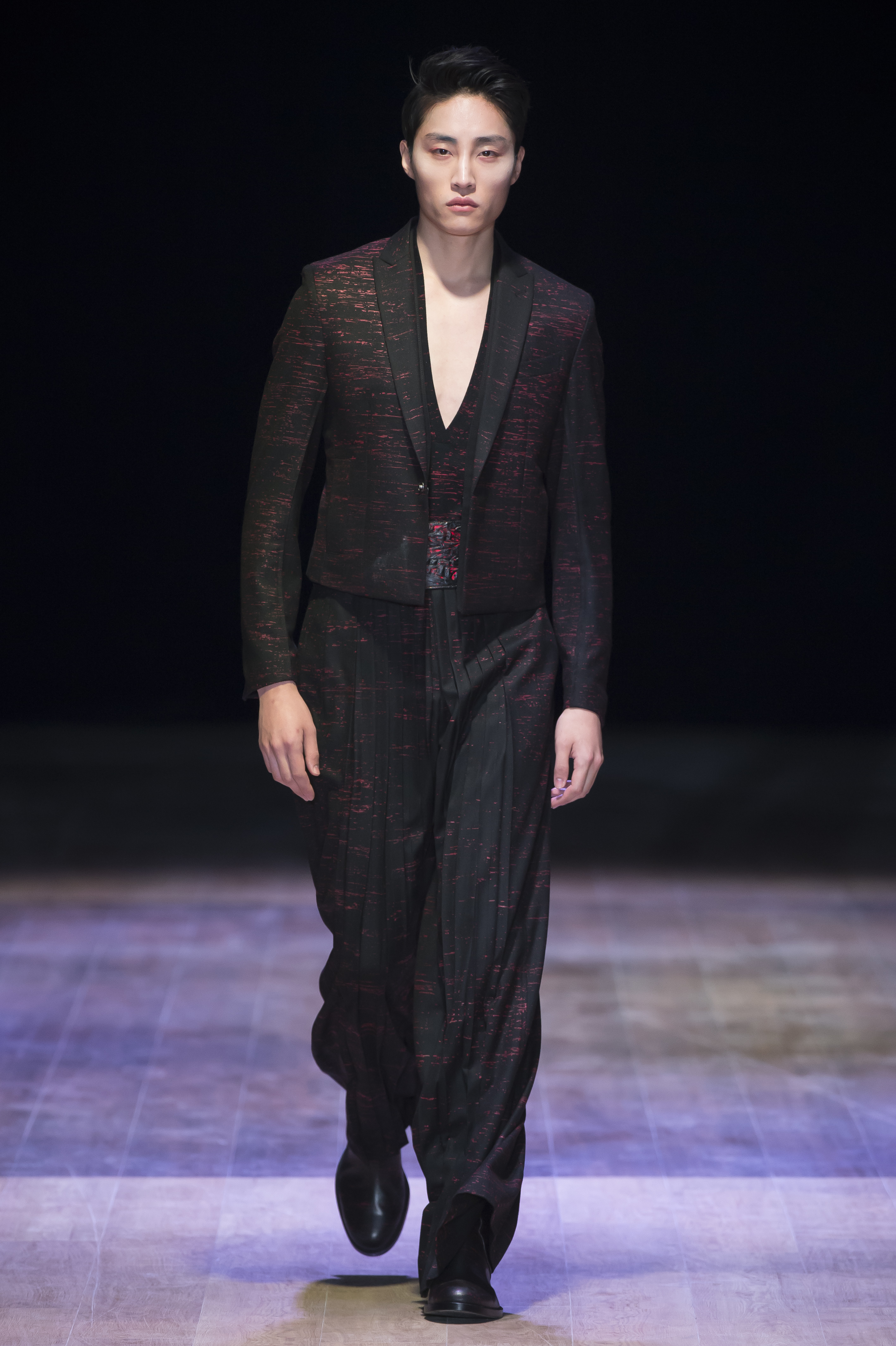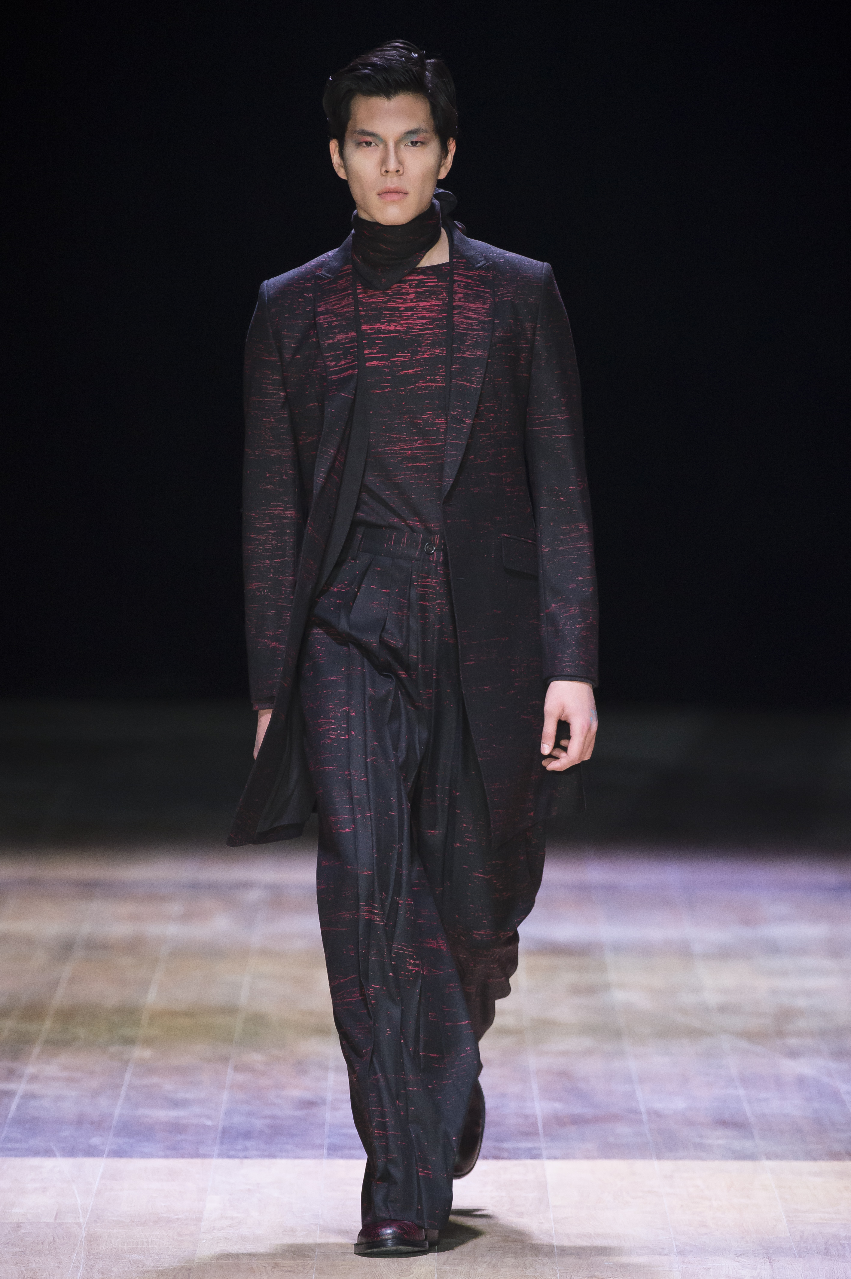 La collection nous a donné l’image d’un samouraï des temps modernes : les silhouettes sont amples mais élégantes, avec de longs manteaux enveloppants, des pantalons extra-larges, des pantacourts portés sur des collants noirs, des trenchs, des blazers, des cols roulés. La couleur dominante de la collection est le noir associé à une couleur plus vive : du rouge vermillon (couleur phare de la collection, le nom du défilé est d’ailleurs « Vermilion Hue »), du bleu foncé, du vert sapin et du violet. On retrouve également des tenues entièrement en gris et en noir.