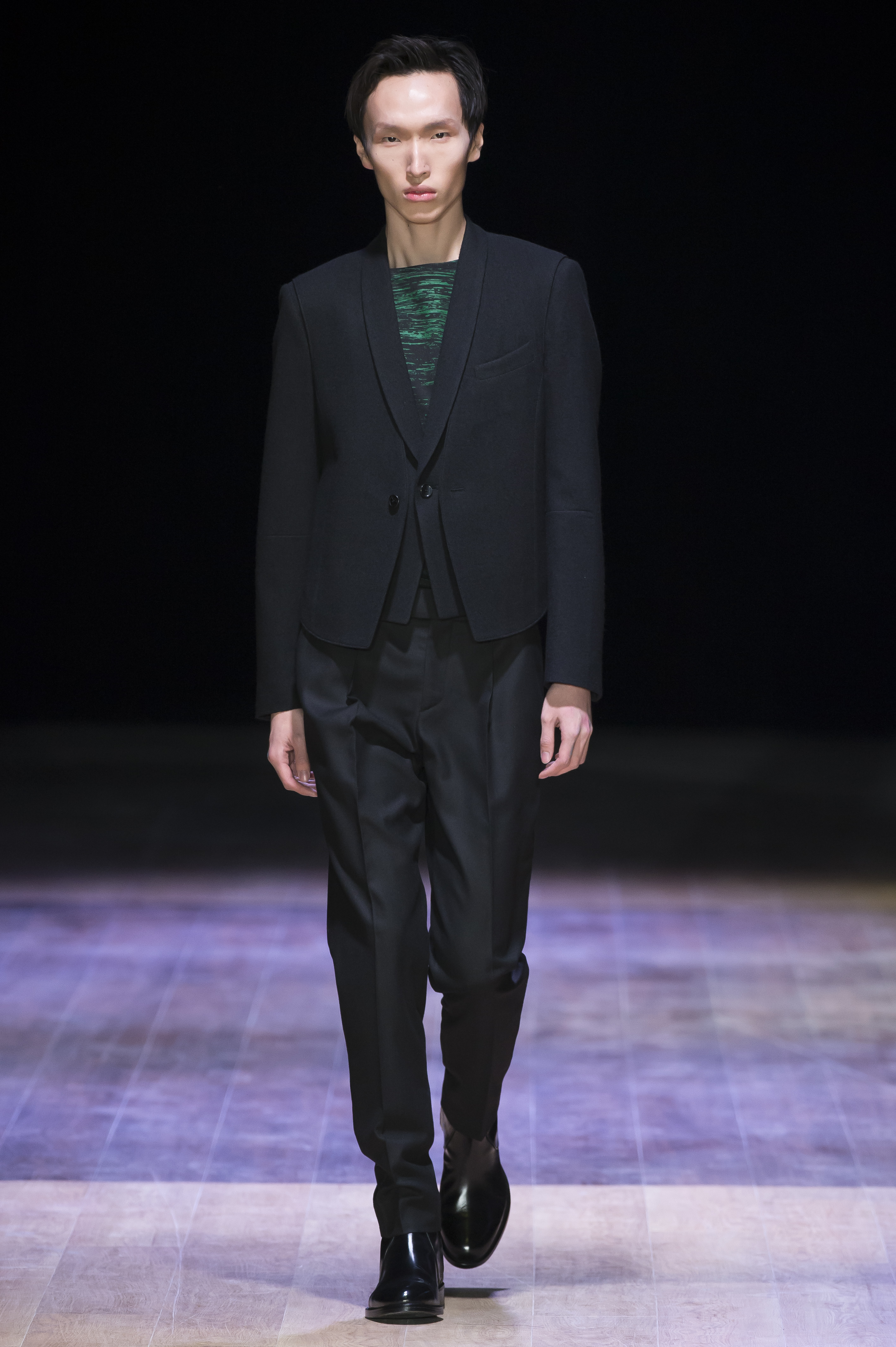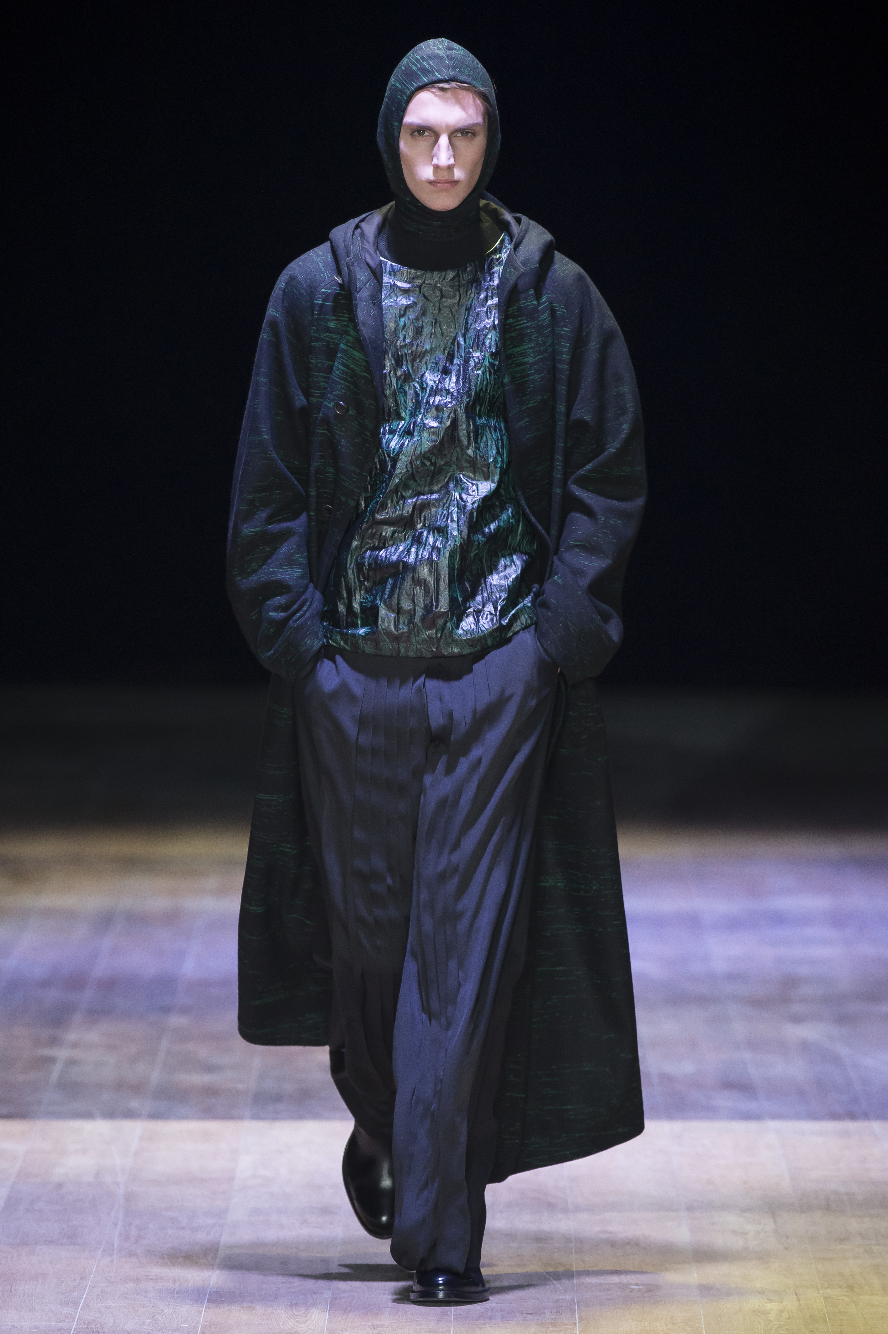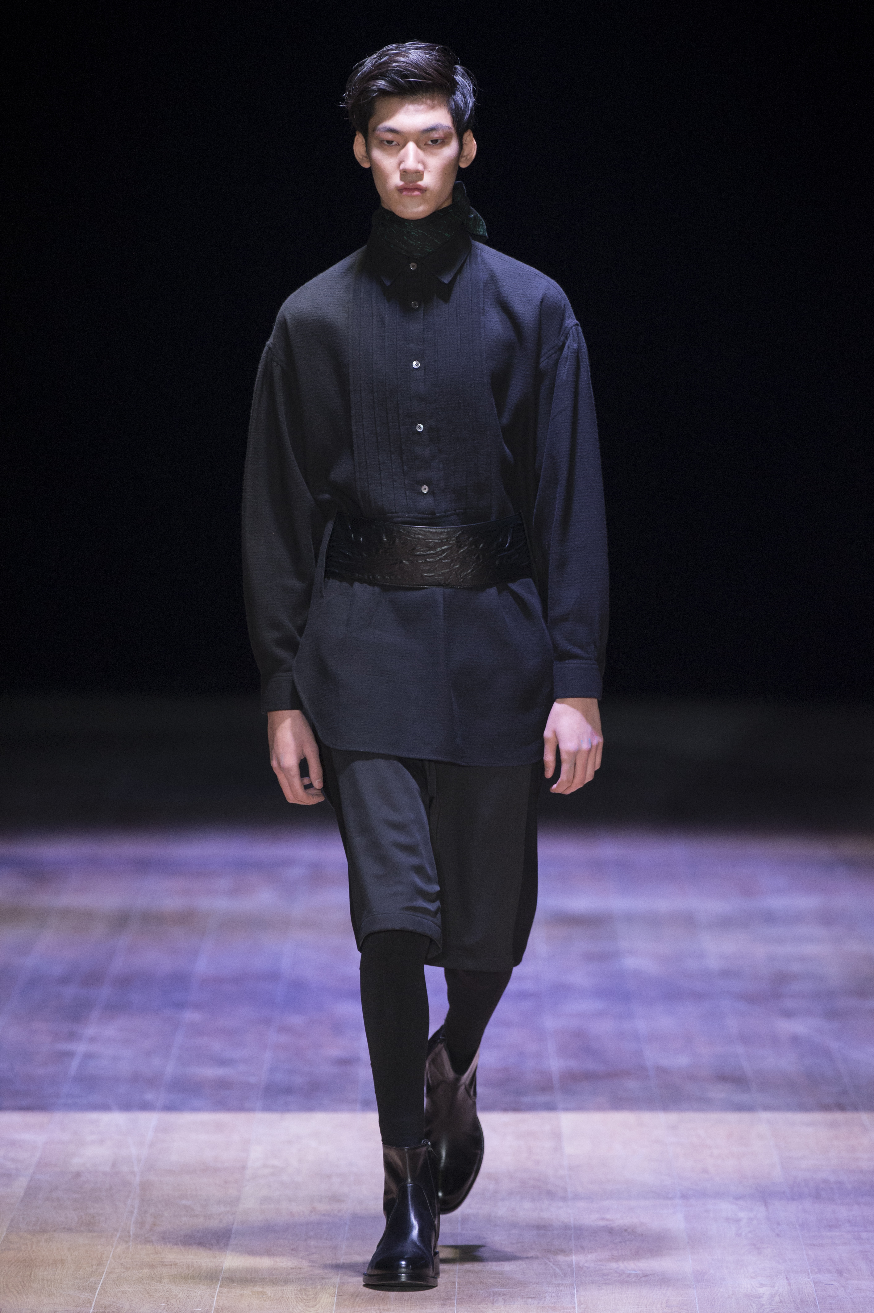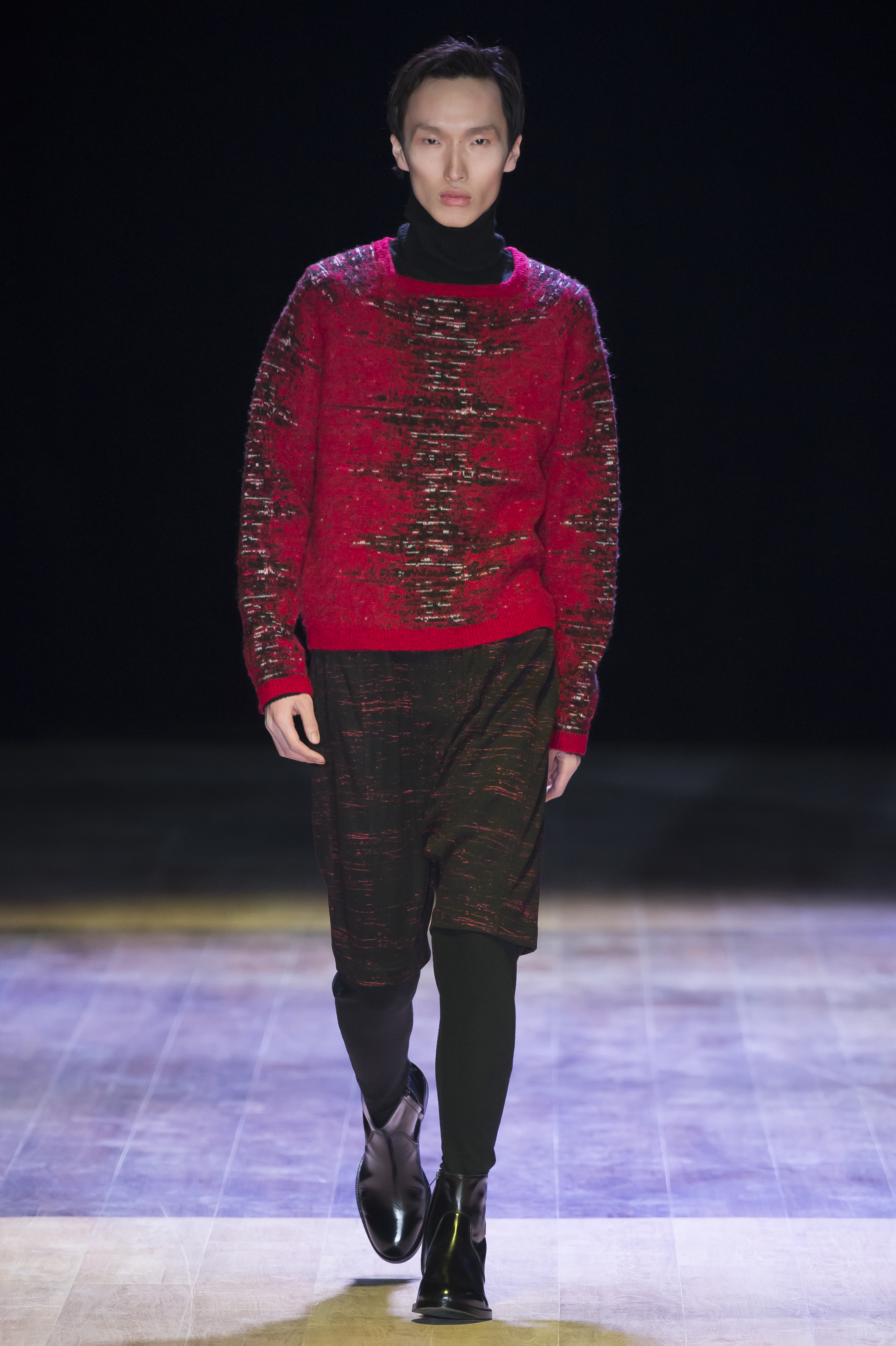 La collection nous a donné l’image d’un samouraï des temps modernes : les silhouettes sont amples mais élégantes, avec de longs manteaux enveloppants, des pantalons extra-larges, des pantacourts portés sur des collants noirs, des trenchs, des blazers, des cols roulés. La couleur dominante de la collection est le noir associé à une couleur plus vive : du rouge vermillon (couleur phare de la collection, le nom du défilé est d’ailleurs « Vermilion Hue »), du bleu foncé, du vert sapin et du violet. On retrouve également des tenues entièrement en gris et en noir.