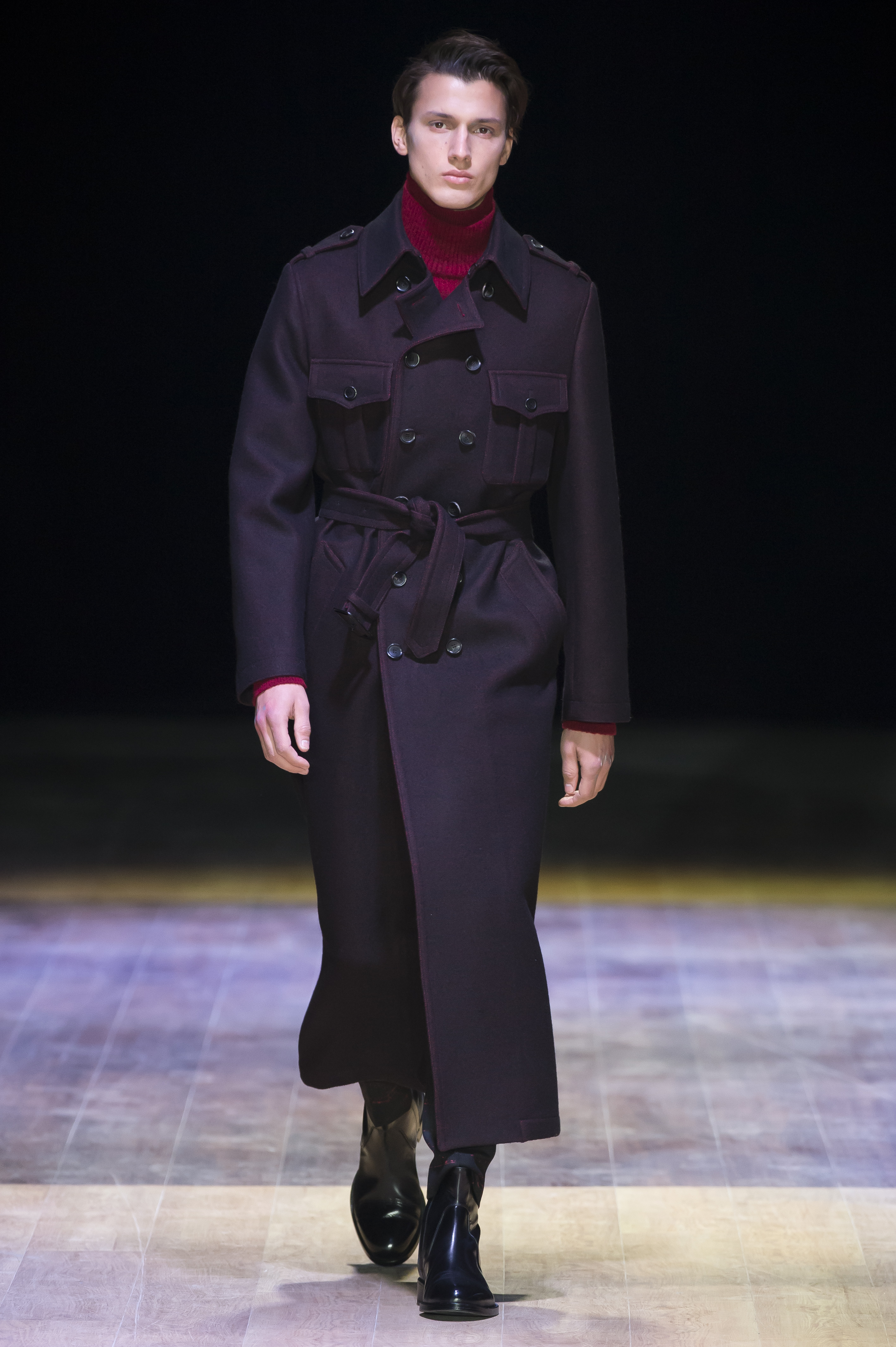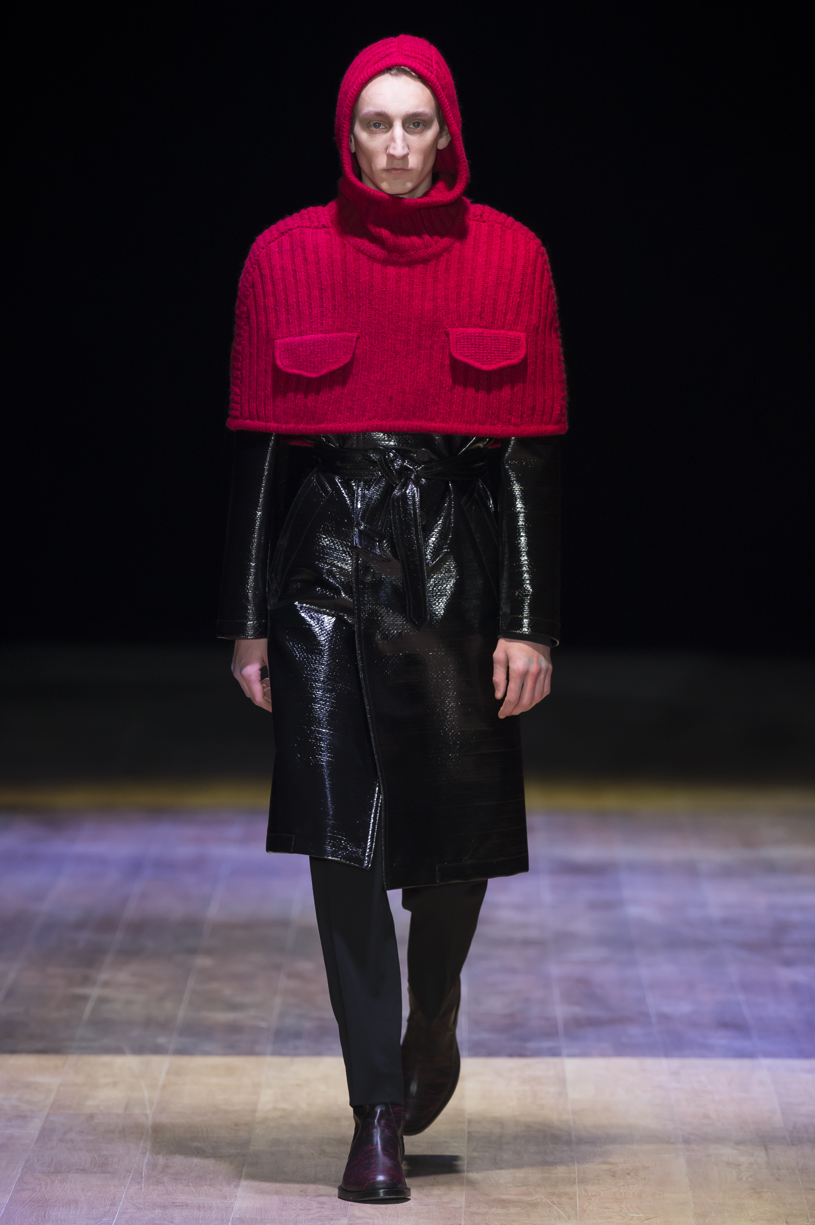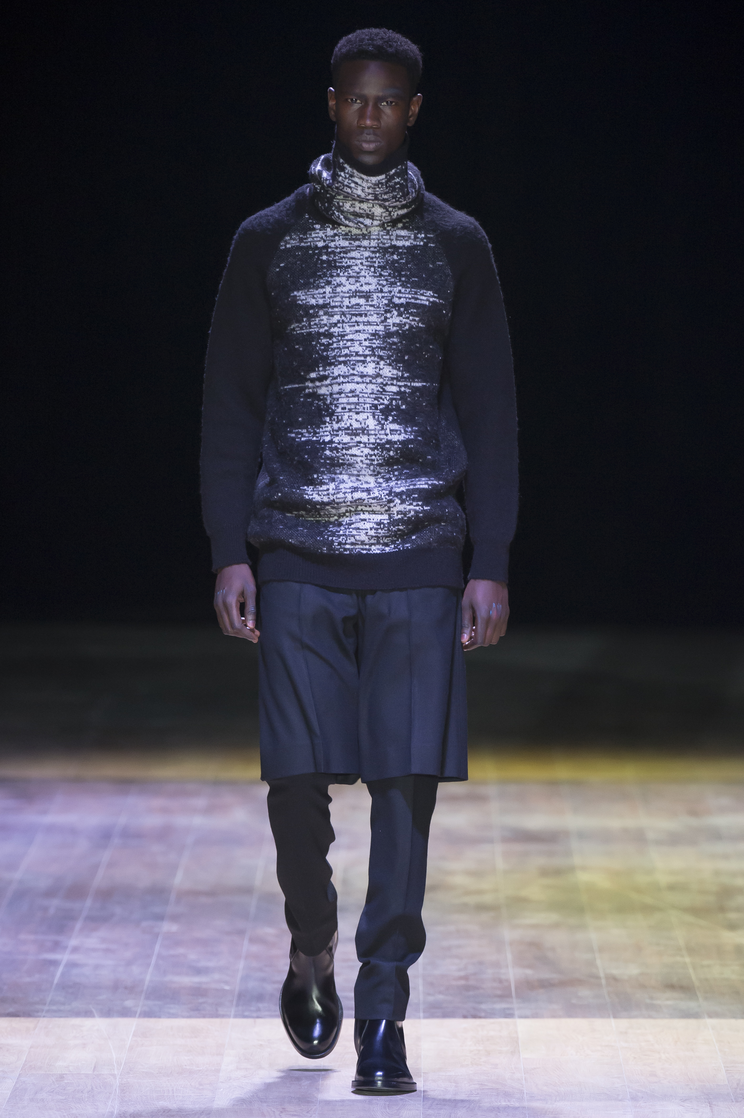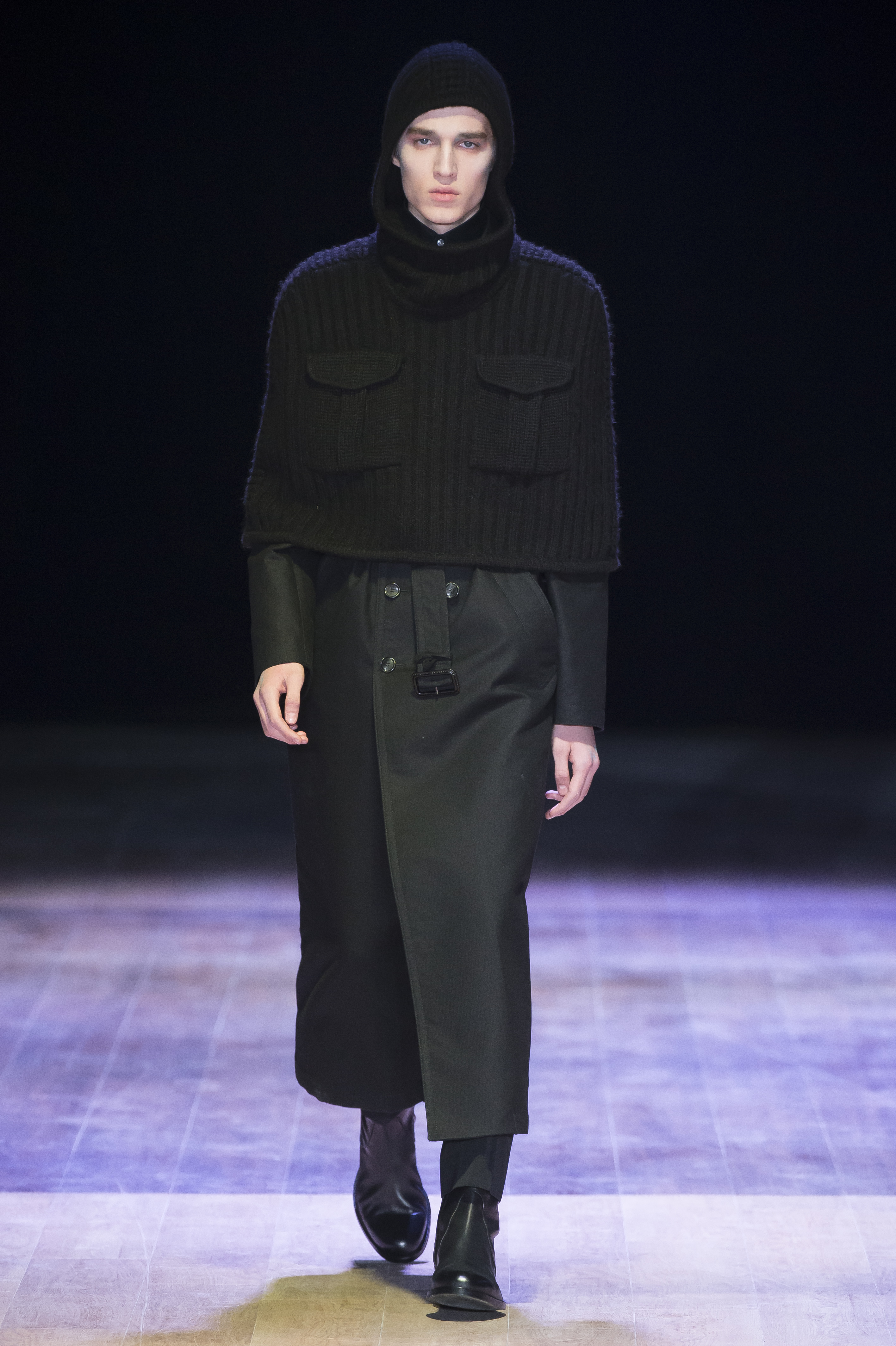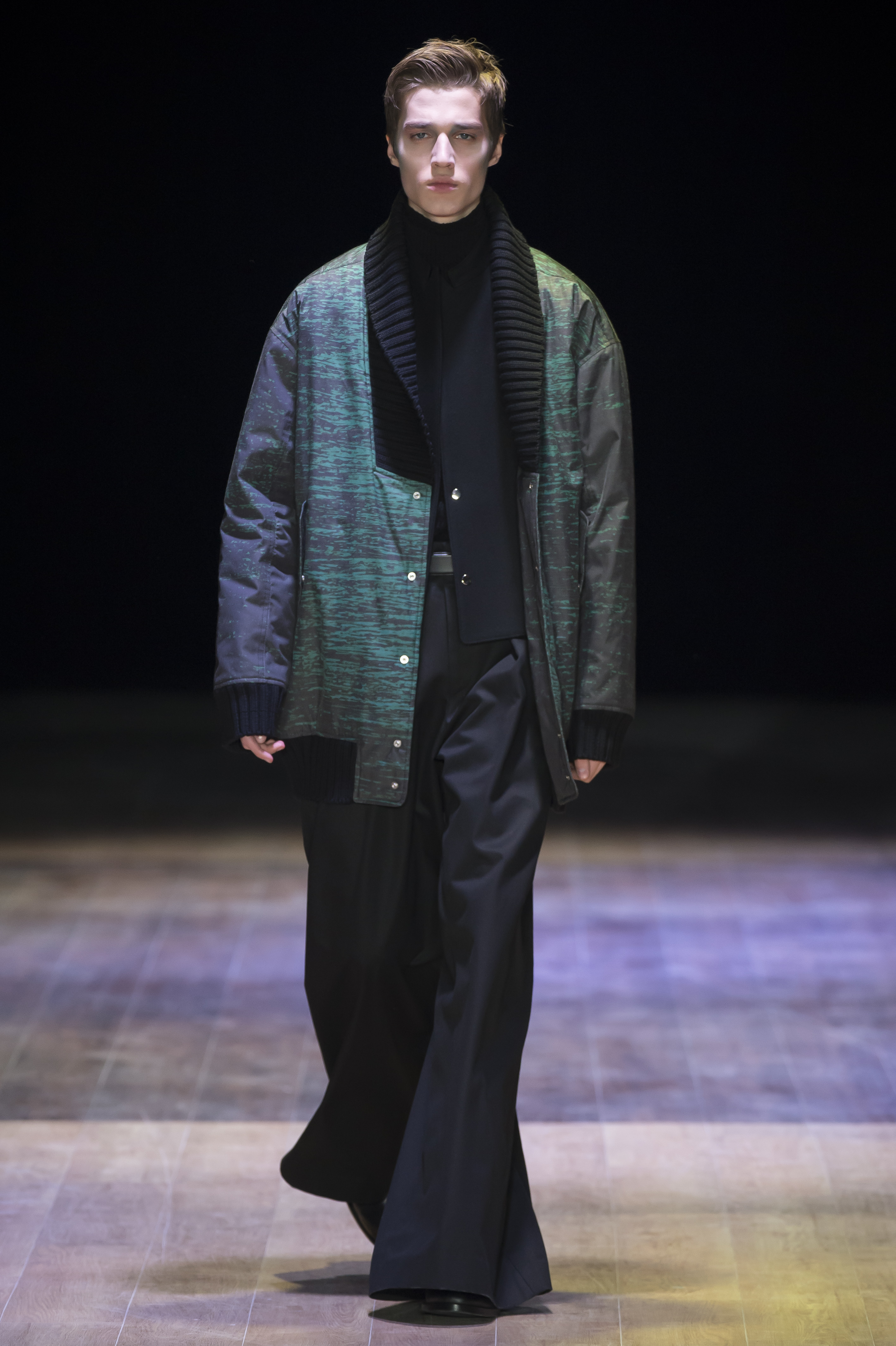 La collection nous a donné l’image d’un samouraï des temps modernes : les silhouettes sont amples mais élégantes, avec de longs manteaux enveloppants, des pantalons extra-larges, des pantacourts portés sur des collants noirs, des trenchs, des blazers, des cols roulés. La couleur dominante de la collection est le noir associé à une couleur plus vive : du rouge vermillon (couleur phare de la collection, le nom du défilé est d’ailleurs « Vermilion Hue »), du bleu foncé, du vert sapin et du violet. On retrouve également des tenues entièrement en gris et en noir.