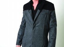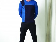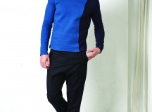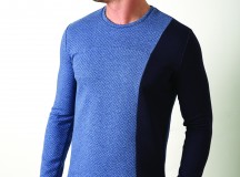 Toujours une marque 100% française « Made In France », Sébastien Blondin travaille exclusivement avec des tissus français et italiens. On retrouve au niveau des matières de la laine (au toucher cashmere), un damassé de carrés qui contrastent avec le velours de rectangles, on retrouve également de la popeline de coton, des jerseys de cotons satinés en fil d’Écosse qui apportent de la luminosité. Les motifs et les mailles jouent les effets géométriques : piqués, pixels, carrés, rectangles, alvéoles, hexagones, losanges apportent du relief face aux néoprènes lisses.