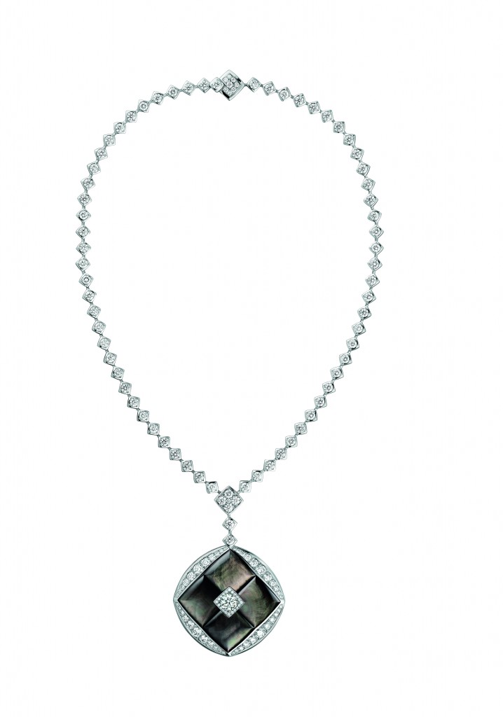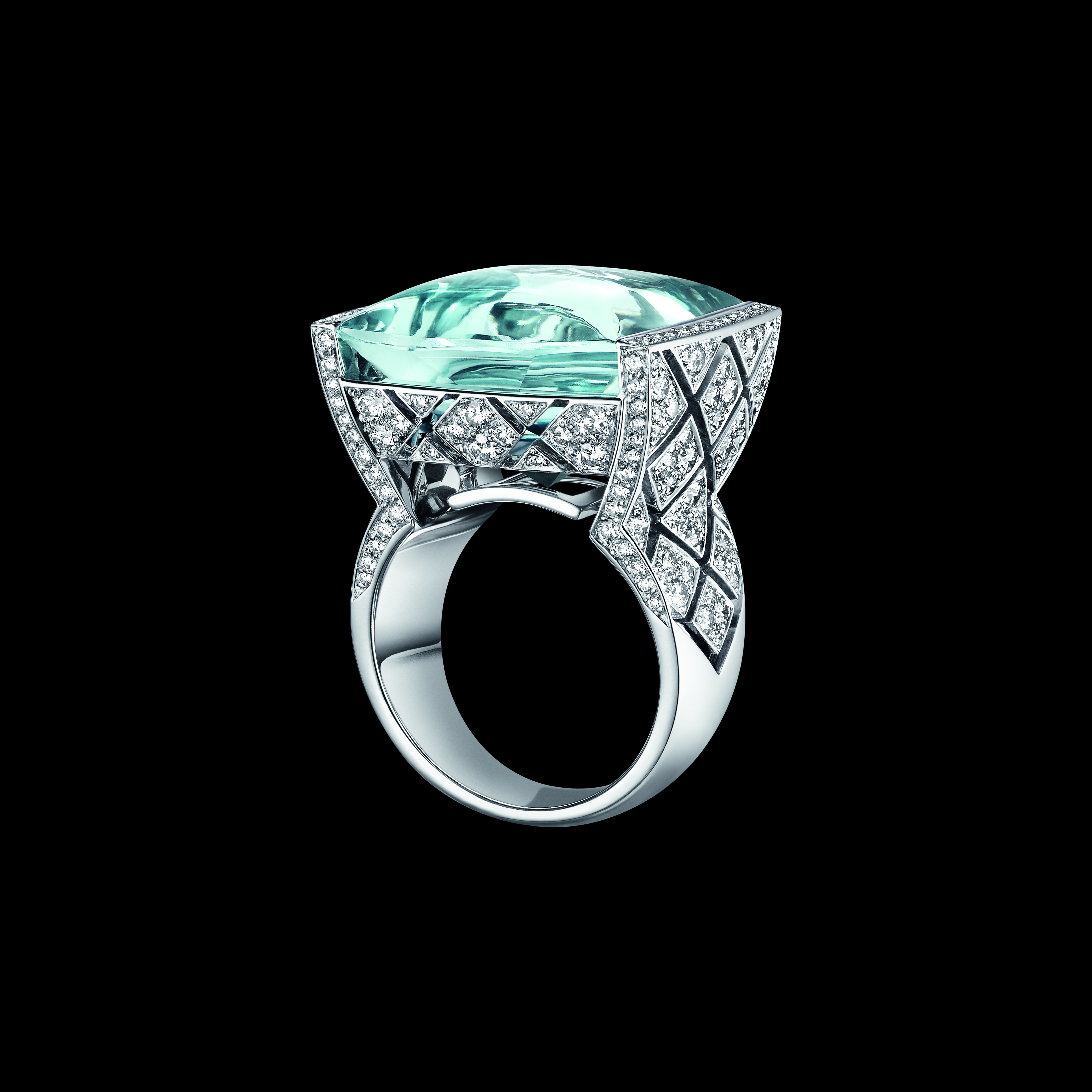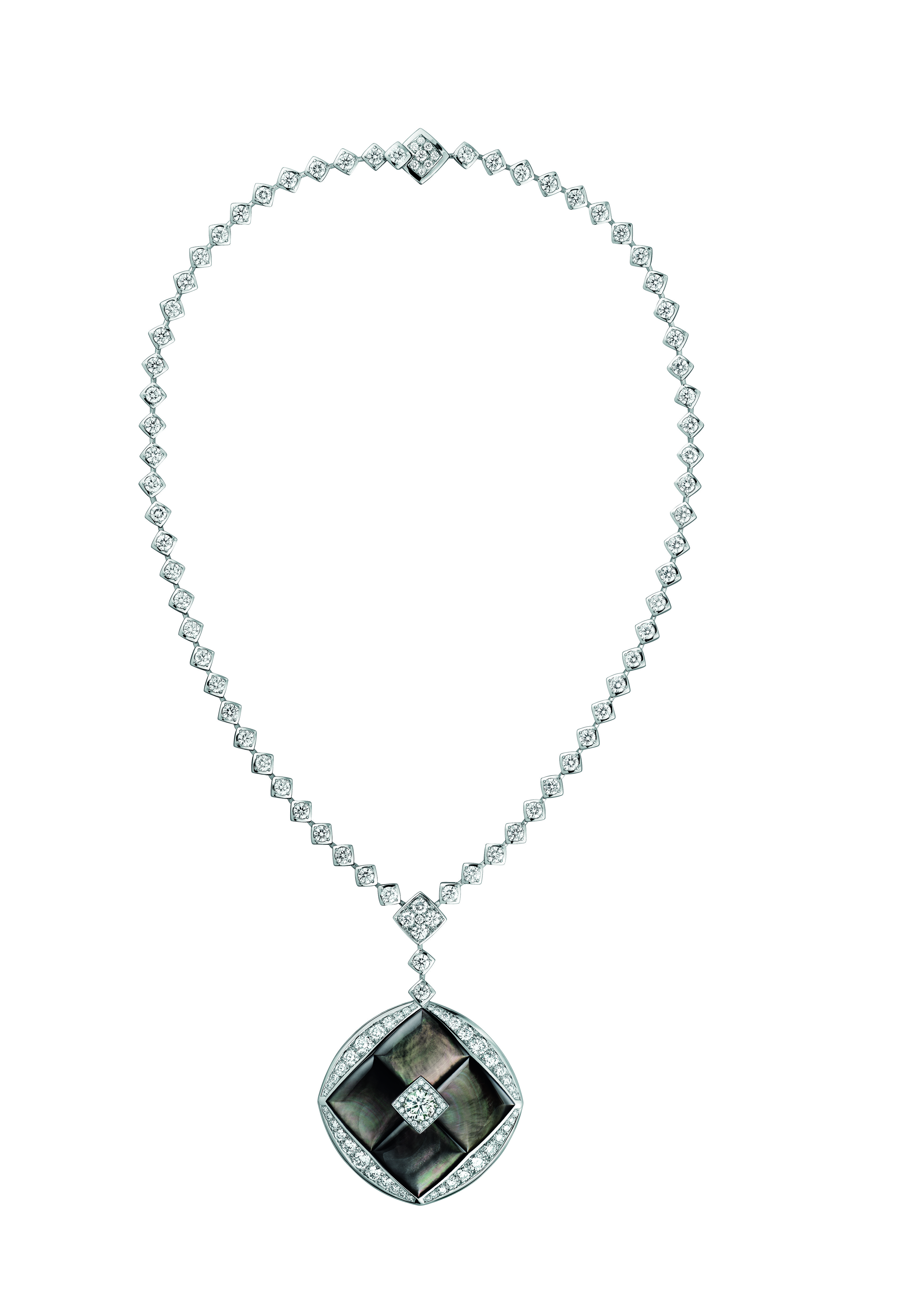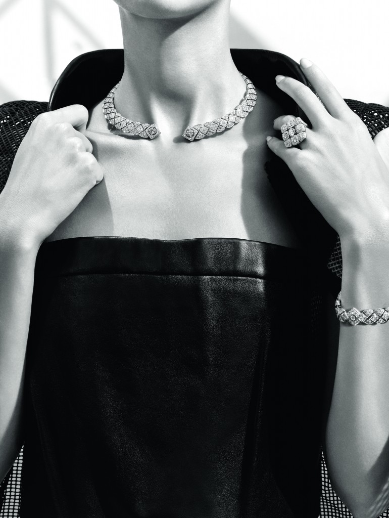 La collection se caractérise par la pureté de ses lignes et par la finesse des matériaux utilisés : des saphirs, des diamants, des aigues-marines, de l’or blanc, des perles, de la nacre grise et du cristal de roche qui viennent ainsi décliner le motif matelassé.