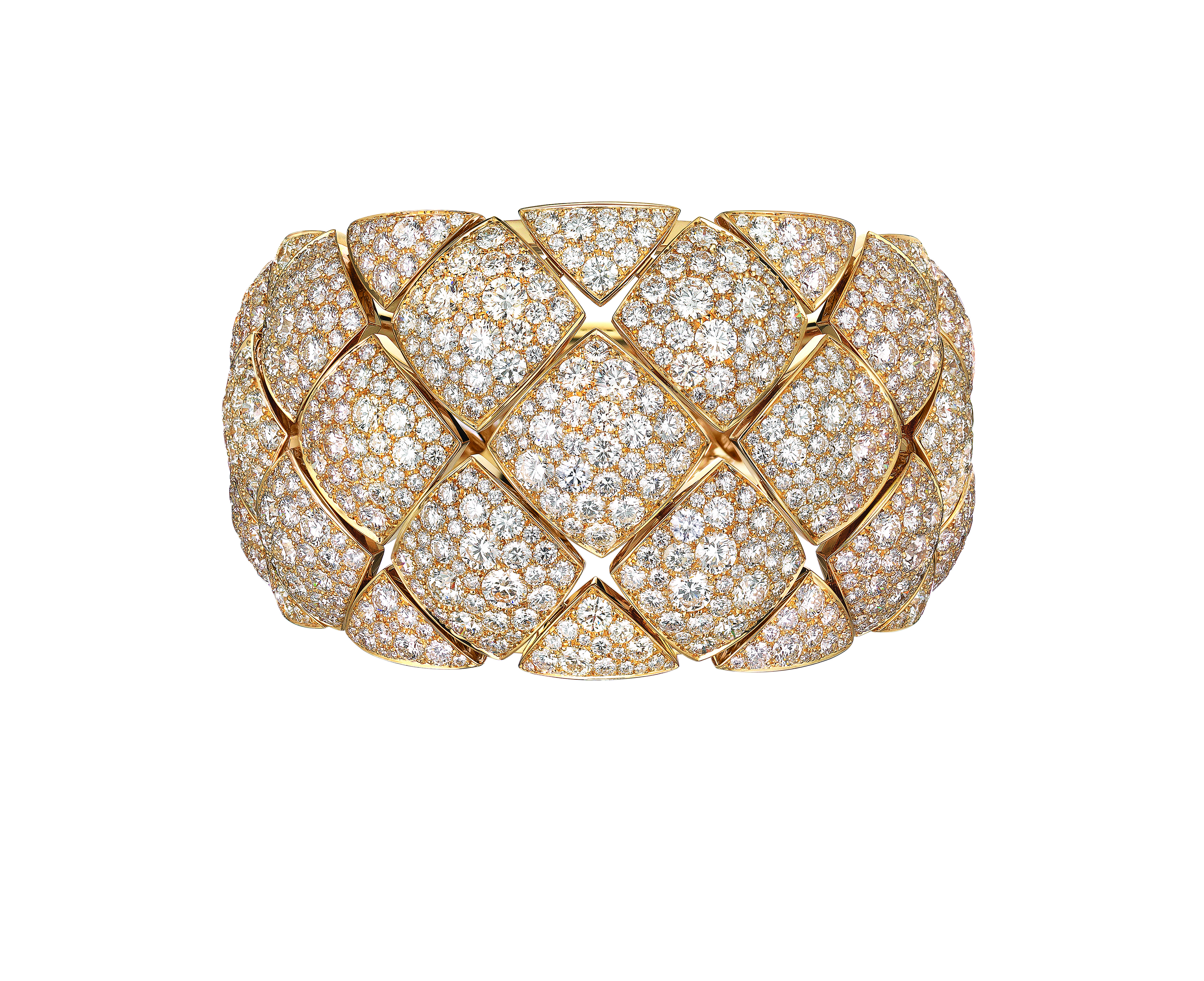 Manchette « Signature d’Or » en or jaune 18K serti de 1054 diamants taille brillant pour un poids total de 43,3 carats.