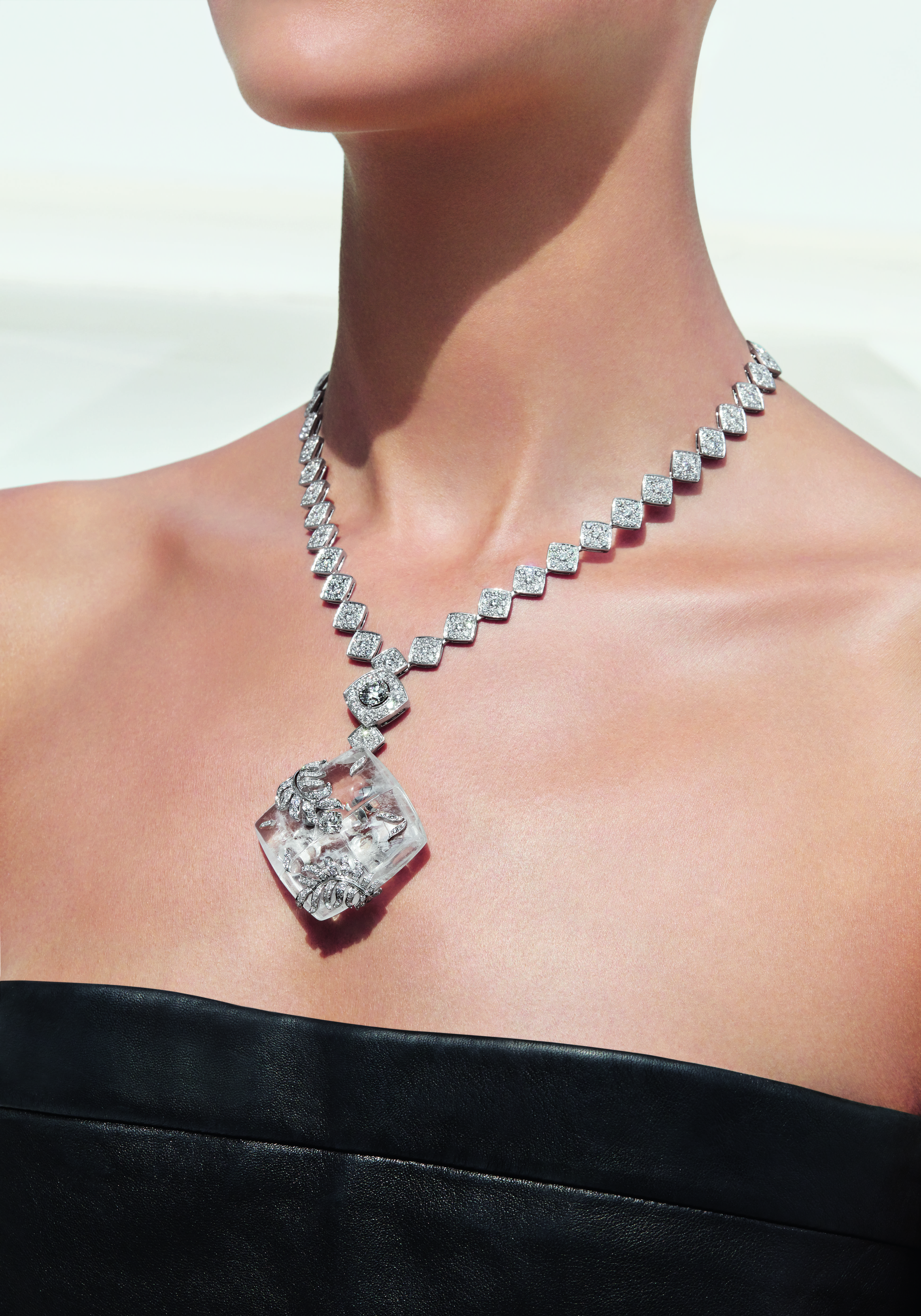 Collier « Signature Cocoon » en or blanc 18K serti d’un diamant taille brillant de 1,5 carat, 652 diamants taille brillant pour un poids total de 16,7 carats et cristal de roche sculpté.